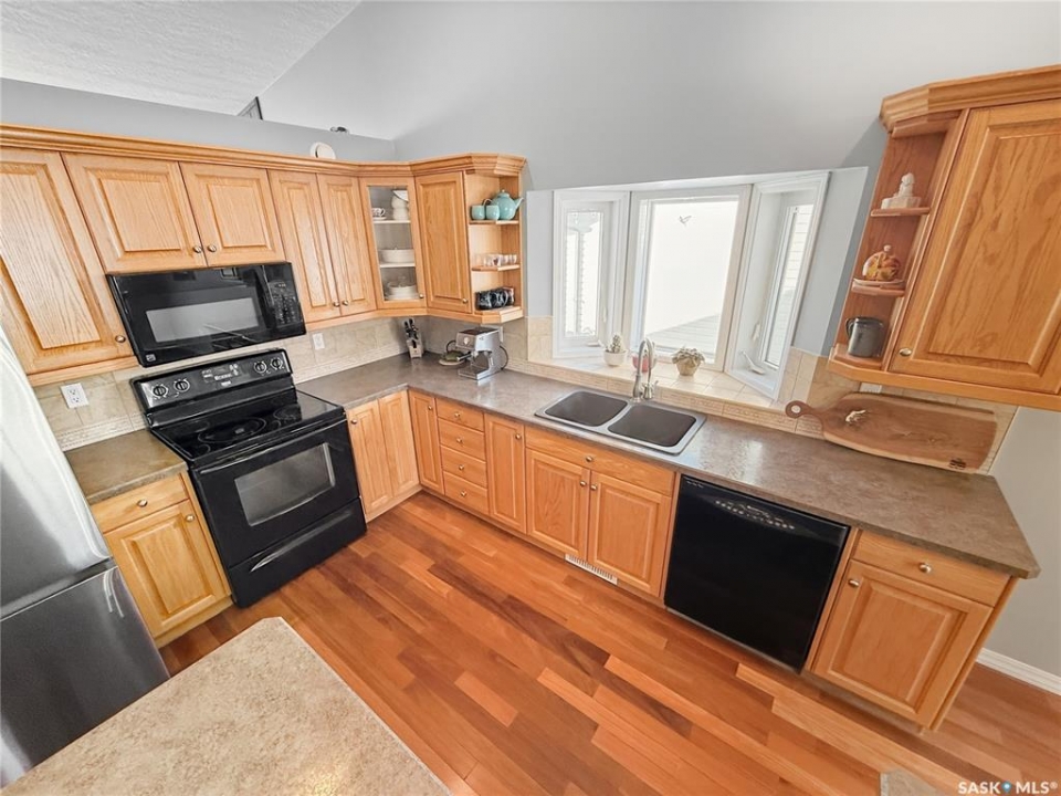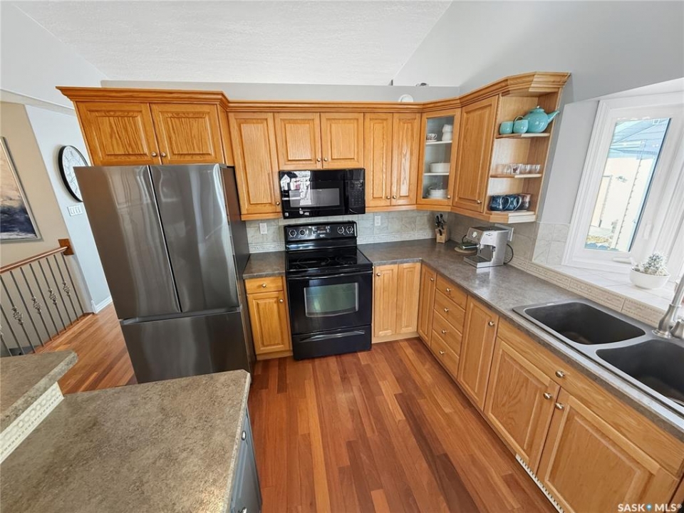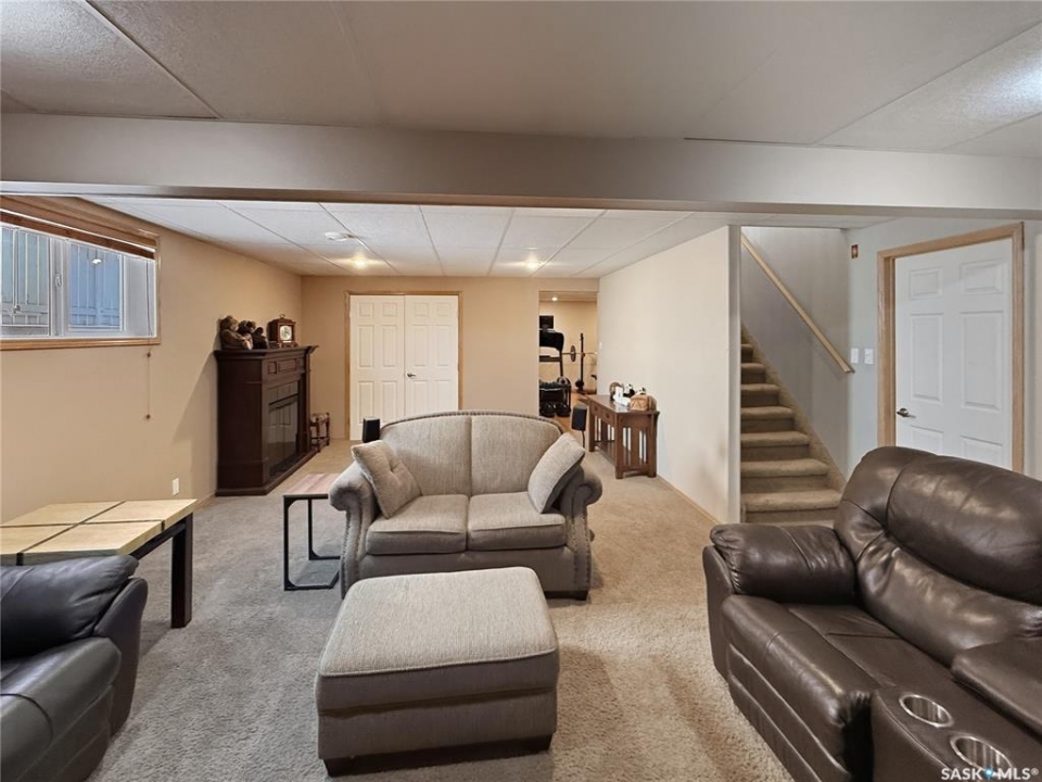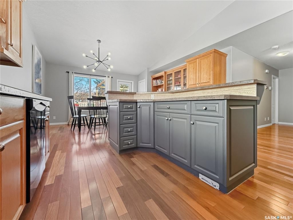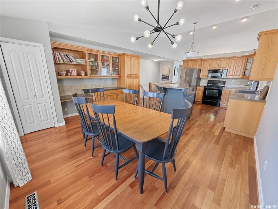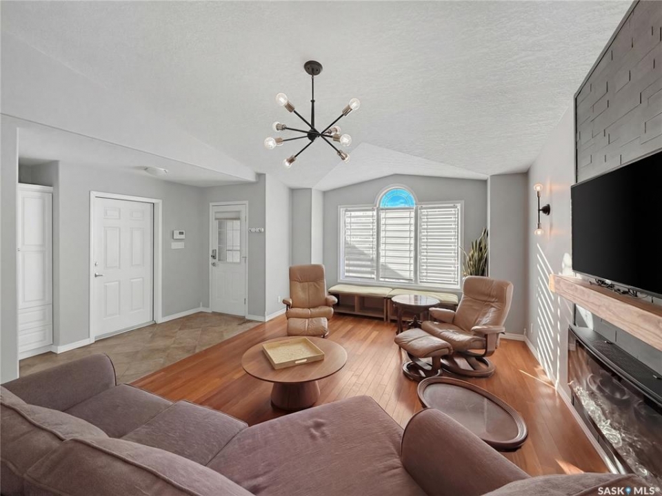 Rare opportunity in Highland. Homes in this sought after subdivision do not come along often. Highland remains one of the city's most desirable neighbourhoods for families and retirees alike, known for its quiet streets and long term value. This oversized bungalow offers 1,520 sq ft on the main floor with 5 bedrooms, 3 bathrooms, and a heated double attached garage. It checks all the boxes. Step inside to rich hardwood floors, vaulted ceilings, and an open concept layout. The main living areas are finished in a modern grey palette and feature recessed lighting and contemporary light fixtures. The generous living room showcases a statement wall with electric fireplace and TV integration. The spacious foyer includes both a closet and built in drawers, along with direct access to the garage. The kitchen offers solid oak cabinetry, a contemporary grey tiered island with seating, and a stainless steel and black appliance package, including a fridge new in 2025 with water and ice. The dining area includes additional built in cabinetry and a single garden door leading to the east facing deck. Pergola included. The main floor features three bedrooms, including a primary suite with double closets and a 4 piece ensuite complete with jacuzzi tub and corner walk in shower. Two additional bedrooms, a full bath, and a large hallway laundry closet with stacking washer and dryer, washer new in 2026, complete this level. The lower level offers a bright family room with large windows, a spacious bedroom behind double doors, a home gym area, a fifth bedroom, full bath, and utility room with Lennox mid efficient furnace, air exchanger, water softener, central vac, 100 amp panel, and hot water heater replaced July 2023. The fully fenced backyard features an east facing deck, tiered stone landscaping, shed, and gravel RV parking. A well appointed bungalow in Highland with this square footage and layout is a rare offering. Opportunity is knocking.