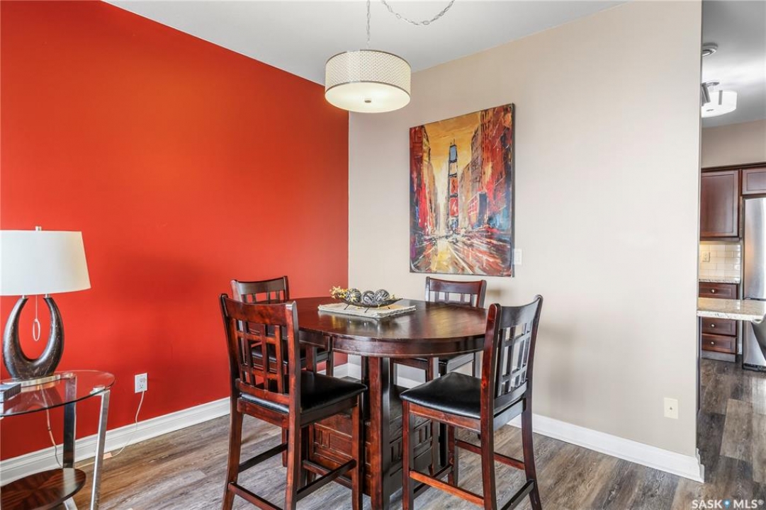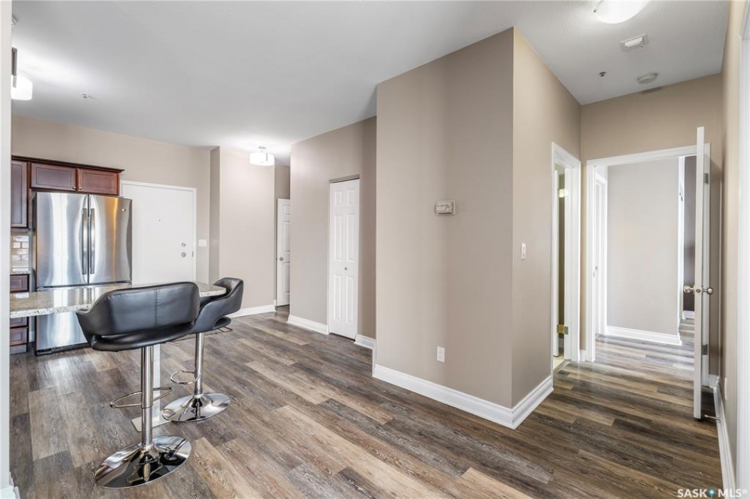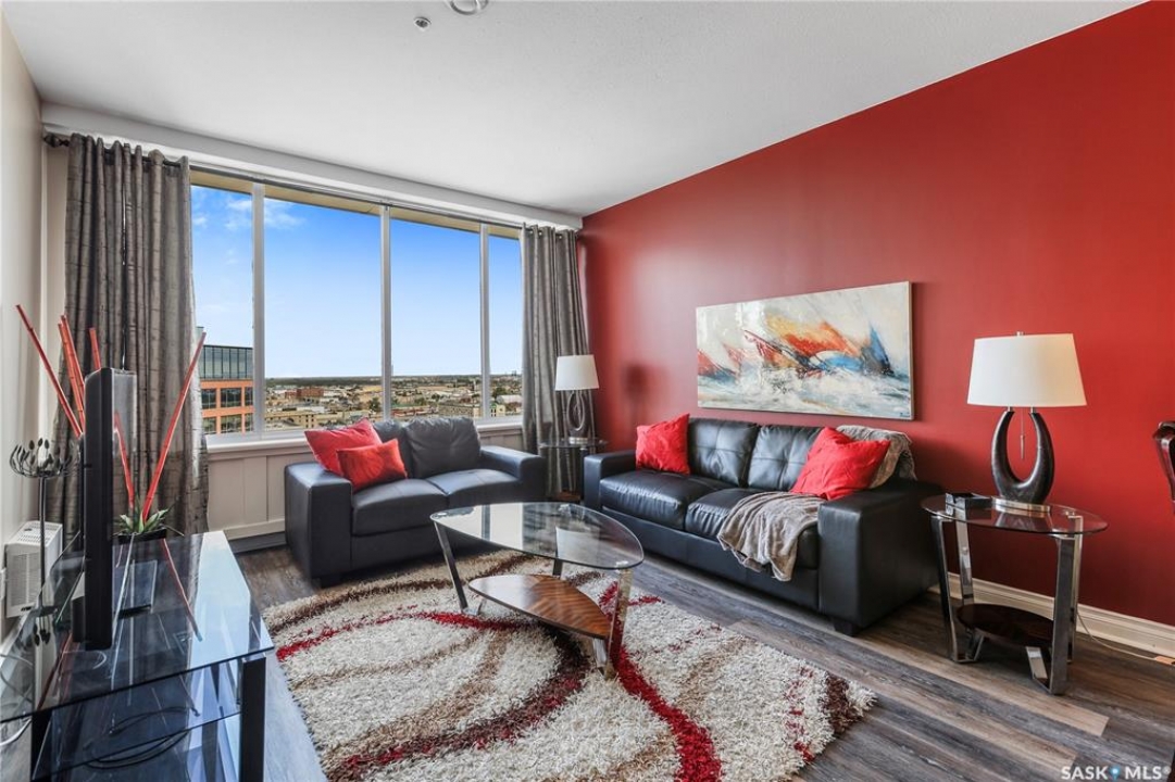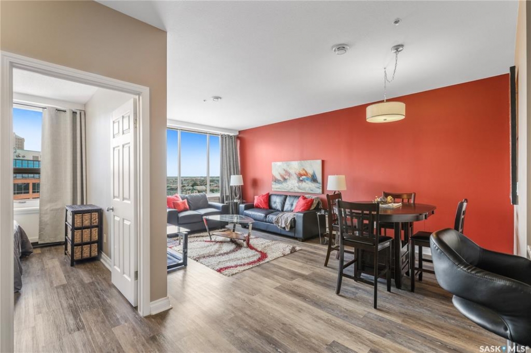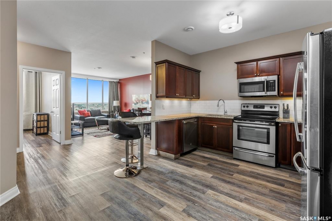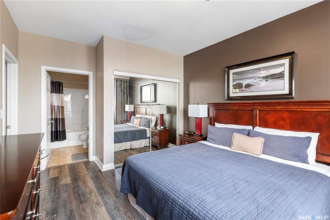 Welcome to this beautifully renovated downtown condo offering breathtaking views and modern comfort throughout. This gorgeous 2-bedroom, 2-bathroom unit features a bright, open-concept living and dining area highlighted by large windows and an abundance of natural light. Stylish vinyl plank flooring flows seamlessly from the living space into the updated kitchen, which is sure to impress with warm wood cabinetry, updated countertops, undermount sink, under-cabinet lighting, stainless steel appliances, a pantry, and a convenient breakfast bar. Down the hall, you'll find a spacious guest bedroom and full bathroom, along with the generous primary suite complete with a private 4-piece ensuite. An in-suite laundry/storage room adds everyday convenience. Additional features include; Large secure basement storage unit #72, Underground parking stall #32, Condo fees that cover water, heat, building insurance, reserve fund, and more. This well-appointed building offers premium amenities, including; Fully equipped 24/7 fitness center, Social room with pool table, Rooftop patio with BBQs and hot tub, Concierge service (Monday–Friday, 8am–4pm). All furnishings included, making this a truly turn key opportunity.