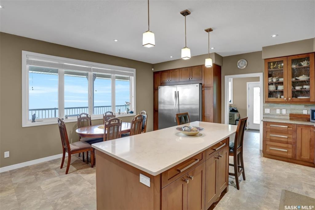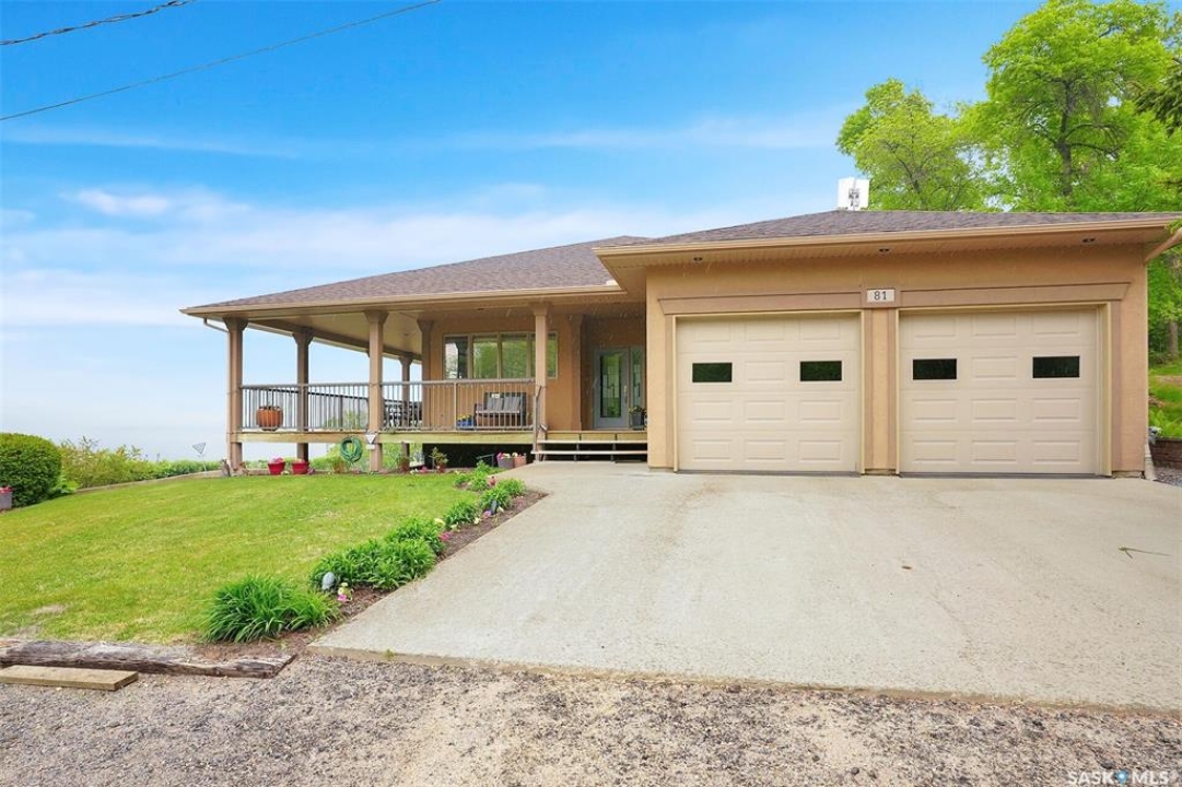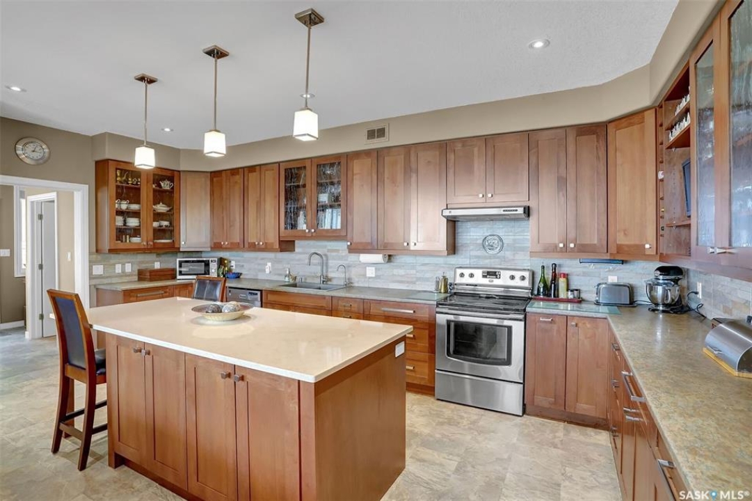 Welcome to 81 Kinsley Place at Mission Lake! WOW! This large walkout delivers incredible, unobstructed views to the lake! This custom, thoughtfully designed home offers an abundance of both luxury and practicality! The main level features 3 good size bedrooms + the primary suite that proudly includes a great 3 pc ensuite, walk in closet, and large windows. The formal dining area is open to the living room with gorgeous hardwood floors. The large kitchen is a chef's dream with nutmeg maple cabinets, large island with a quartz top, S/S appliances (Kenmore Elite freezer/fridge combo), built in pantry with rolling drawers, wine rack, tons of counter space/storage and added pot lights. There is a convenient flex room and 2 pc bath tucked away behind the kitchen. The main bath and ensuite boasts heated flooring. The large laundry room includes the washer and dryer, sink, and more storage capacity. The impressive walkout level showcases an 1800 sq ft suite with a large kitchen with crisp white cabinets, full set of appliances, 3 bedrooms, private laundry room, a full 4 pc bath, and patio doors that lead to a large, private patio space. The exterior of this property includes a retaining wall, swale, garden area, ample parking, and a super impressive covered deck that spans the entire length of the home where you could easily have 75+ people comfortably enjoying the sunrise or the sunsets! There has been many large gatherings and even a few weddings on the property! A large insulated and heated double garage with a workshop completes this property. Other important noteables - steel beam construction, original owners, central vac, central air, air exchanger, original drawings available. A true gem in the land of the living skies!