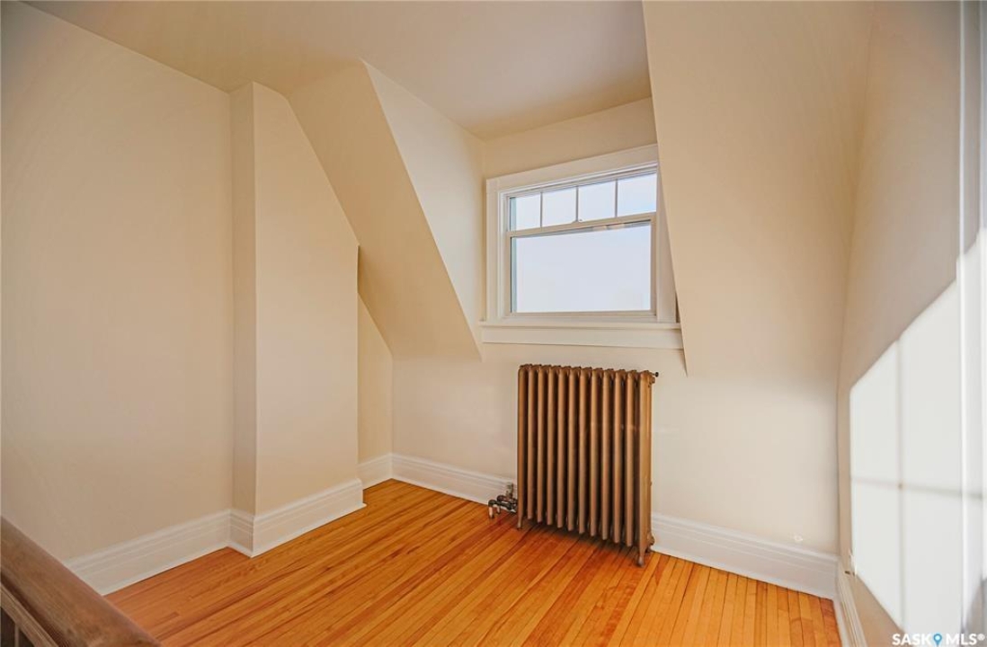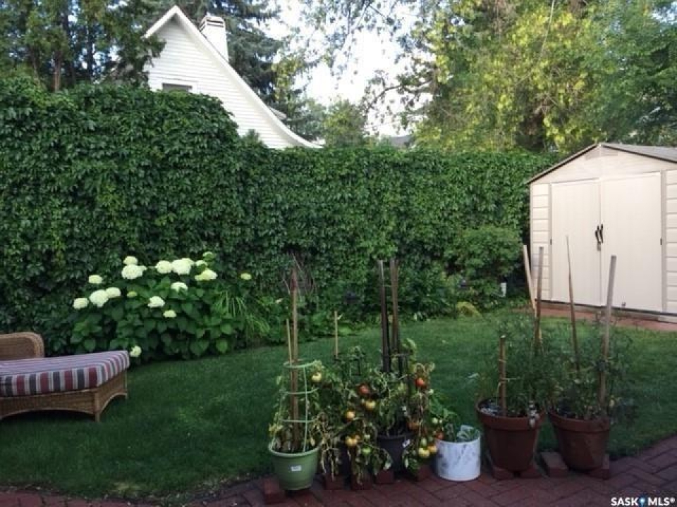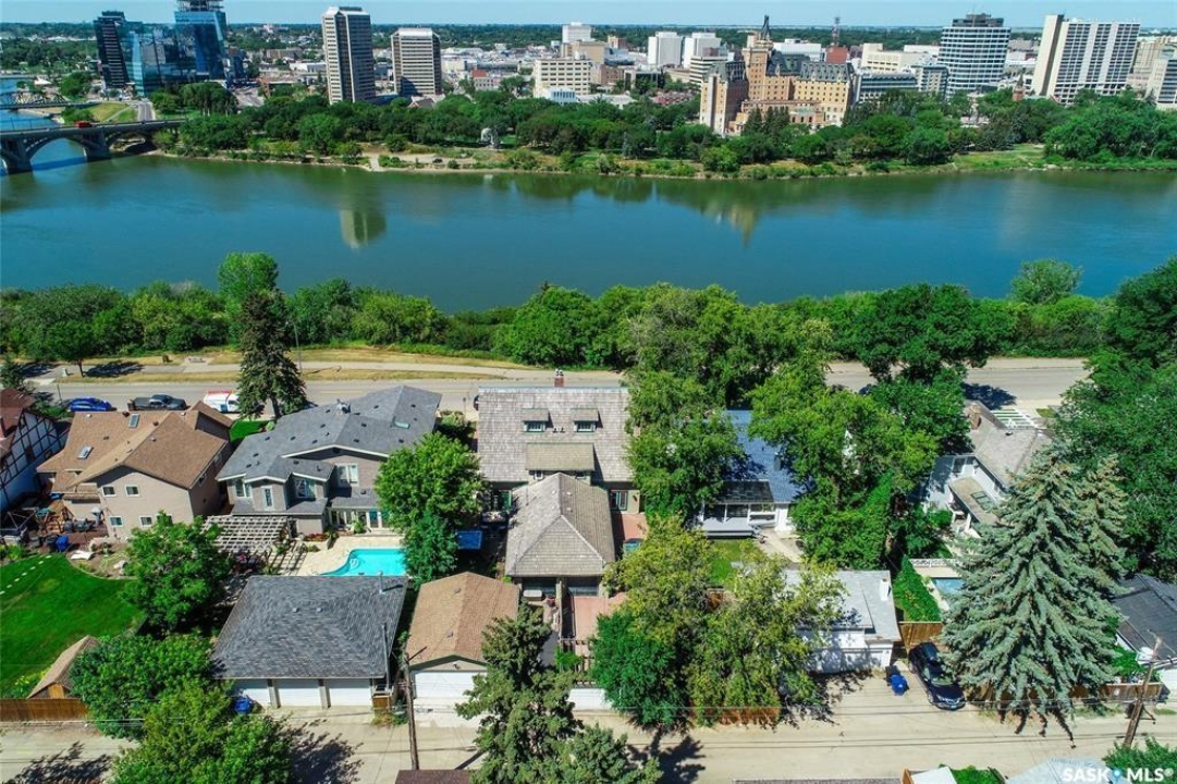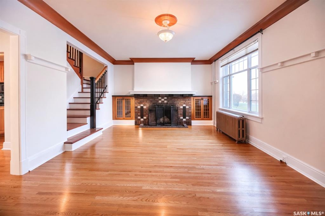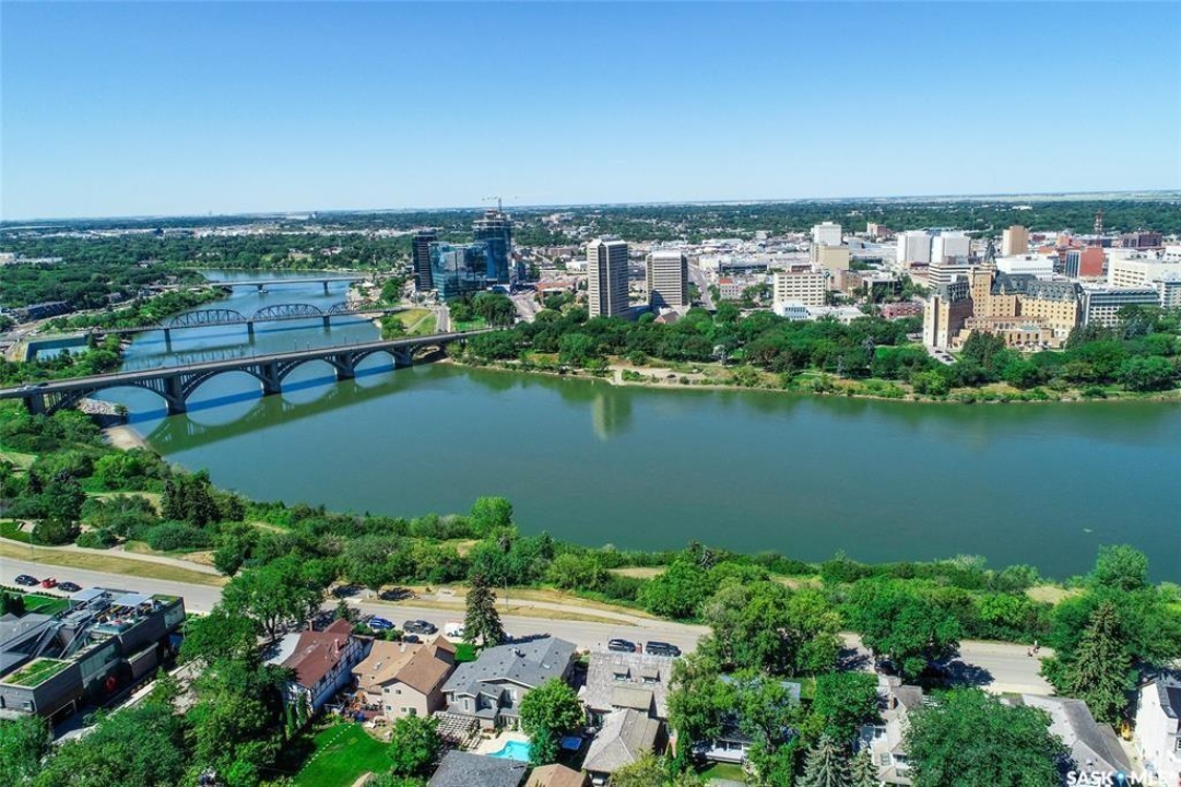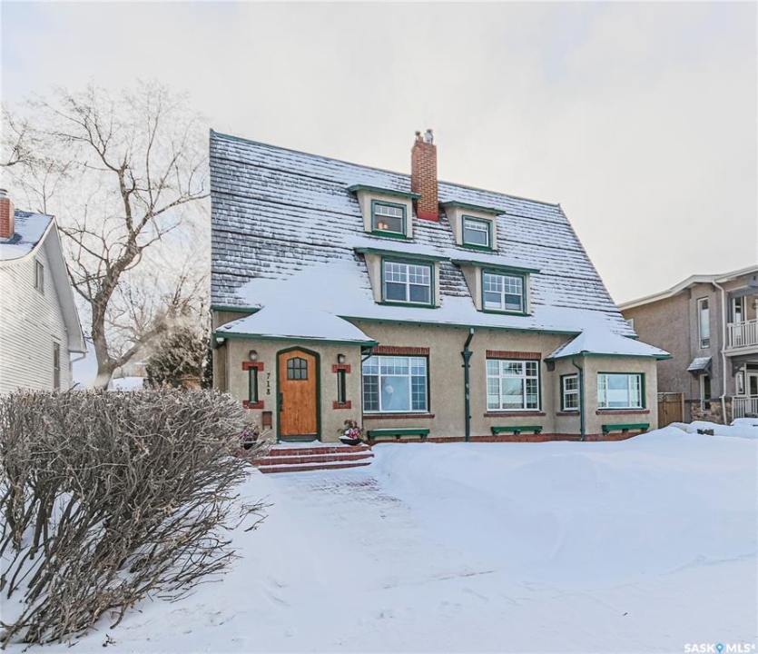 Built in 1926 by prominent architect, Frank P. Martin. The heritage value of the F.P. Martin House resides in its architecture. set along one of Saskatoon's most iconic and scenic streets. This charming 3-bedroom, 2-bathroom heritage home is full of character and timeless appeal. The main floor offers a bright living room, dining area, kitchen, and a convenient 3-piece bathroom. Hardwood and tile flooring run throughout, complemented by granite countertops, a cozy wood-burning fireplace, and plenty of cabinetry. Upstairs you'll find a spacious primary bedroom with double closets, a second bedroom, and a 4-piece bathroom. The third floor features a third bedroom and a office area with incredible views of the river and downtown skyline. Built with lasting quality in mind, the home features some masonry construction, steel joists, and a concrete floor which can be seen from the open basement. The backyard offers a private retreat with a brick patio, and a rear-attached single garage with two more off street parking spaces. Own a piece of Saskatoon History.