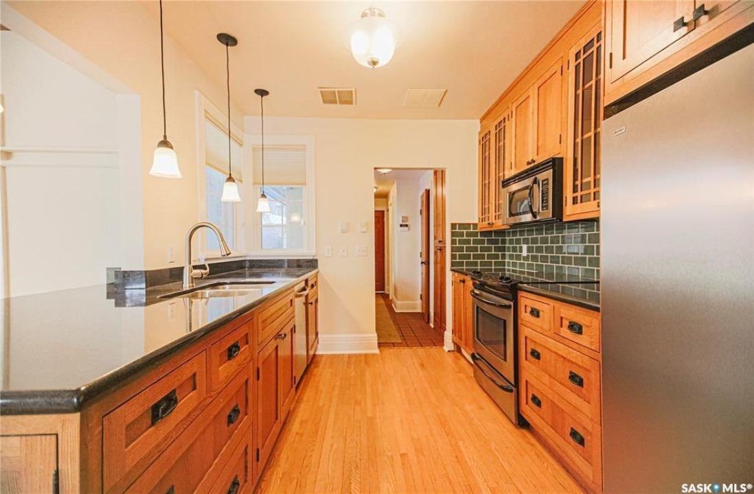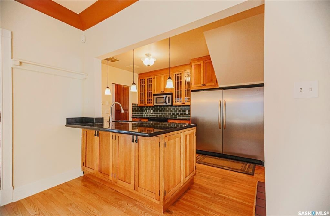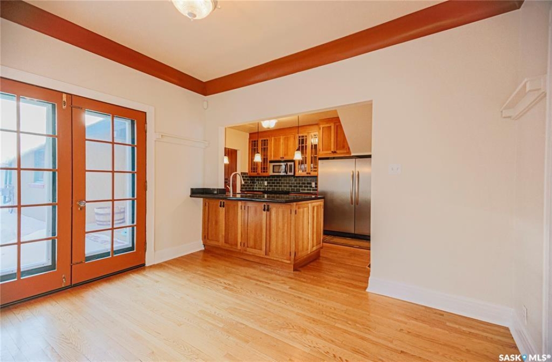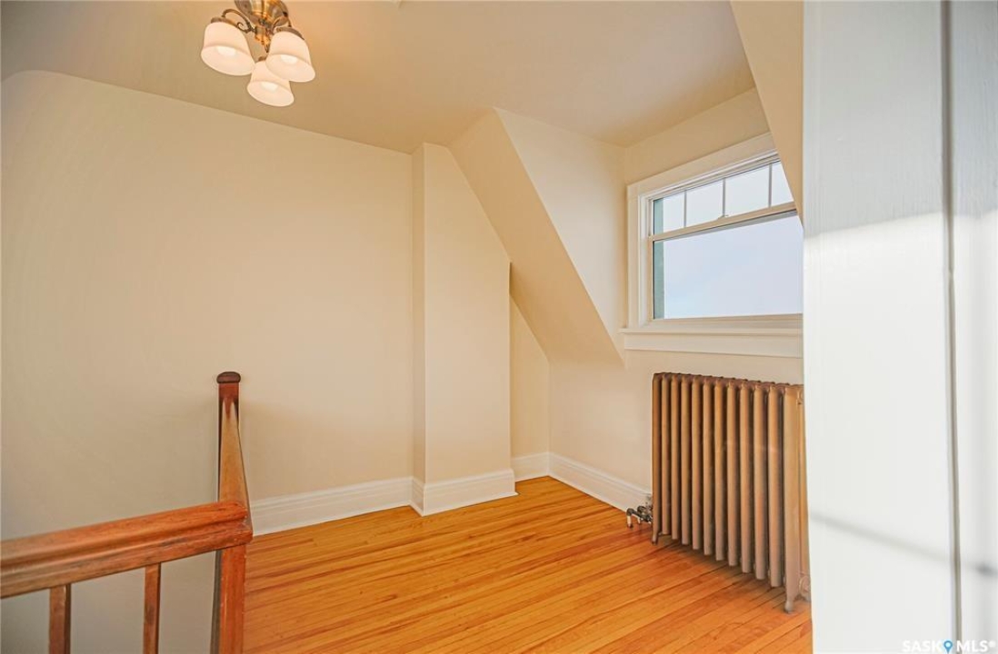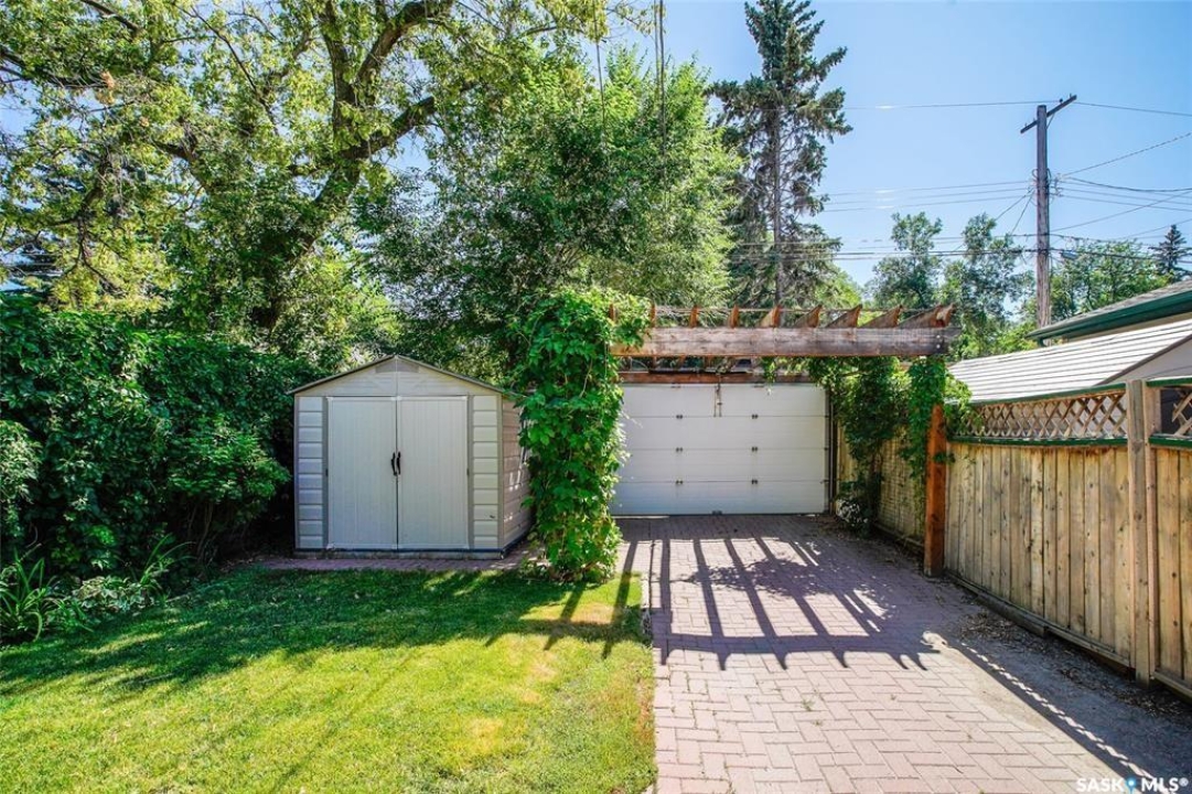 Built in 1926 by prominent architect, Frank P. Martin. The heritage value of the F.P. Martin House resides in its architecture. set along one of Saskatoon's most iconic and scenic streets. This charming 3-bedroom, 2-bathroom heritage home is full of character and timeless appeal. The main floor offers a bright living room, dining area, kitchen, and a convenient 3-piece bathroom. Hardwood and tile flooring run throughout, complemented by granite countertops, a cozy wood-burning fireplace, and plenty of cabinetry. Upstairs you'll find a spacious primary bedroom with double closets, a second bedroom, and a 4-piece bathroom. The third floor features a third bedroom and a office area with incredible views of the river and downtown skyline. Built with lasting quality in mind, the home features some masonry construction, steel joists, and a concrete floor which can be seen from the open basement. The backyard offers a private retreat with a brick patio, and a rear-attached single garage with two more off street parking spaces. Own a piece of Saskatoon History.