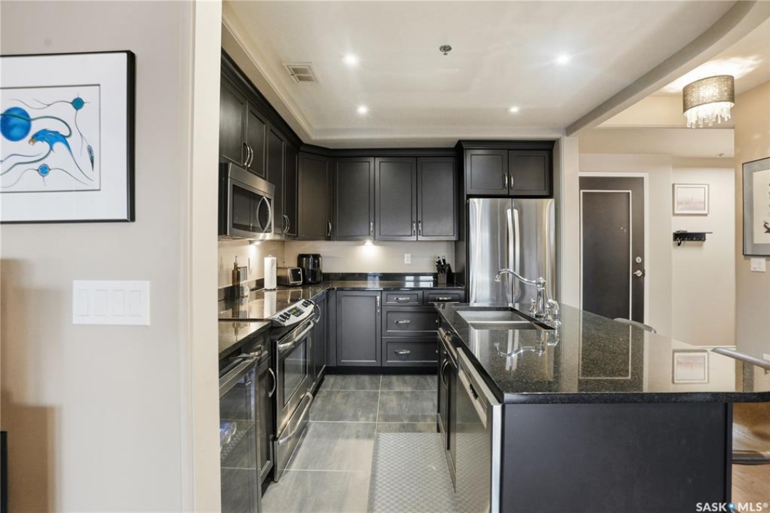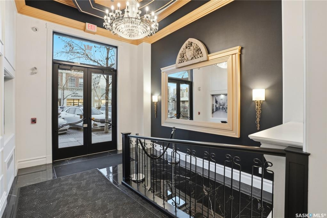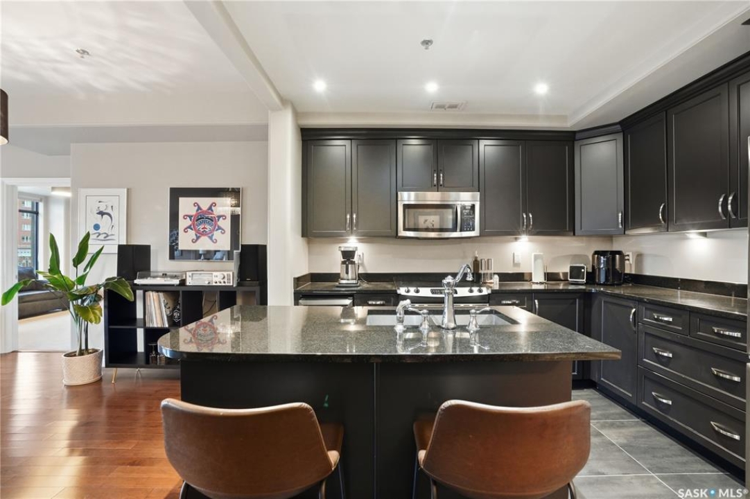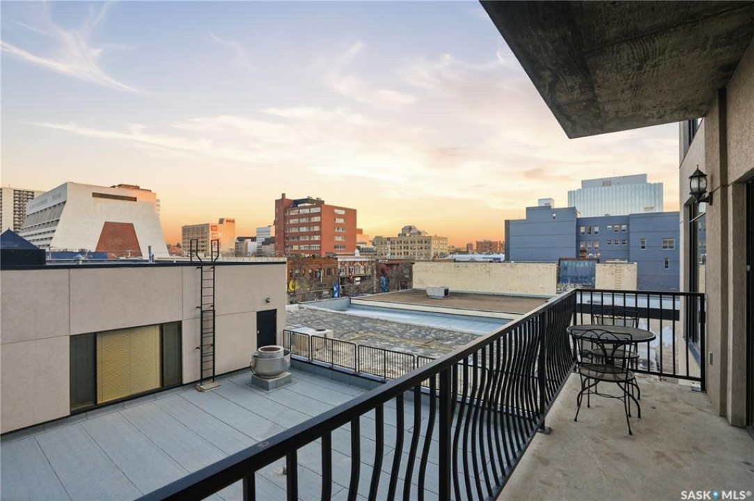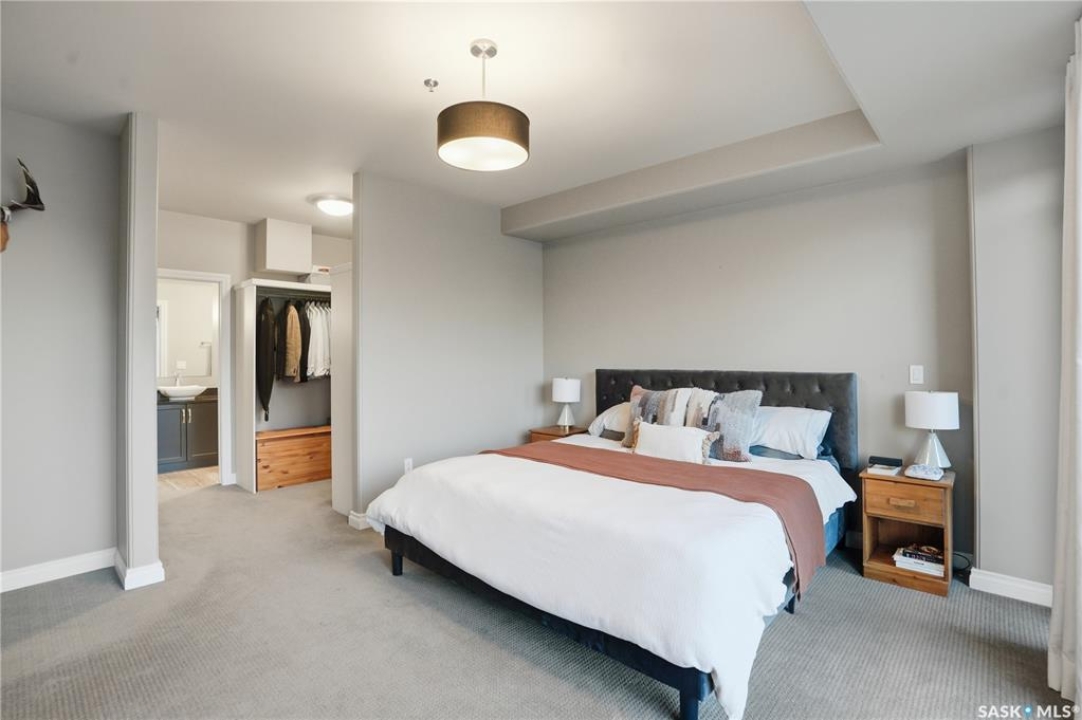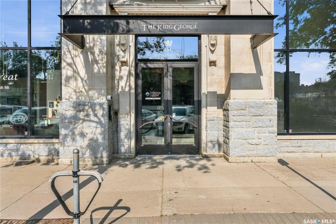 Enjoy luxury living in one of Saskatoon's most prestigious and icon developments; The Residences at the King George. Experience city living at its finest in this 1216 sq ft., 2 bedroom, 2 bathroom condo. The spacious open concept floor plan features executive level finishes designed for both elegant entertaining and everyday comfort. The fully equipped kitchen comes with stainless steel appliances, granite countertops and ample cabinetry throughout. Garden doors off the living room lead to a balcony to enjoy the downtown surroundings. The primary bedroom includes a walk-in closet and a 3-piece ensuite. The spacious second bedroom overlooks the terrace below and would also make for a great home office. Floor to ceiling windows flood the unit with natural light and offer beautiful cityscape views, both day and night. A rooftop patio is available for the residence; complete with a built in BBQ and outdoor kitchen. This unit also features 2 heated underground tandem parking spots, heated storage and a secured entry system. This exceptional home offers the perfect blend of modern urban living and historic charm and is an ideal opportunity to own a piece of Saskatoon history in the heart of the city.