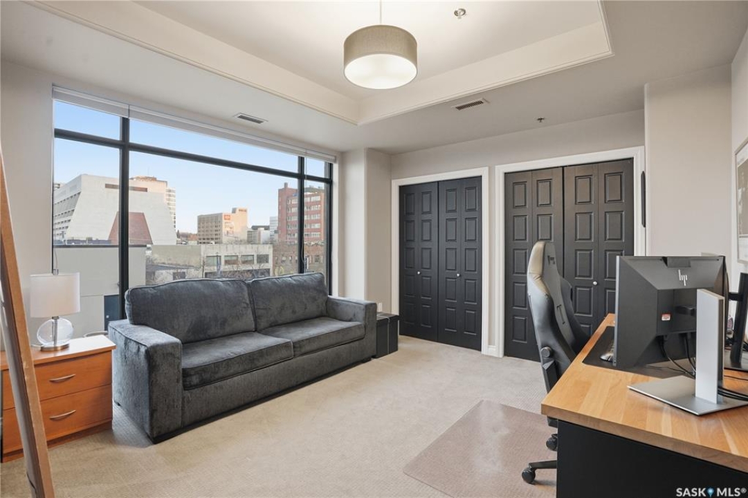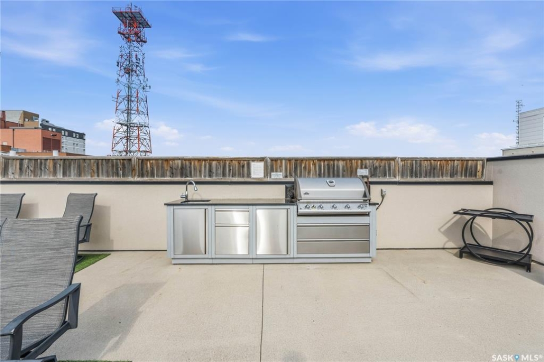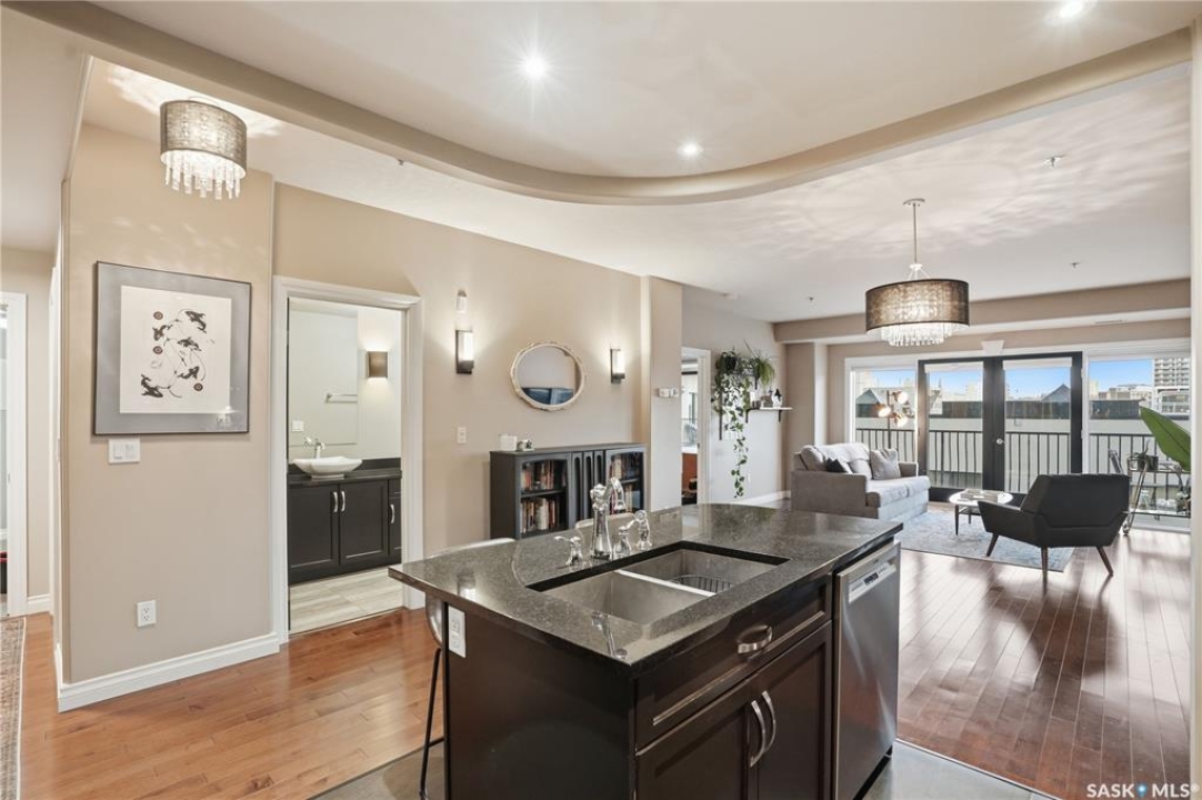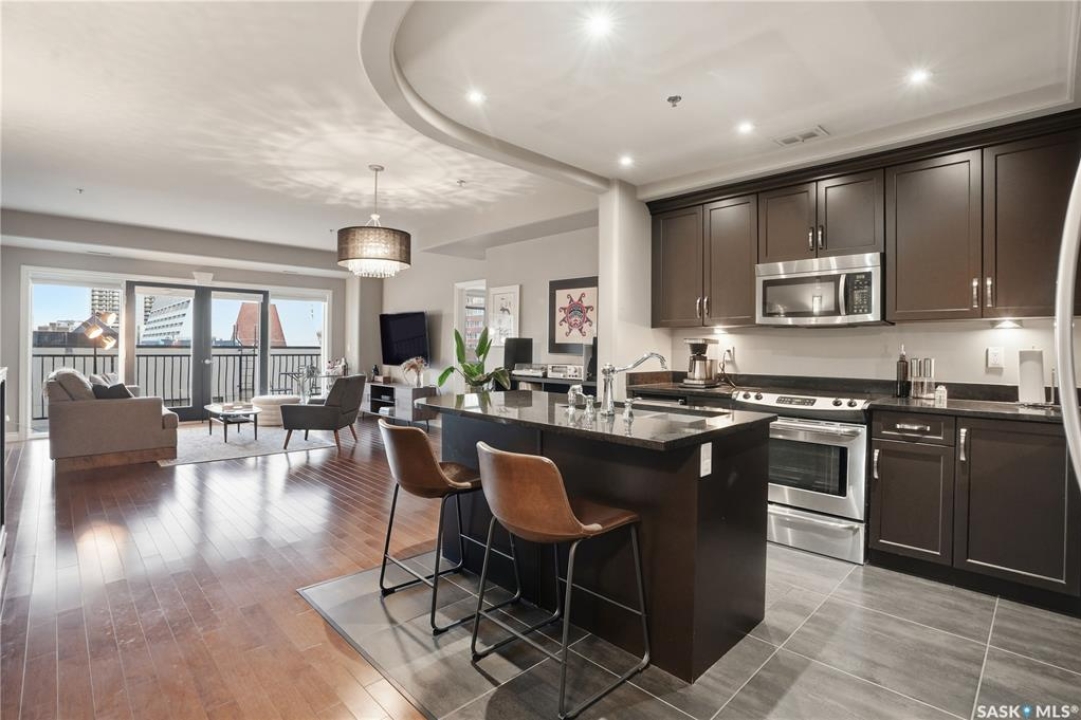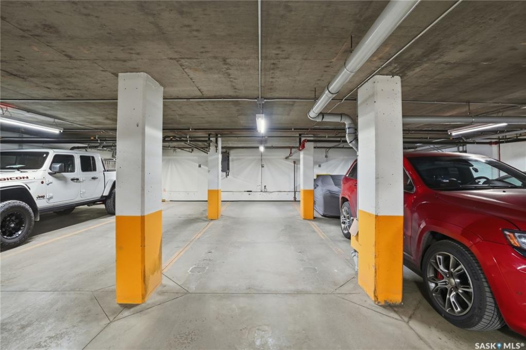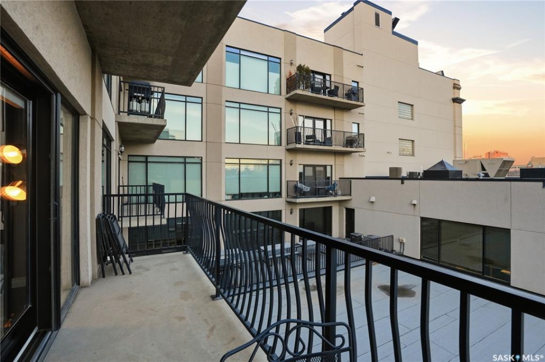 Enjoy luxury living in one of Saskatoon's most prestigious and icon developments; The Residences at the King George. Experience city living at its finest in this 1216 sq ft., 2 bedroom, 2 bathroom condo. The spacious open concept floor plan features executive level finishes designed for both elegant entertaining and everyday comfort. The fully equipped kitchen comes with stainless steel appliances, granite countertops and ample cabinetry throughout. Garden doors off the living room lead to a balcony to enjoy the downtown surroundings. The primary bedroom includes a walk-in closet and a 3-piece ensuite. The spacious second bedroom overlooks the terrace below and would also make for a great home office. Floor to ceiling windows flood the unit with natural light and offer beautiful cityscape views, both day and night. A rooftop patio is available for the residence; complete with a built in BBQ and outdoor kitchen. This unit also features 2 heated underground tandem parking spots, heated storage and a secured entry system. This exceptional home offers the perfect blend of modern urban living and historic charm and is an ideal opportunity to own a piece of Saskatoon history in the heart of the city.