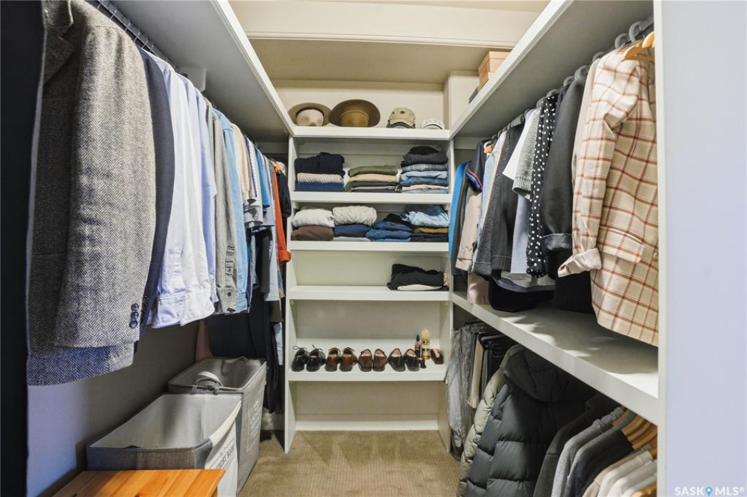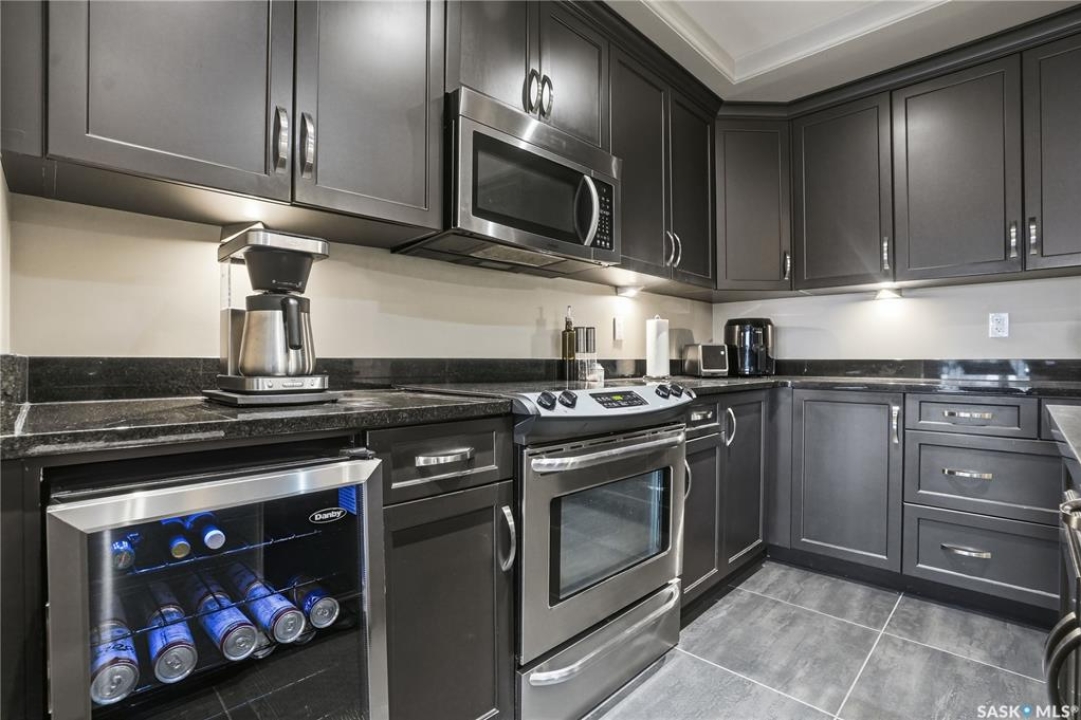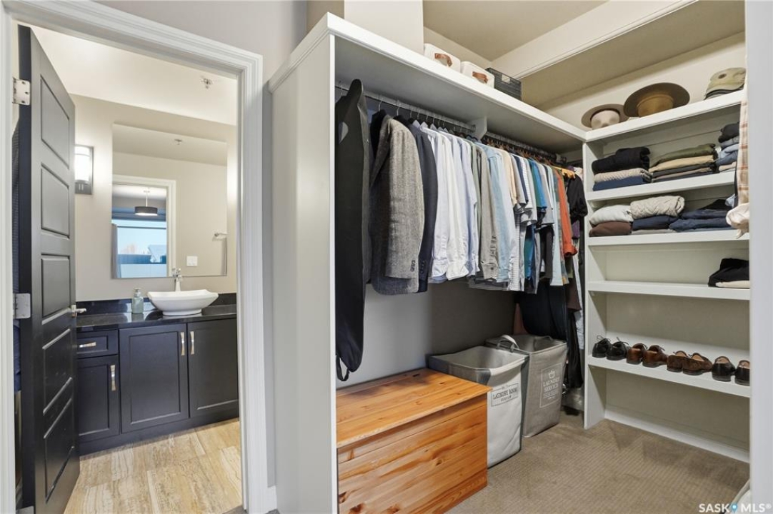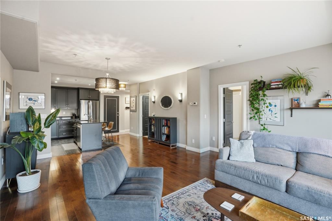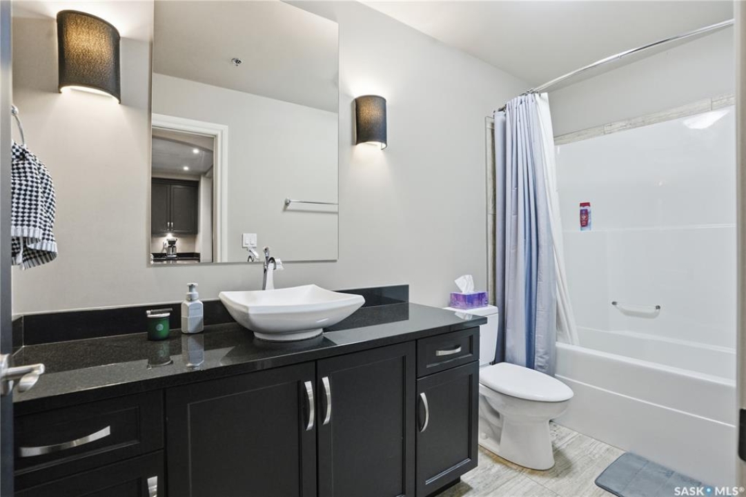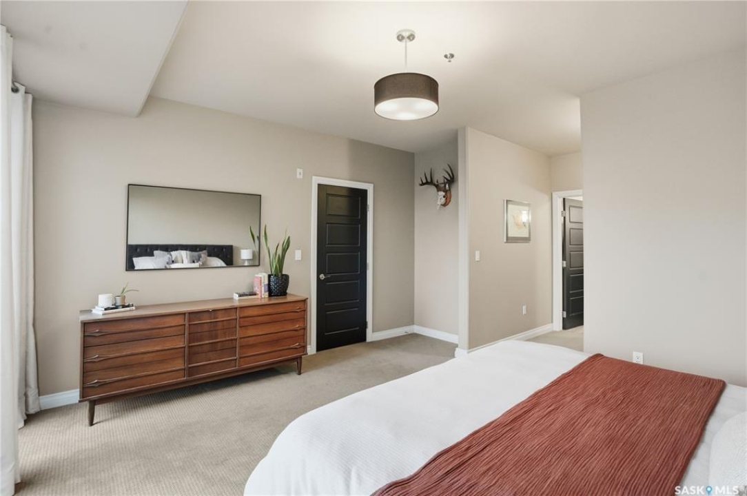 Enjoy luxury living in one of Saskatoon's most prestigious and icon developments; The Residences at the King George. Experience city living at its finest in this 1216 sq ft., 2 bedroom, 2 bathroom condo. The spacious open concept floor plan features executive level finishes designed for both elegant entertaining and everyday comfort. The fully equipped kitchen comes with stainless steel appliances, granite countertops and ample cabinetry throughout. Garden doors off the living room lead to a balcony to enjoy the downtown surroundings. The primary bedroom includes a walk-in closet and a 3-piece ensuite. The spacious second bedroom overlooks the terrace below and would also make for a great home office. Floor to ceiling windows flood the unit with natural light and offer beautiful cityscape views, both day and night. A rooftop patio is available for the residence; complete with a built in BBQ and outdoor kitchen. This unit also features 2 heated underground tandem parking spots, heated storage and a secured entry system. This exceptional home offers the perfect blend of modern urban living and historic charm and is an ideal opportunity to own a piece of Saskatoon history in the heart of the city.
