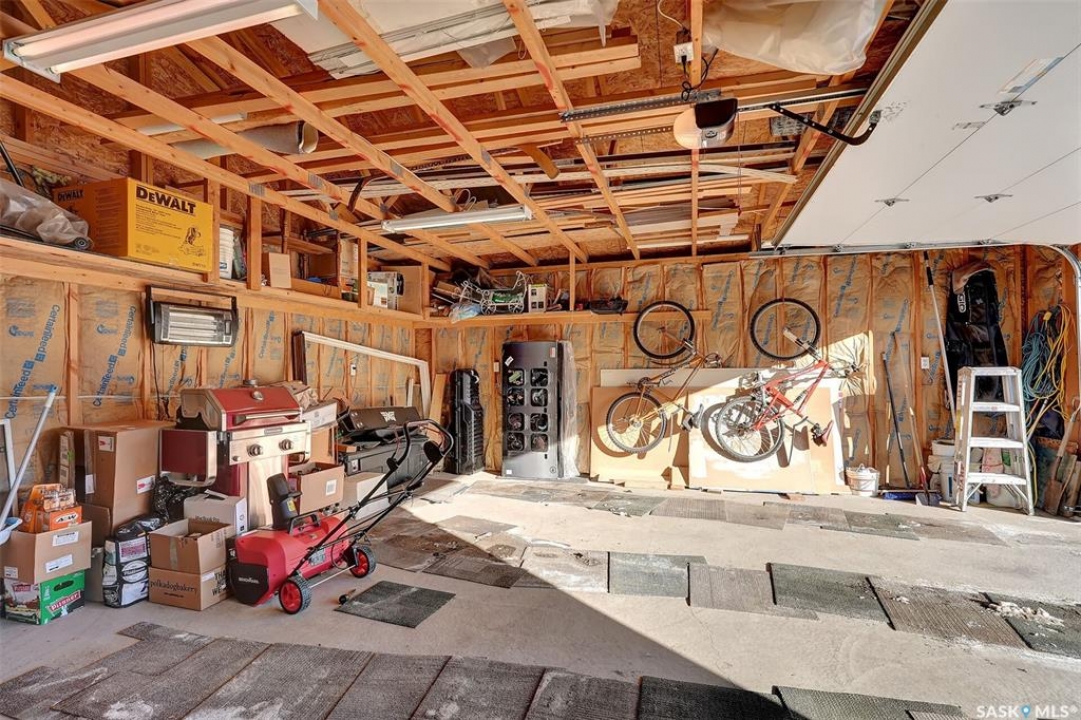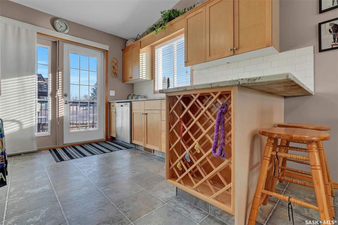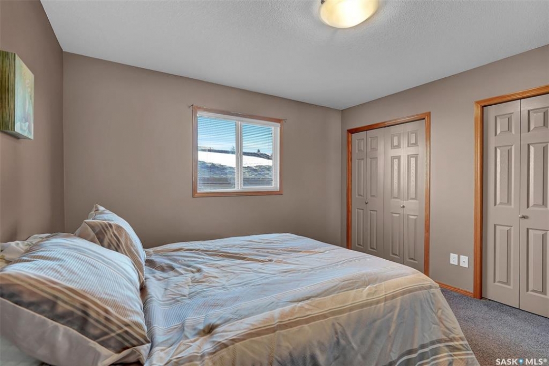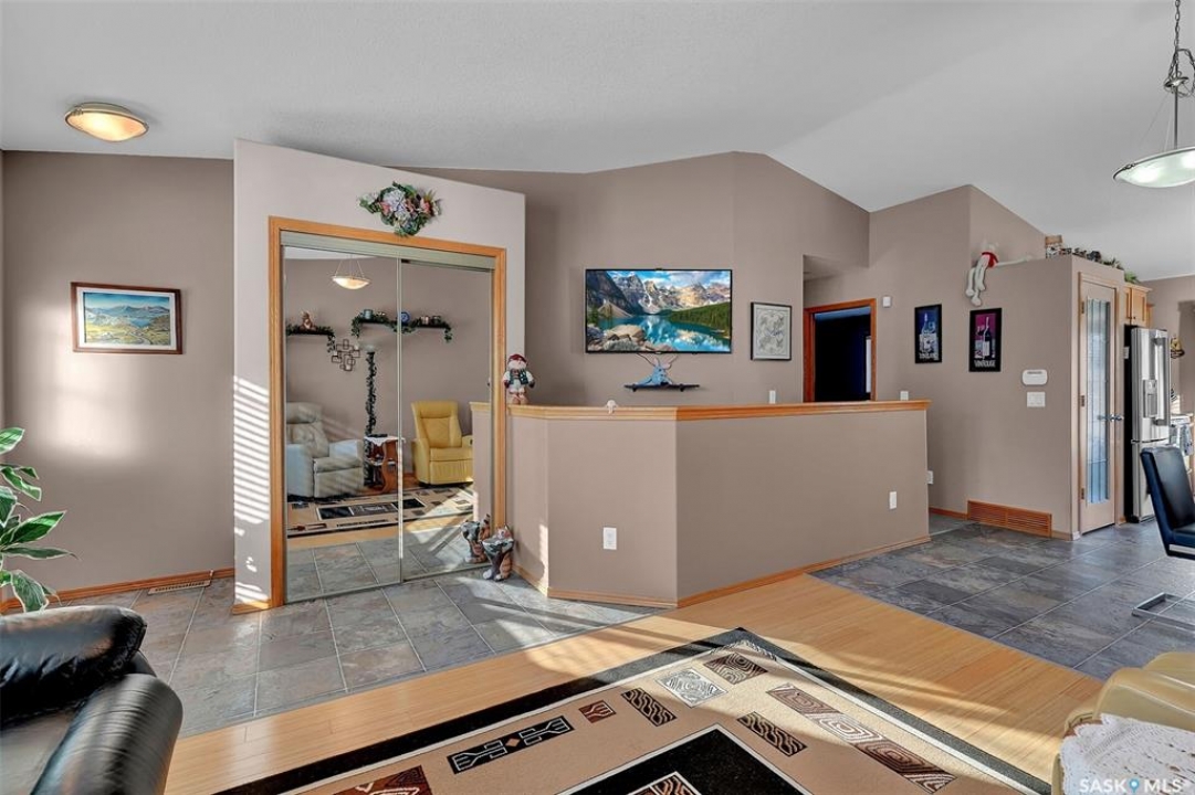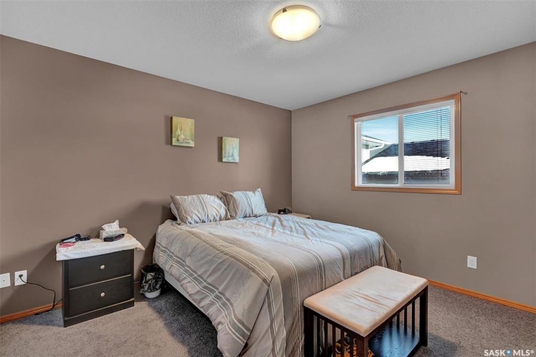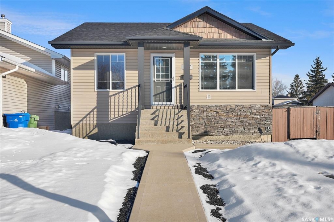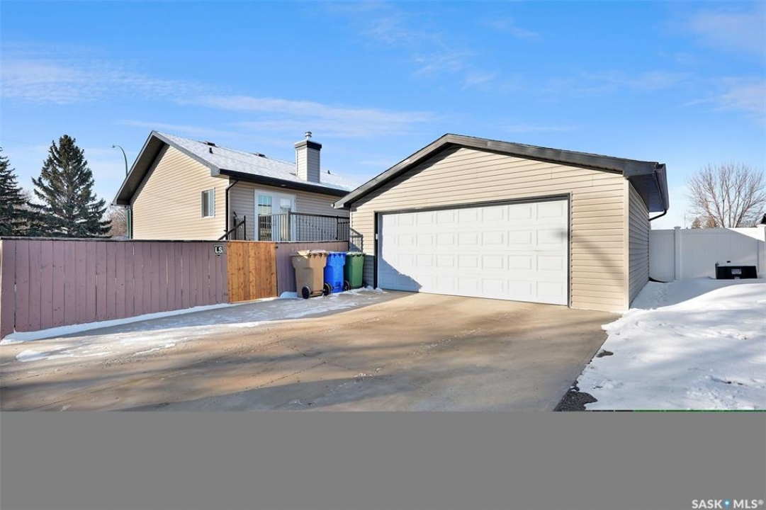 Move in ready 2005 built home in Argyle Park has much to offer with convenient location to all north/west Regina shopping and amenities. A Great room concept with vaulted ceilings in main living area has a front living room with large south facing window bringing in lots of natural light and features bamboo hardwood flooring. Fantastic kitchen has lots of cabinets including pantry storage, upgraded granite counters, granite sink and stainless steel appliances are included. The dining area has ample room for table, note glass table and chairs are included as well as area rug in living room. There are two good sized main floor bedrooms, the primary bedroom has double closets with organizers and the full family bath completes this level. Basement development offers lots of additional living space with a very large family room with rubber matting that is included and there is a plumbing provision for wet bar. There is a large 3rd bedroom (no closet) and rough-in for future bathroom. The laundry is located in the furnace/mechanical room and there is a newer owned water heater. Extra storage under the stairs. Shingles replaced approximately 5 years ago. Outside is low maintenance landscaping with artificial turf, the yard is fully fenced, there is a deck off the kitchen as well as concrete block patio. Insulated 22 x 22 detached garage with keypad and 2 remotes.