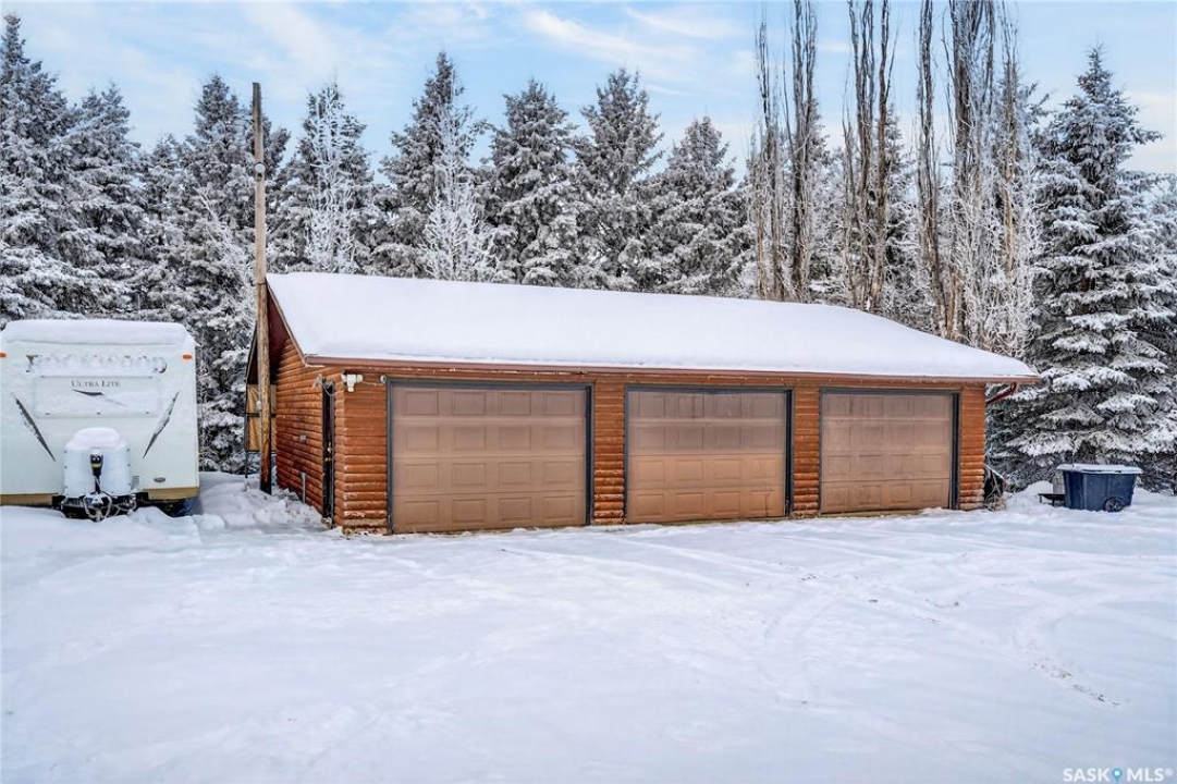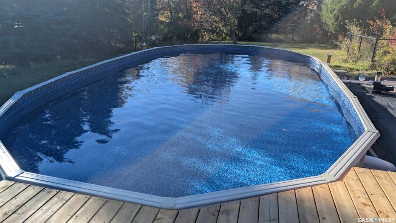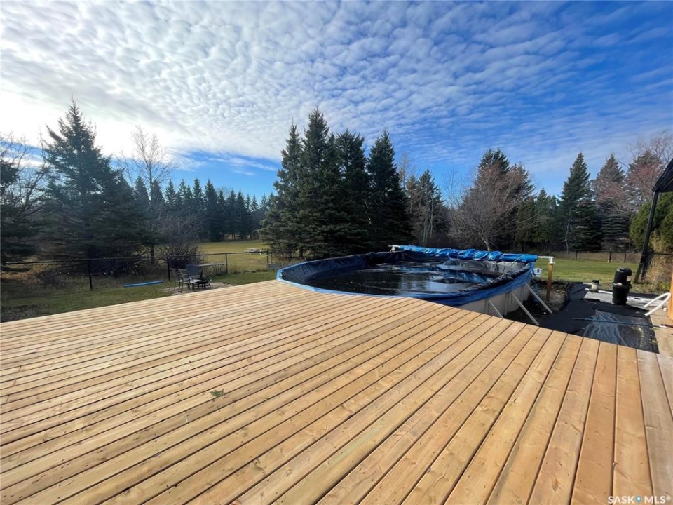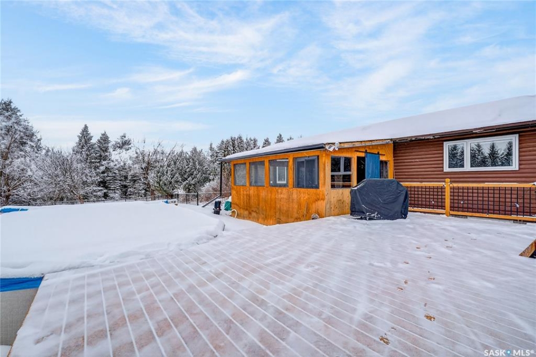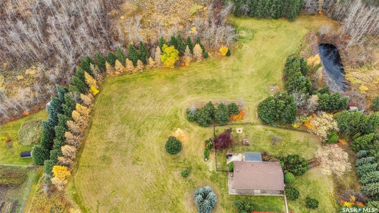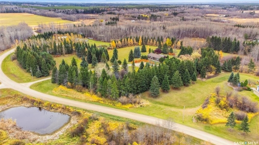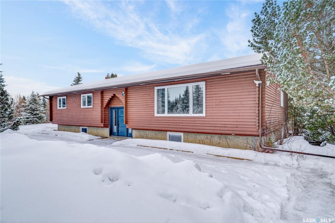 Just five minutes northeast of Prince Albert, this exceptional 1840 square foot extensively renovated raised bungalow with walkout basement sits on 7.48 beautifully treed acres, offering the privacy of country living with the convenience of a quick commute to the city. Fully developed and extensively updated, this five bedroom, three bathroom home is move-in ready and designed for both family living and entertaining. The main floor welcomes you with a massive front entry featuring built-in seating, ideal for acreage life. The bright, spacious layout includes a large kitchen with island and abundant cabinetry, flowing into the dining area with sliding doors leading to a three season sunroom and massive back deck overlooking the 18' x 32' above ground heated pool. The living room is anchored by a cozy gas fireplace, creating a warm and inviting gathering space. A four piece bathroom and three generously sized bedrooms complete the level. The primary suite features a walk-in closet, second closet, and private four piece ensuite. The fully developed walkout lower level offers excellent additional living space with a mudroom entry, large rec room with slate pool table included, games area, cold room, storage, two additional bedrooms (one currently used as an large office or family room), and laundry/utility area. Recent upgrades include new flooring throughout (2025), windows (2022), shingles on the home and triple detached garage (2025), solar panels (2026), exterior doors (2025), rebuilt furnace (2025), new water heater and water softener (2025), and serviced central air, sunroom & chain link fence (2016). Outside feels like your own private park with mature trees, an orchard with apple, plum and chokecherry trees, an 18 × 33 above ground pool with natural gas heater, triple detached garage, fenced yard, huge custom firepit and tree house and close access to quad trails.
