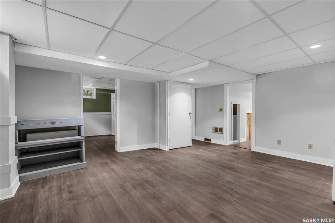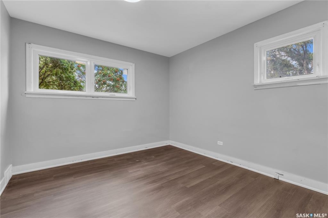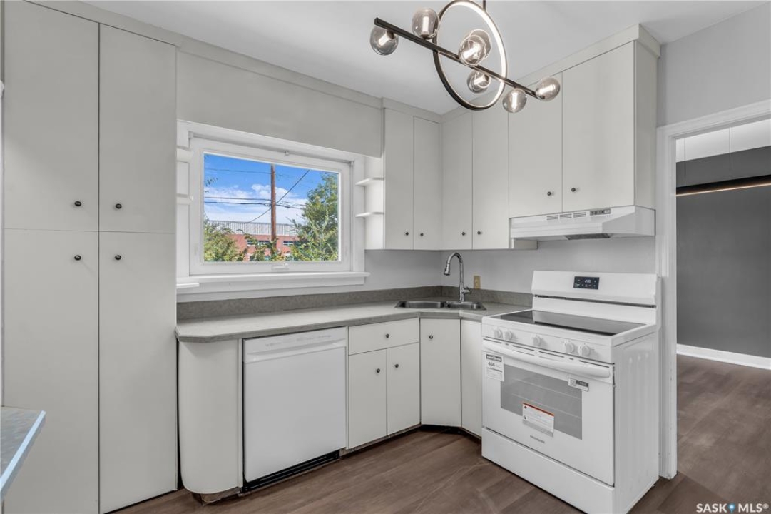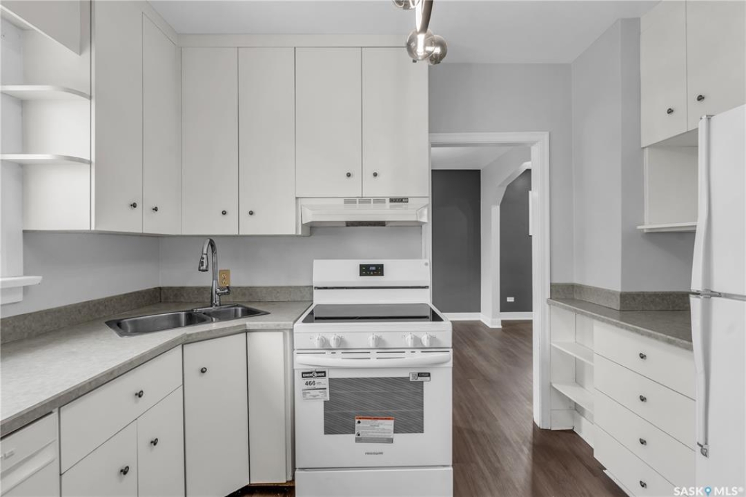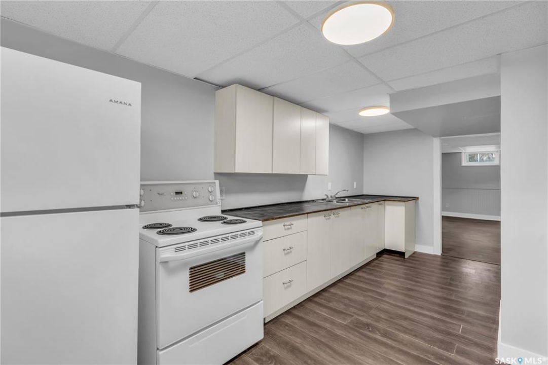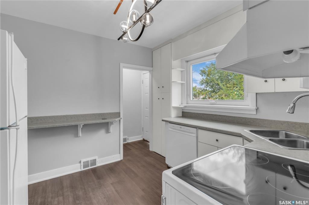 Charming bungalow on a large corner lot in a great location! This bright and inviting 960 sq ft home features a sun-filled main floor with two bedrooms, a full bathroom and one bedroom + den basement suite. Recent upgrades in 2025 include vinyl plank flooring, modern lighting, and fresh interior paint, while the exterior was repainted in 2019 to enhance curb appeal. The fully developed basement offers even more value with a non-conforming suite, ideal for extended family or potential rental income. It includes a kitchenette with appliances, one spacious bedroom + den, and a beautifully renovated bathroom/laundry area. Additional features include a newer water heater, some updated windows, new ceiling tiles in the basement, and a fully fenced yard with a storage shed—perfect for pets, kids, or relaxing summer BBQs. Located directly behind John Paul II Collegiate and close to parks, shopping, and amenities, this home offers excellent value for first-time buyers, investors, or those looking to downsize. Book your private showing today.
