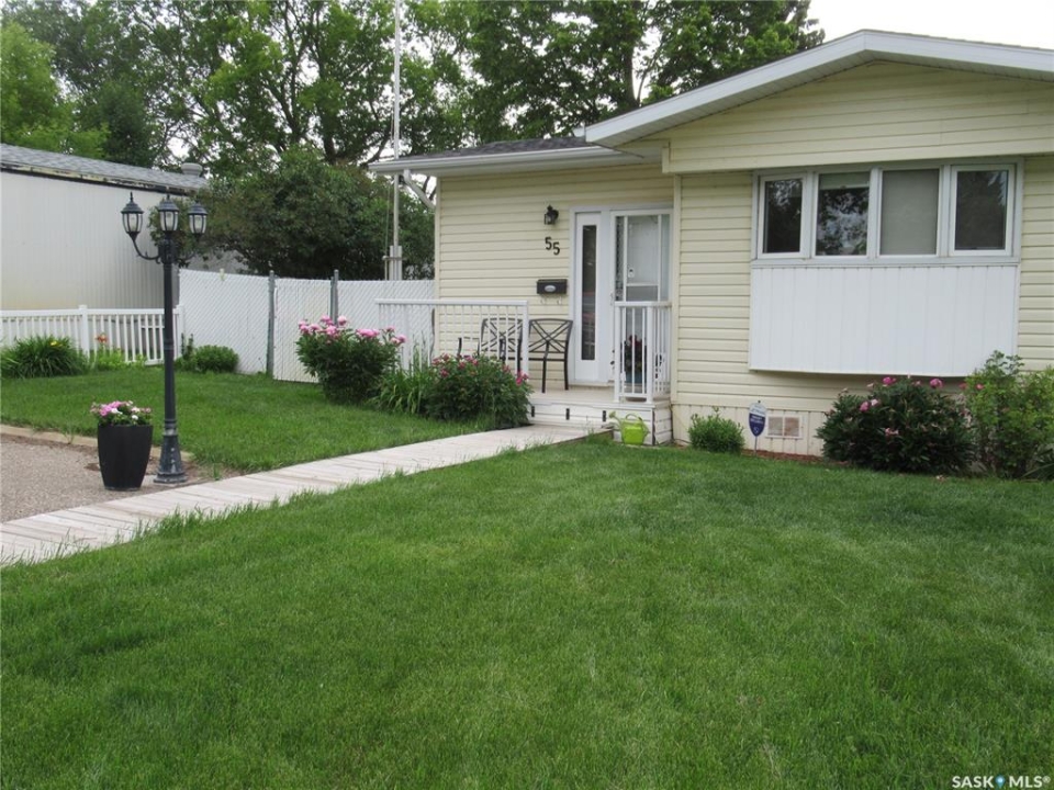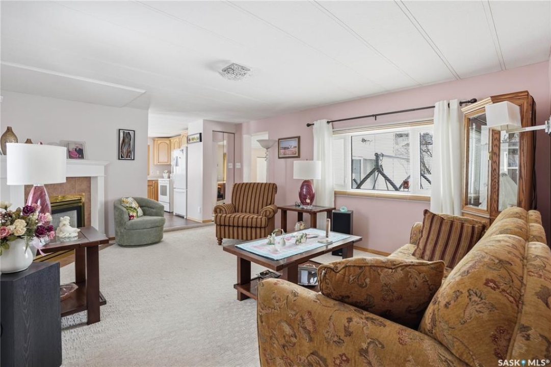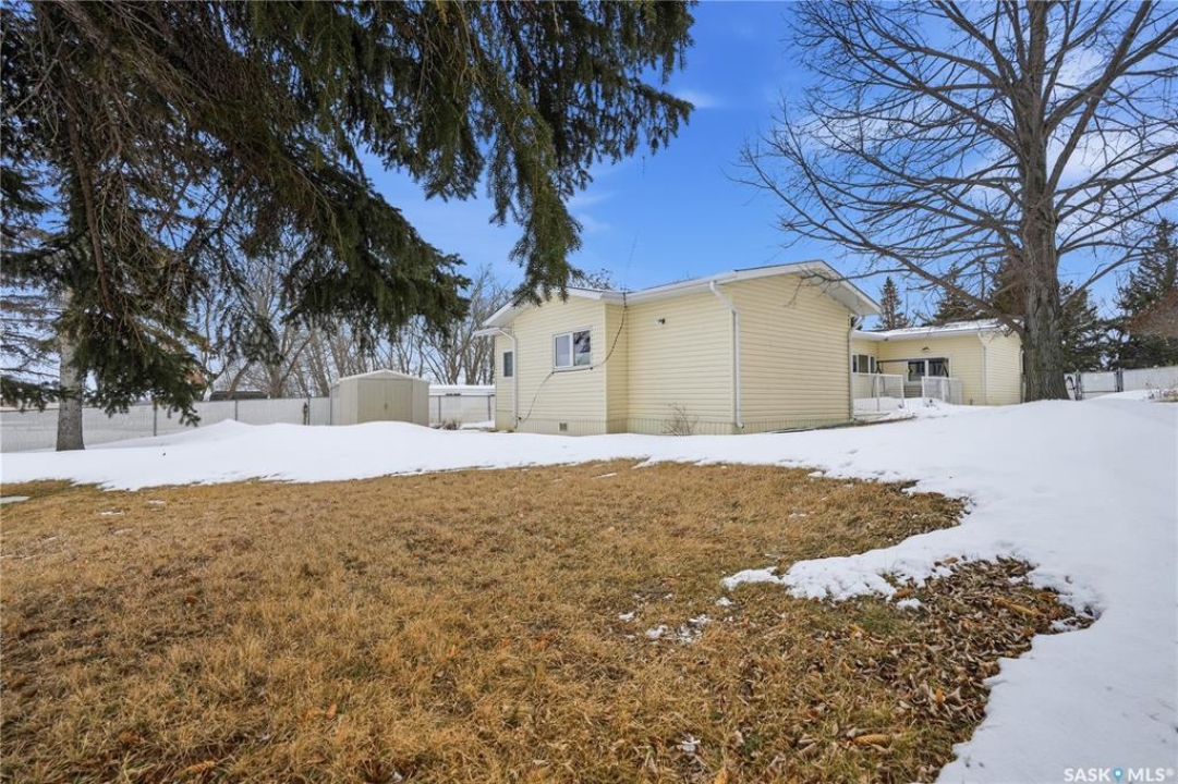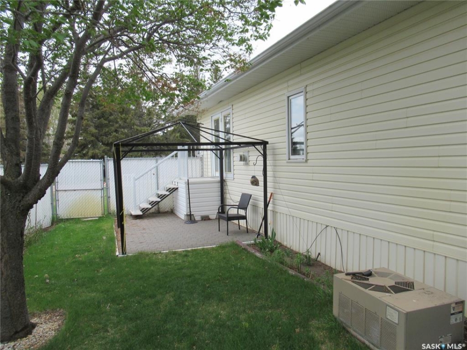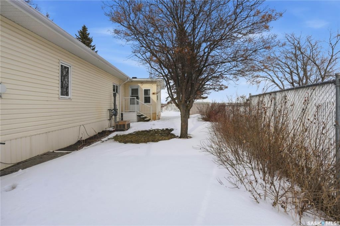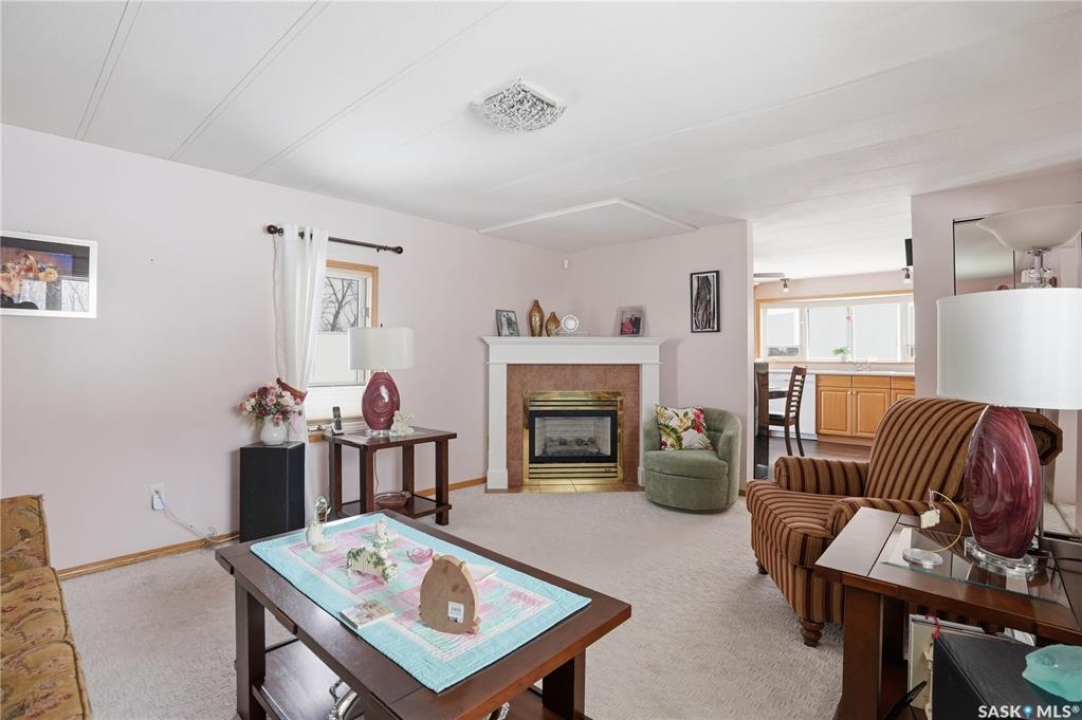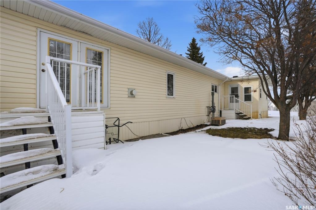 Welcome to a home filled with care, pride, and wonderful memories. Lovingly owned and enjoyed for decades, this original owner property in the community of Coppersands offers a warm and inviting place to call home. Situated on a spacious, fully fenced lot, the outdoor space is truly special. Fully landscaped yard has been beautifully maintained with underground sprinklers, a maintenance free PVC deck and two garden sheds for storage. Front yard offers an abundance of perennials returning year after year. Garden doors from the kitchen lead to an interlocking brick patio area—perfect for relaxing or enjoying time outdoors. A PVC front entry deck welcomes you at the front door, while an asphalt double driveway provides convenient off-street parking for two and easy access to the home. Inside, the home has been thoughtfully expanded with three additions over the years, creating comfortable and functional living spaces. The bright family room addition provides welcoming front entry access, while the second added a storage room plus expanded the bathroom to include a relaxing jetted tub and second vanity alongside the original tub and shower. The third, a large den along the back of the home and features built-in cabinetry and direct access to the PVC landing leading to the side yard and patio. The kitchen offers beautiful oak cabinetry, including a built-in china cabinet and plenty of cupboard space. The living room provides a cozy atmosphere with a corner gas fireplace complete with mantle, while the spacious primary bedroom offers a comfortable retreat at the end of the day. Updates over the years include peaked roof, vinyl windows, drywall interior finishing, updated kitchen cupboards and counters, newer flooring, central vacuum, and shingles. Pad rental is $675/month and includes water, garbage pickup, and street snow removal. Come experience the warmth and pride of ownership this home offers—you may just find it feels like home the moment you arrive.