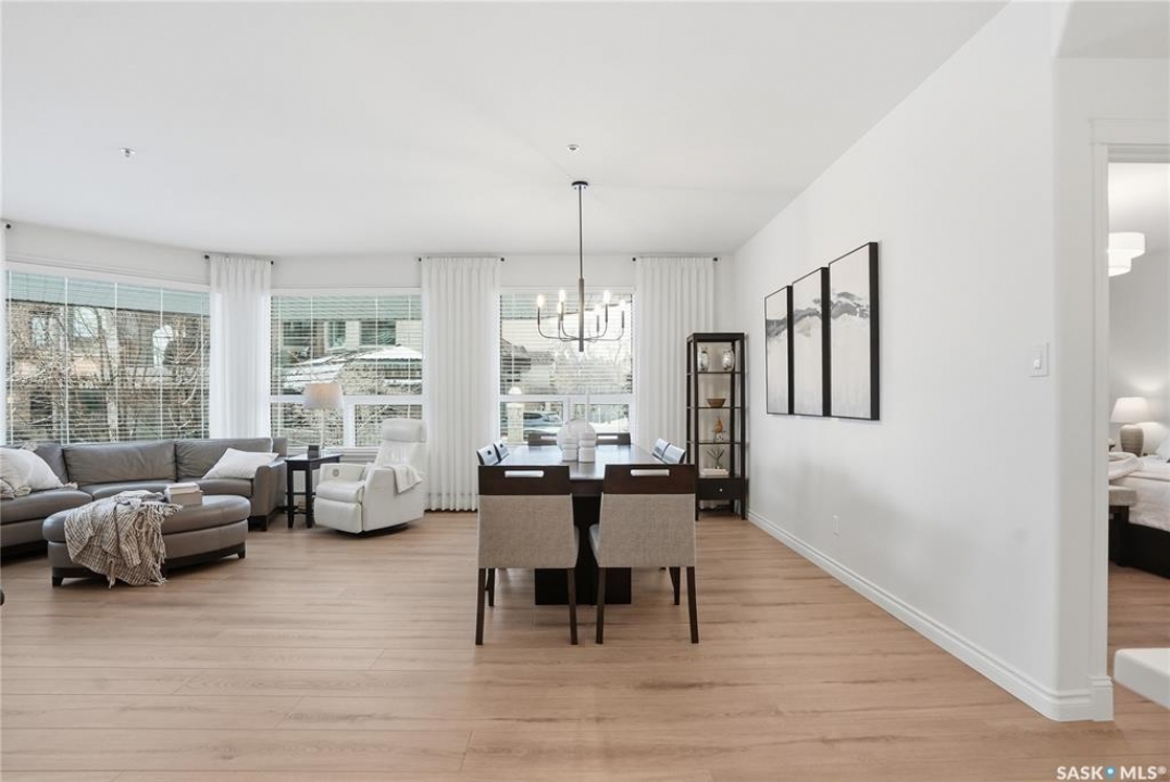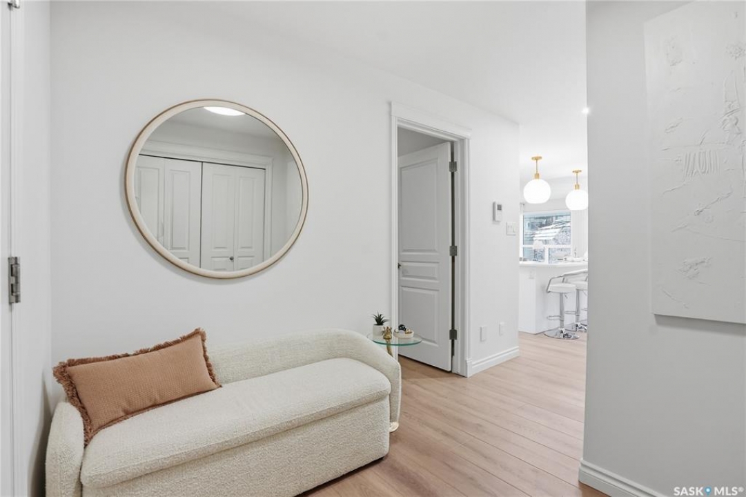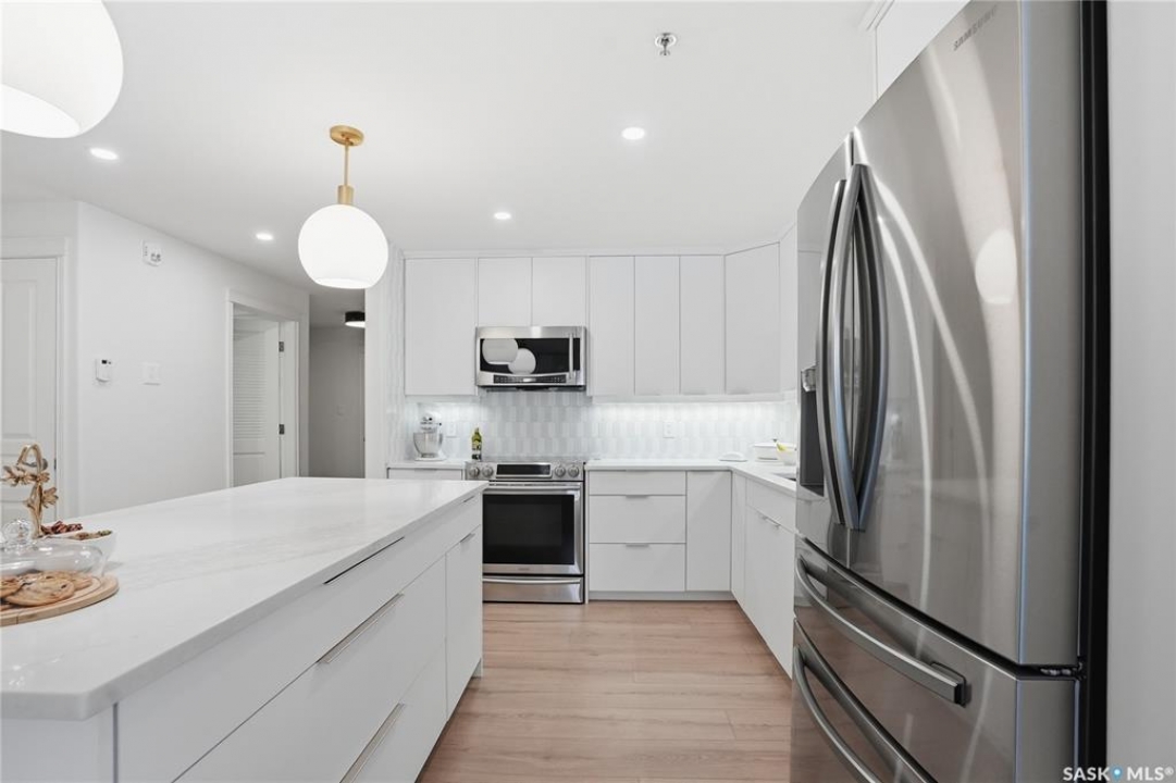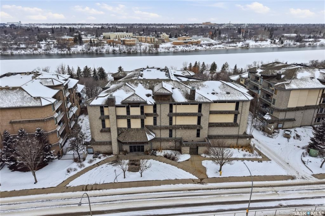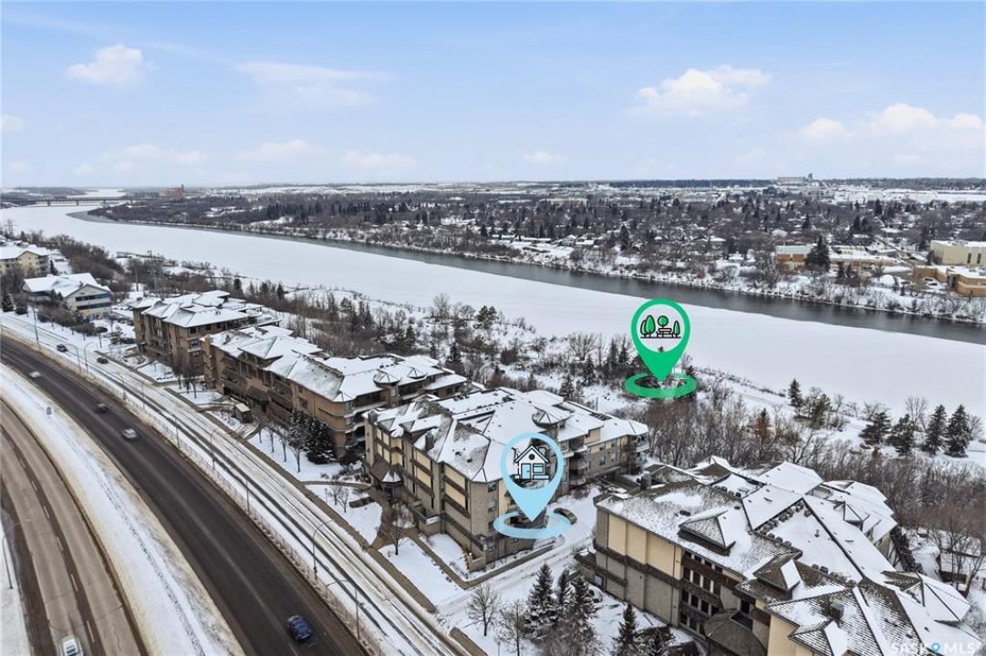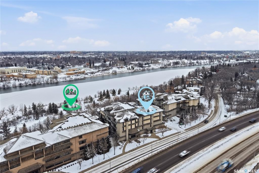 Wow!With so many upgrades, this unit shows almost like new! Truly a rare find on prestigious Sask Crescent. Stunning 1,418 sq ft, 3-bedroom main floor corner unit and a former show suite located in a quiet, well-managed complex. Enjoy beautiful river views in the fall and winter, impressive 9' ceilings, and large panoramic windows that fill the home with natural light. This home has undergone extensive renovations and rebuilding, creating a refreshed interior that feels almost brand new. Major Interior Renovations (2025): Approximately 90% of the drywall replaced New electrical wiring and upgraded panel Redone ceilings and updated insulation 9-inch luxury vinyl plank flooring throughout (no off-gassing) Stunning Kitchen Renovation (2025): The beautifully upgraded kitchen features quartz countertops, modern backsplash, high-end appliances, soft-close cabinetry, and a sleek contemporary design, creating a bright and highly functional cooking space. Bathroom Upgrades(2025): Both bathrooms have been refreshed, including a fully renovated ensuite with a brand-new shower, vanity, mirrors, and modern finishes. Additional Interior Improvements Include(2025): Updated doors, trim, and baseboards. New lighting fixtures and backsplash. Upgraded vanity countertop, Custom laundry cabinetry ($6,000 upgrade). Premium Miele washer & dryer Window Coverings & Finishing Touches(2025): Hunter Douglas blinds ($4,300) Custom drapery in the living room and bedroom With extensive structural and cosmetic upgrades, this beautifully refreshed home offers the feel of a newly rebuilt interior in one of Saskatoon's most desirable locations on Sask Crescent.