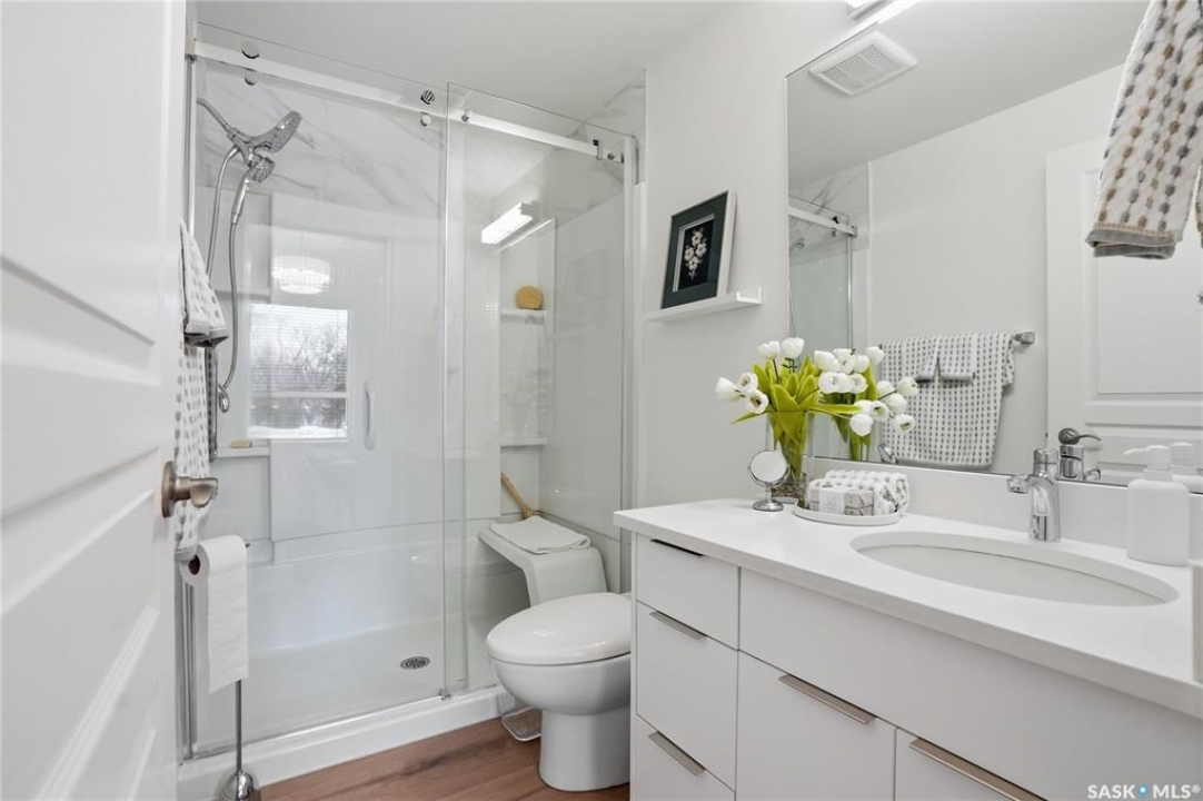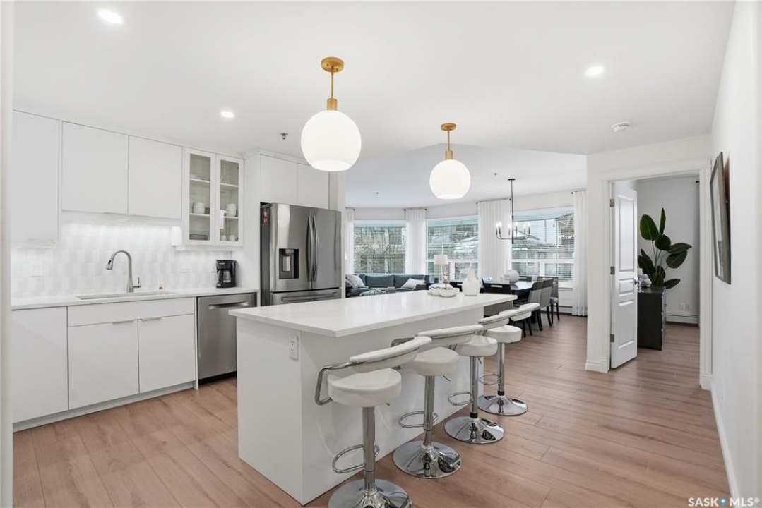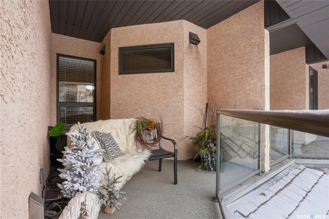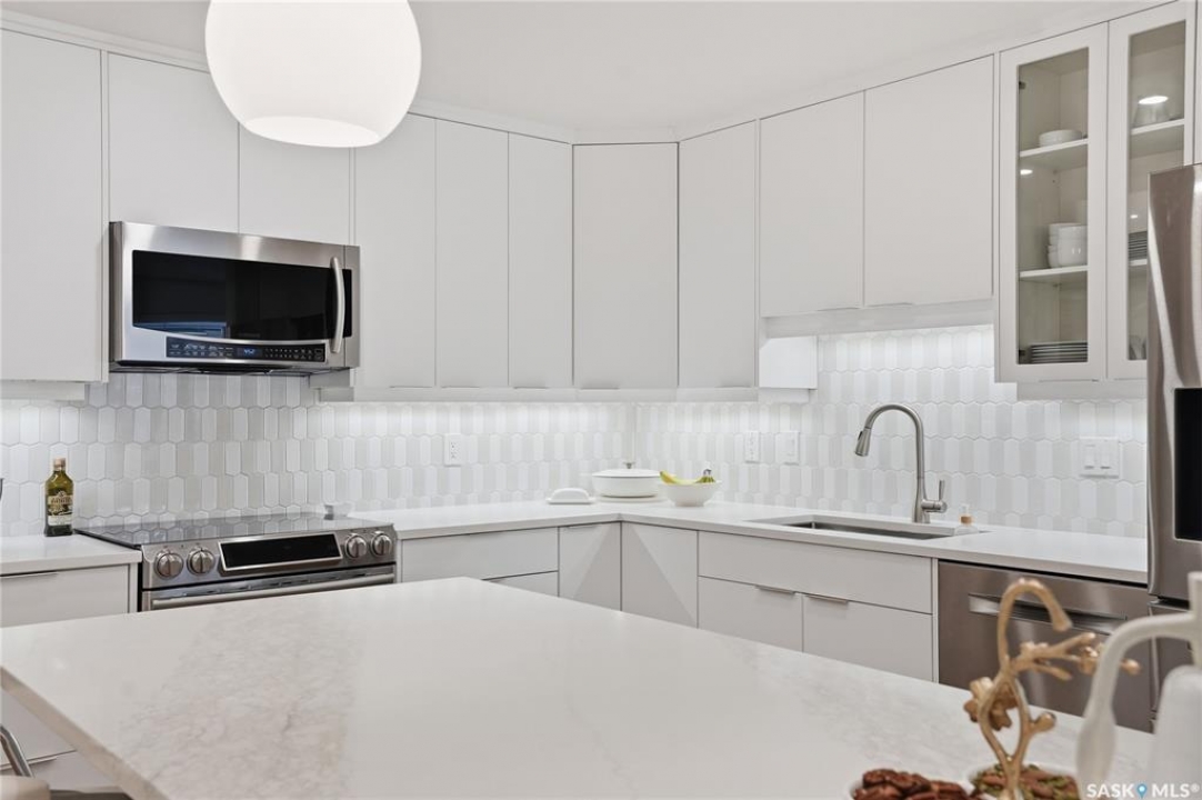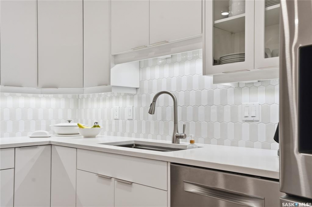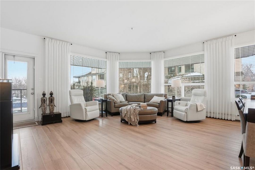 Wow!With so many upgrades, this unit shows almost like new! Truly a rare find on prestigious Sask Crescent. Stunning 1,418 sq ft, 3-bedroom main floor corner unit and a former show suite located in a quiet, well-managed complex. Enjoy beautiful river views in the fall and winter, impressive 9' ceilings, and large panoramic windows that fill the home with natural light. This home has undergone extensive renovations and rebuilding, creating a refreshed interior that feels almost brand new. Major Interior Renovations (2025): Approximately 90% of the drywall replaced New electrical wiring and upgraded panel Redone ceilings and updated insulation 9-inch luxury vinyl plank flooring throughout (no off-gassing) Stunning Kitchen Renovation (2025): The beautifully upgraded kitchen features quartz countertops, modern backsplash, high-end appliances, soft-close cabinetry, and a sleek contemporary design, creating a bright and highly functional cooking space. Bathroom Upgrades(2025): Both bathrooms have been refreshed, including a fully renovated ensuite with a brand-new shower, vanity, mirrors, and modern finishes. Additional Interior Improvements Include(2025): Updated doors, trim, and baseboards. New lighting fixtures and backsplash. Upgraded vanity countertop, Custom laundry cabinetry ($6,000 upgrade). Premium Miele washer & dryer Window Coverings & Finishing Touches(2025): Hunter Douglas blinds ($4,300) Custom drapery in the living room and bedroom With extensive structural and cosmetic upgrades, this beautifully refreshed home offers the feel of a newly rebuilt interior in one of Saskatoon's most desirable locations on Sask Crescent.