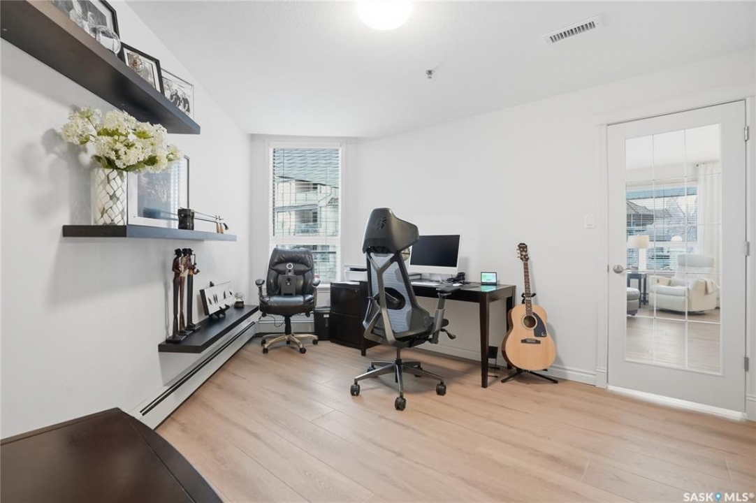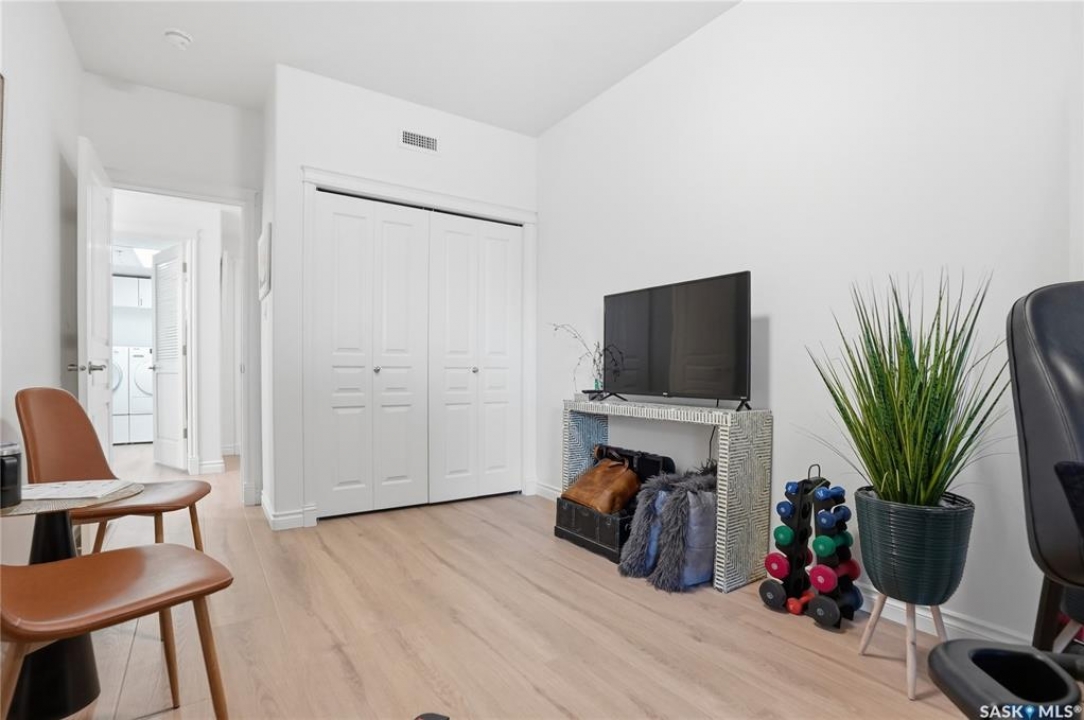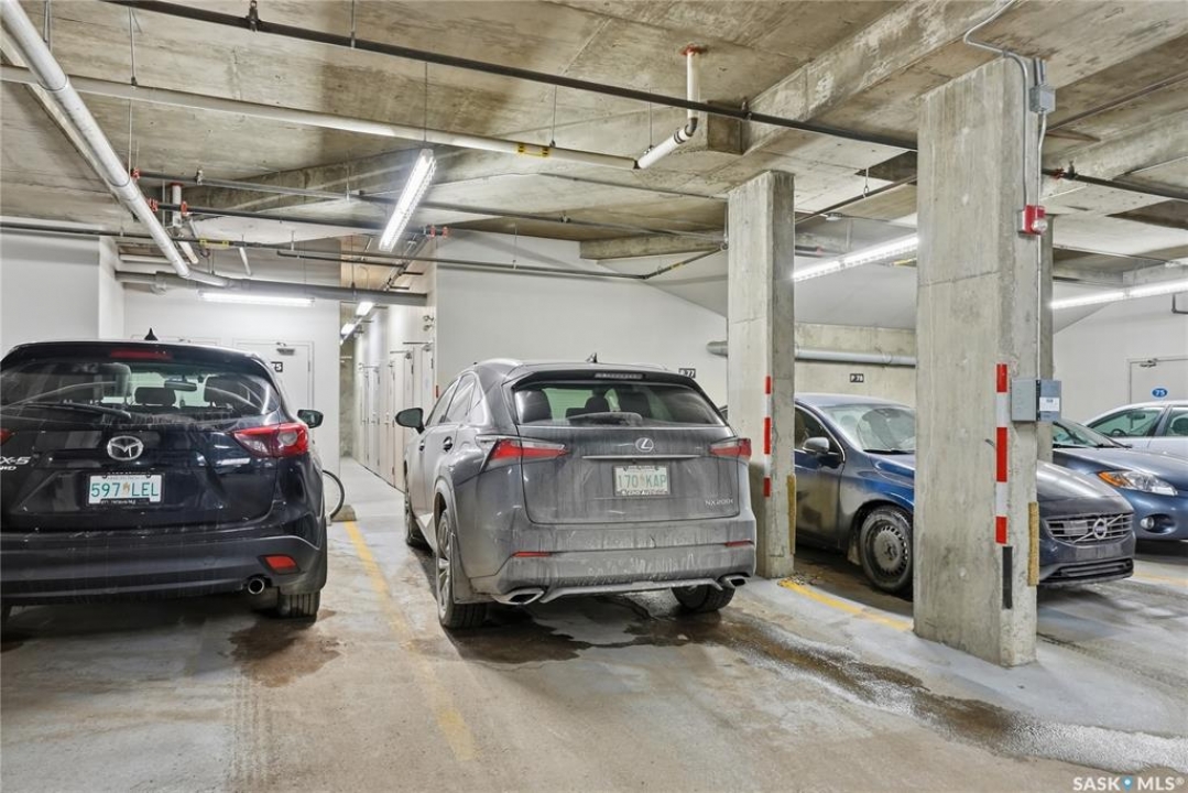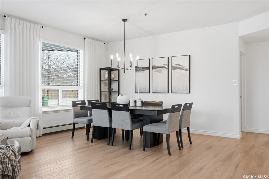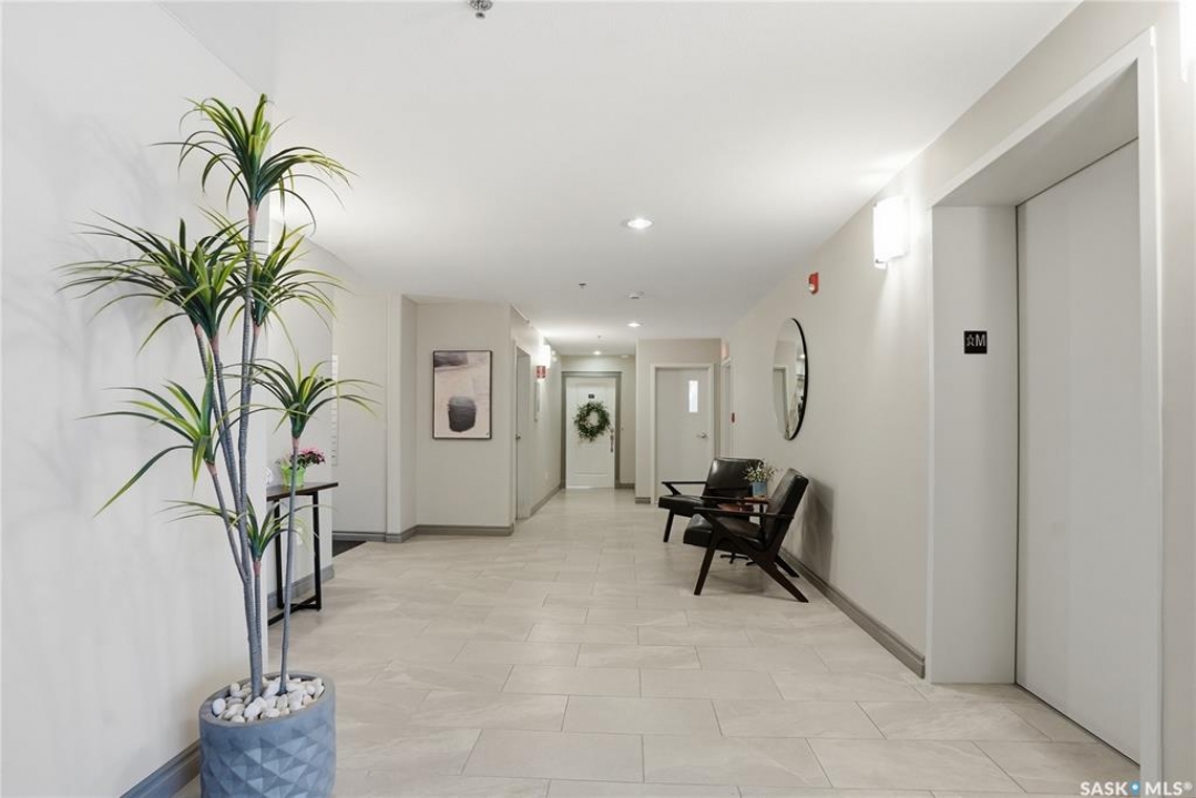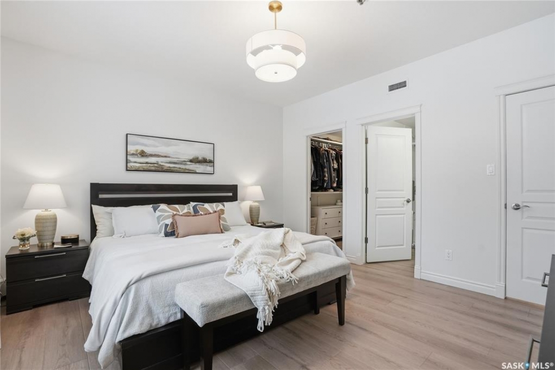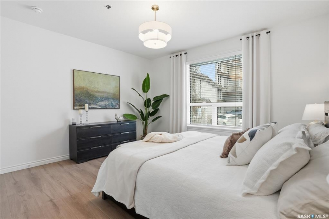 Wow!With so many upgrades, this unit shows almost like new! Truly a rare find on prestigious Sask Crescent. Stunning 1,418 sq ft, 3-bedroom main floor corner unit and a former show suite located in a quiet, well-managed complex. Enjoy beautiful river views in the fall and winter, impressive 9' ceilings, and large panoramic windows that fill the home with natural light. This home has undergone extensive renovations and rebuilding, creating a refreshed interior that feels almost brand new. Major Interior Renovations (2025): Approximately 90% of the drywall replaced New electrical wiring and upgraded panel Redone ceilings and updated insulation 9-inch luxury vinyl plank flooring throughout (no off-gassing) Stunning Kitchen Renovation (2025): The beautifully upgraded kitchen features quartz countertops, modern backsplash, high-end appliances, soft-close cabinetry, and a sleek contemporary design, creating a bright and highly functional cooking space. Bathroom Upgrades(2025): Both bathrooms have been refreshed, including a fully renovated ensuite with a brand-new shower, vanity, mirrors, and modern finishes. Additional Interior Improvements Include(2025): Updated doors, trim, and baseboards. New lighting fixtures and backsplash. Upgraded vanity countertop, Custom laundry cabinetry ($6,000 upgrade). Premium Miele washer & dryer Window Coverings & Finishing Touches(2025): Hunter Douglas blinds ($4,300) Custom drapery in the living room and bedroom With extensive structural and cosmetic upgrades, this beautifully refreshed home offers the feel of a newly rebuilt interior in one of Saskatoon's most desirable locations on Sask Crescent.