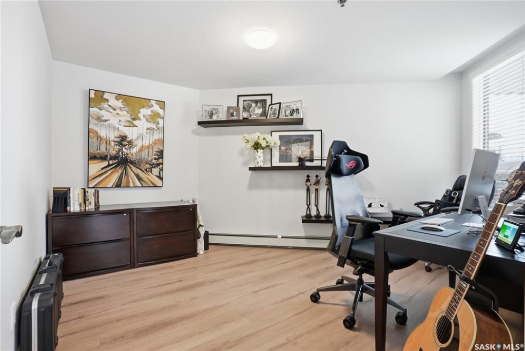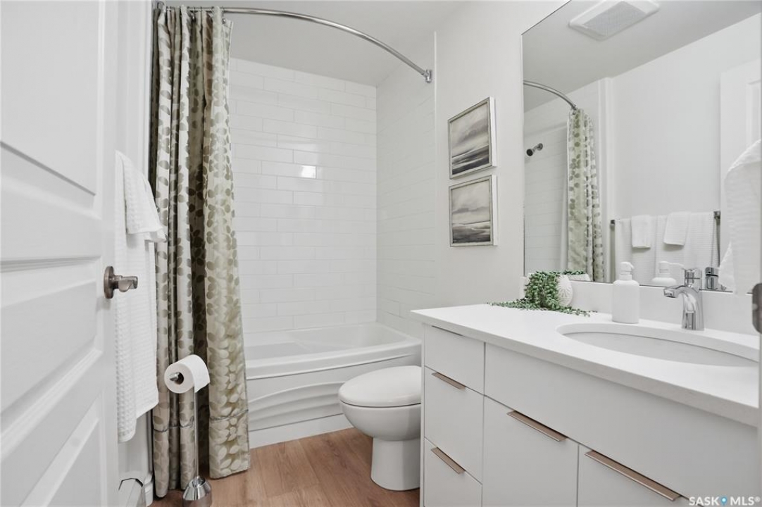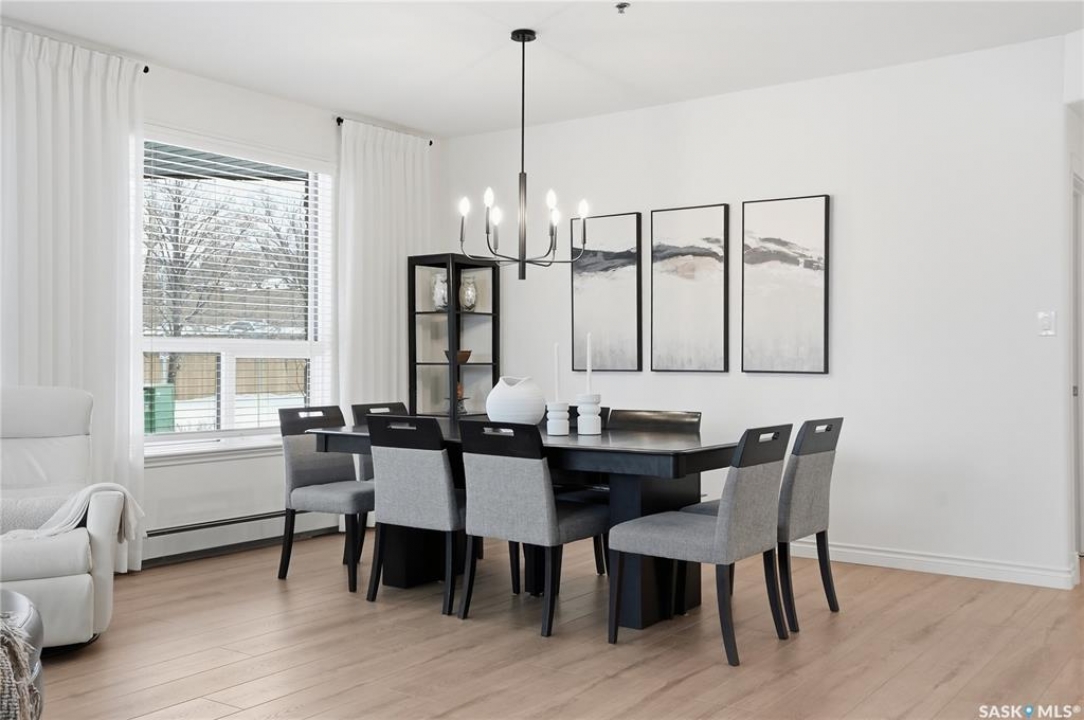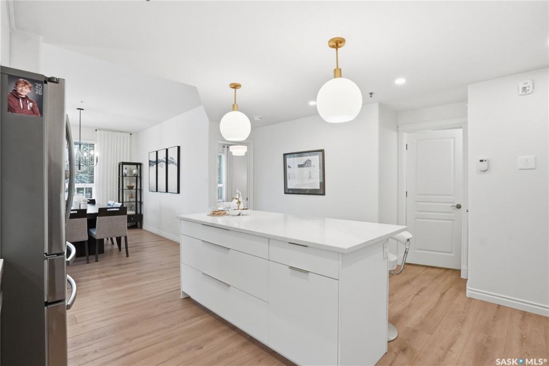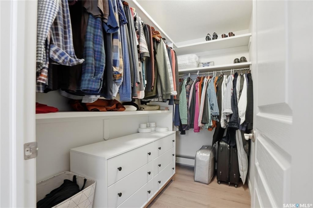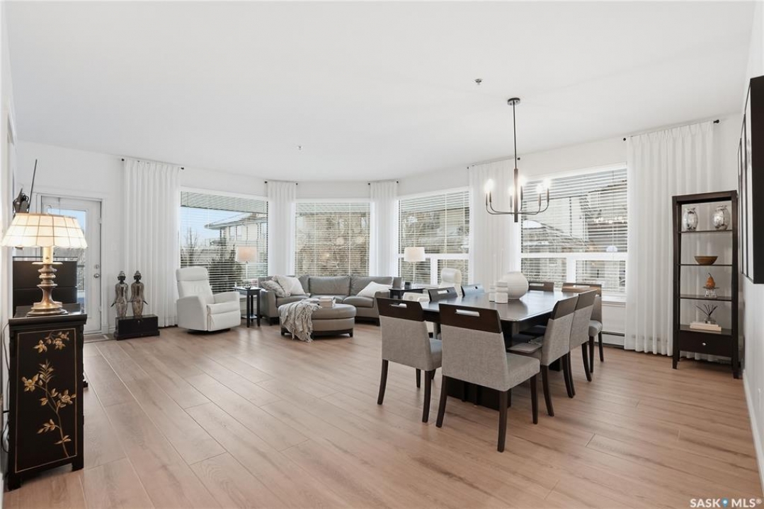 Wow!With so many upgrades, this unit shows almost like new! Truly a rare find on prestigious Sask Crescent. Stunning 1,418 sq ft, 3-bedroom main floor corner unit and a former show suite located in a quiet, well-managed complex. Enjoy beautiful river views in the fall and winter, impressive 9' ceilings, and large panoramic windows that fill the home with natural light. This home has undergone extensive renovations and rebuilding, creating a refreshed interior that feels almost brand new. Major Interior Renovations (2025): Approximately 90% of the drywall replaced New electrical wiring and upgraded panel Redone ceilings and updated insulation 9-inch luxury vinyl plank flooring throughout (no off-gassing) Stunning Kitchen Renovation (2025): The beautifully upgraded kitchen features quartz countertops, modern backsplash, high-end appliances, soft-close cabinetry, and a sleek contemporary design, creating a bright and highly functional cooking space. Bathroom Upgrades(2025): Both bathrooms have been refreshed, including a fully renovated ensuite with a brand-new shower, vanity, mirrors, and modern finishes. Additional Interior Improvements Include(2025): Updated doors, trim, and baseboards. New lighting fixtures and backsplash. Upgraded vanity countertop, Custom laundry cabinetry ($6,000 upgrade). Premium Miele washer & dryer Window Coverings & Finishing Touches(2025): Hunter Douglas blinds ($4,300) Custom drapery in the living room and bedroom With extensive structural and cosmetic upgrades, this beautifully refreshed home offers the feel of a newly rebuilt interior in one of Saskatoon's most desirable locations on Sask Crescent.