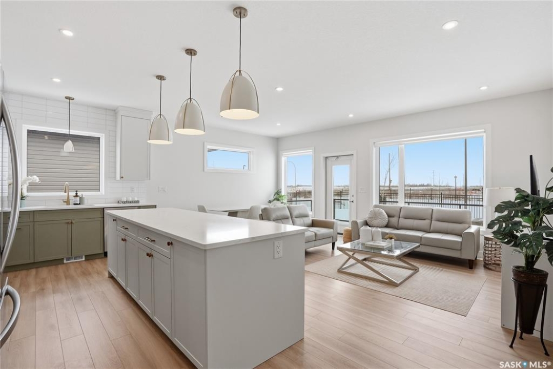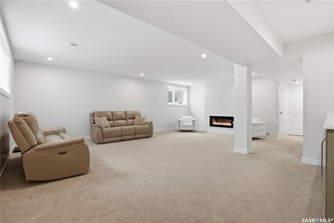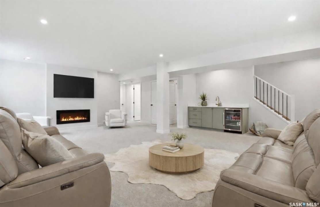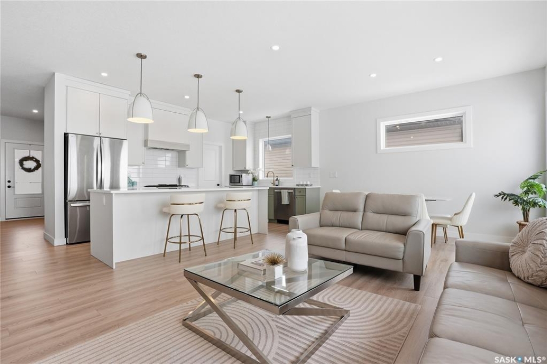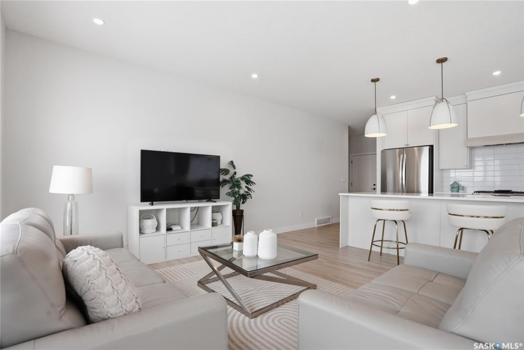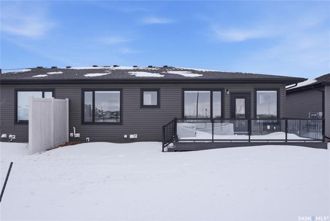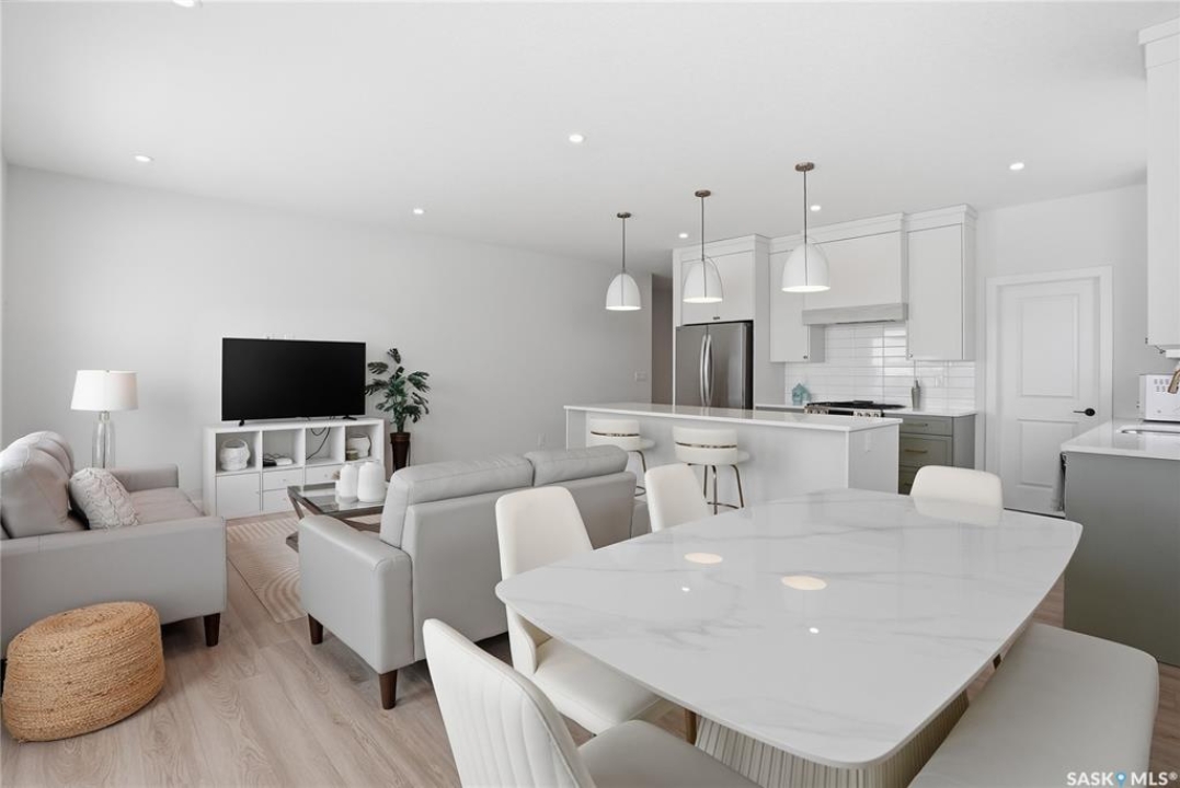 Welcome to Unit #20-515 Delainey located in “Ari by North Ridge” in the sought-after community of Brighton. This like-new, south GREEN SPACE BACKING bungalow style condominium offers 1286 sq ft on the main floor with a beautifully developed lower level and thoughtful upgrades throughout. The customized floorplan offers an excellent layout with bright open living spaces and quality finishes. The kitchen is a standout, featuring full height 9' cabinetry with cabinet lighting, quartz countertops, tile backsplash, a large central island, tiled backsplash, stainless appliances including a gas range, and a well-designed workspace that connects seamlessly to the dining and living areas. The main floor also features a spacious primary suite with lux ensuite, a second bedroom and full bath, plus a separate laundry room w/ built-in shelving. Additional upgrades are evident throughout including upgraded trim work, tile work and upgraded lighting and plumbing fixtures. The fully developed lower level adds impressive additional living space with two large bedrooms (with bright windows), a full 3-piece bathroom, and a beautiful recreation room featuring a linear feature fireplace and a wet bar with mini fridge — a fantastic space for relaxing or entertaining. Additional upgrades include custom window coverings, Energyide,u/g sprinklers, central air, triple pane, and a high efficiency furnace. The 24' deep heated garage is insulated and drywalled. Outdoor living is a highlight with a sunny south facing composite deck (10' x 19') complete with glass railing, gas BBQ outlet, backing directly onto green space and walking paths. Located beside Bear Paw Park and just minutes to McOrmond Drive, this home offers excellent access to Brighton amenities while enjoying a quiet and beautiful setting. An exceptional opportunity for those looking for a stylish, low maintenance home in one of Saskatoon's most desirable neighbourhoods.