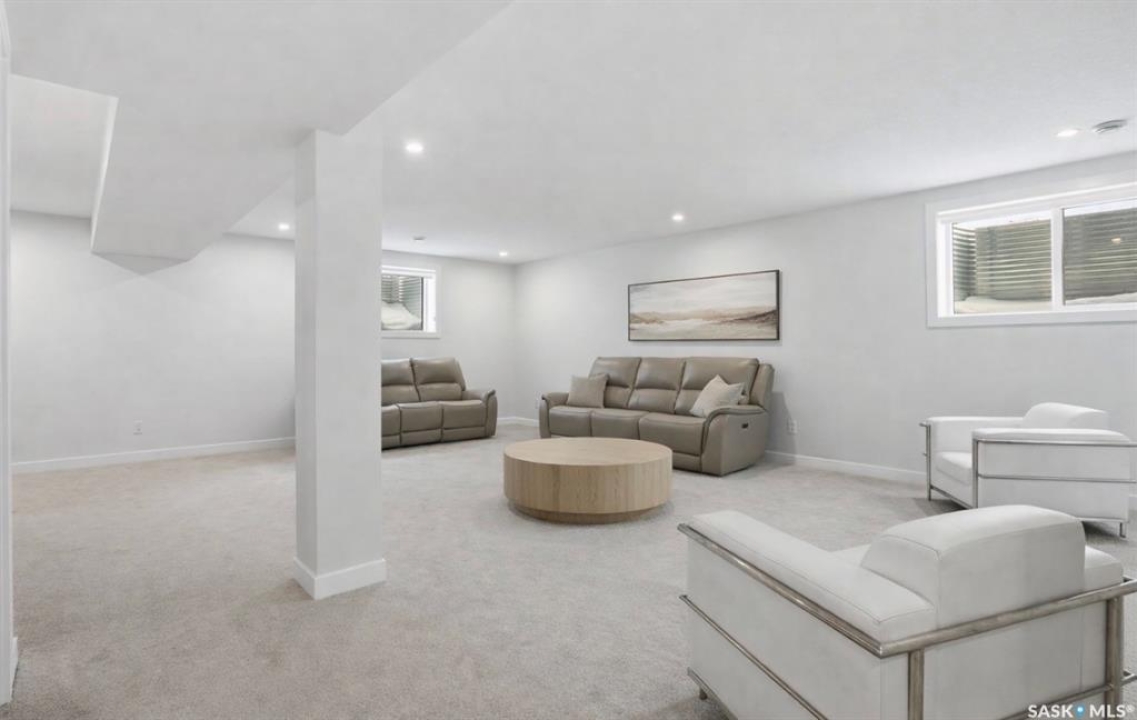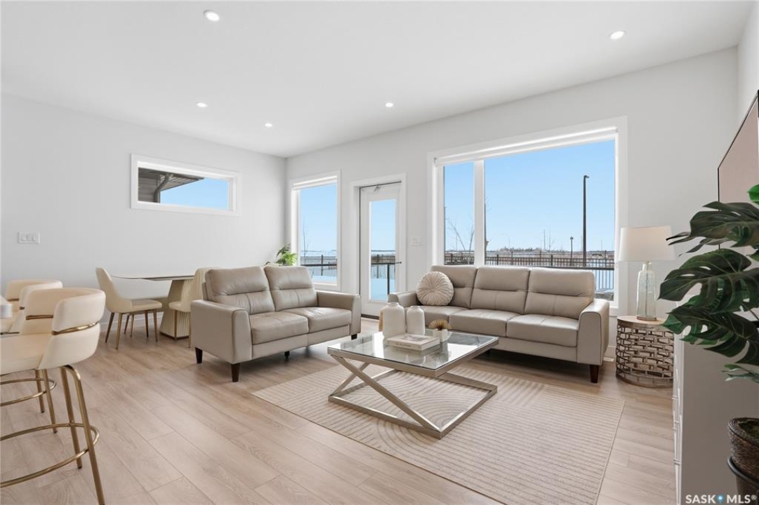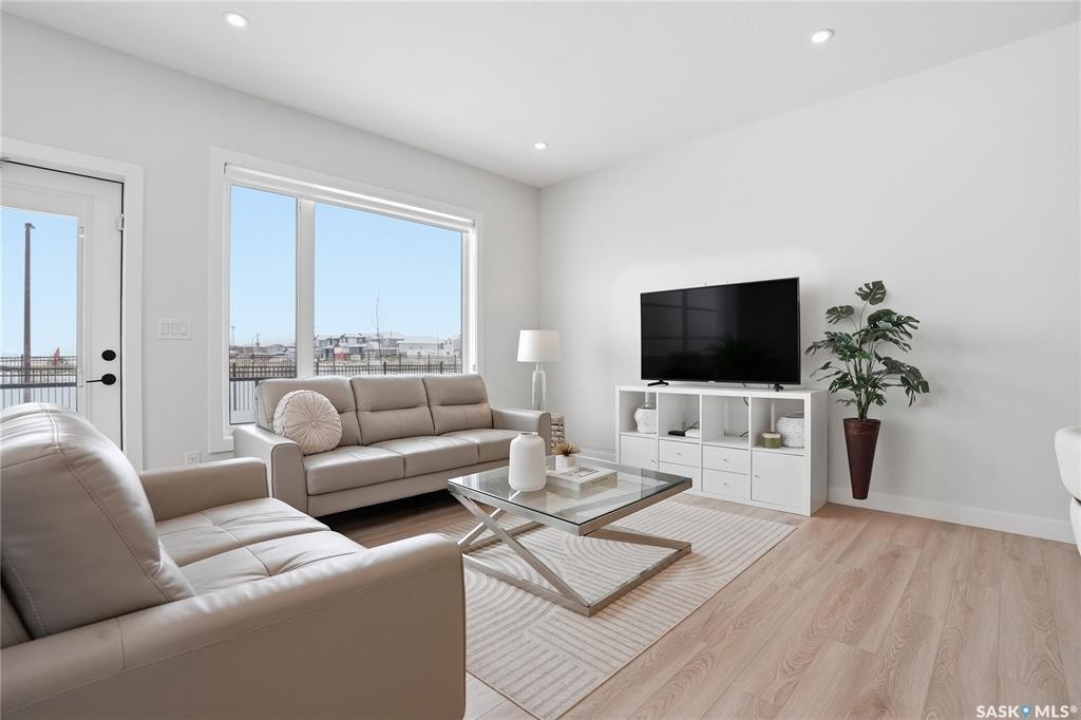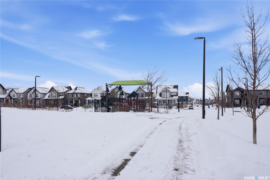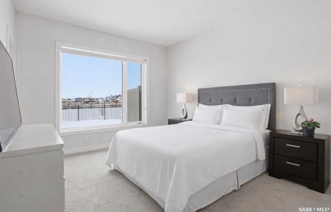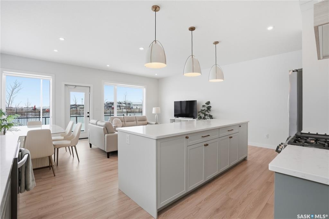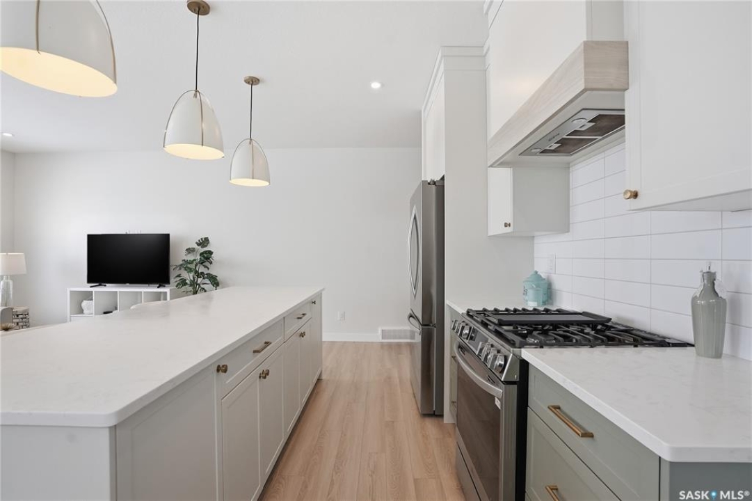 Welcome to Unit #20-515 Delainey located in “Ari by North Ridge” in the sought-after community of Brighton. This like-new, south GREEN SPACE BACKING bungalow style condominium offers 1286 sq ft on the main floor with a beautifully developed lower level and thoughtful upgrades throughout. The customized floorplan offers an excellent layout with bright open living spaces and quality finishes. The kitchen is a standout, featuring full height 9' cabinetry with cabinet lighting, quartz countertops, tile backsplash, a large central island, tiled backsplash, stainless appliances including a gas range, and a well-designed workspace that connects seamlessly to the dining and living areas. The main floor also features a spacious primary suite with lux ensuite, a second bedroom and full bath, plus a separate laundry room w/ built-in shelving. Additional upgrades are evident throughout including upgraded trim work, tile work and upgraded lighting and plumbing fixtures. The fully developed lower level adds impressive additional living space with two large bedrooms (with bright windows), a full 3-piece bathroom, and a beautiful recreation room featuring a linear feature fireplace and a wet bar with mini fridge — a fantastic space for relaxing or entertaining. Additional upgrades include custom window coverings, Energyide,u/g sprinklers, central air, triple pane, and a high efficiency furnace. The 24' deep heated garage is insulated and drywalled. Outdoor living is a highlight with a sunny south facing composite deck (10' x 19') complete with glass railing, gas BBQ outlet, backing directly onto green space and walking paths. Located beside Bear Paw Park and just minutes to McOrmond Drive, this home offers excellent access to Brighton amenities while enjoying a quiet and beautiful setting. An exceptional opportunity for those looking for a stylish, low maintenance home in one of Saskatoon's most desirable neighbourhoods.