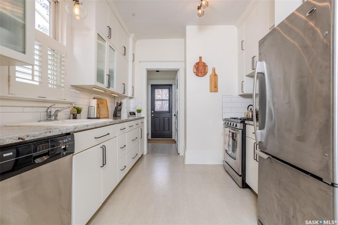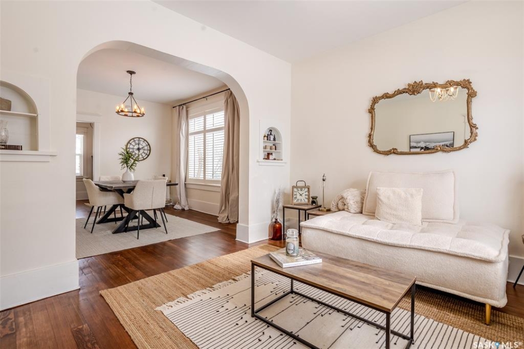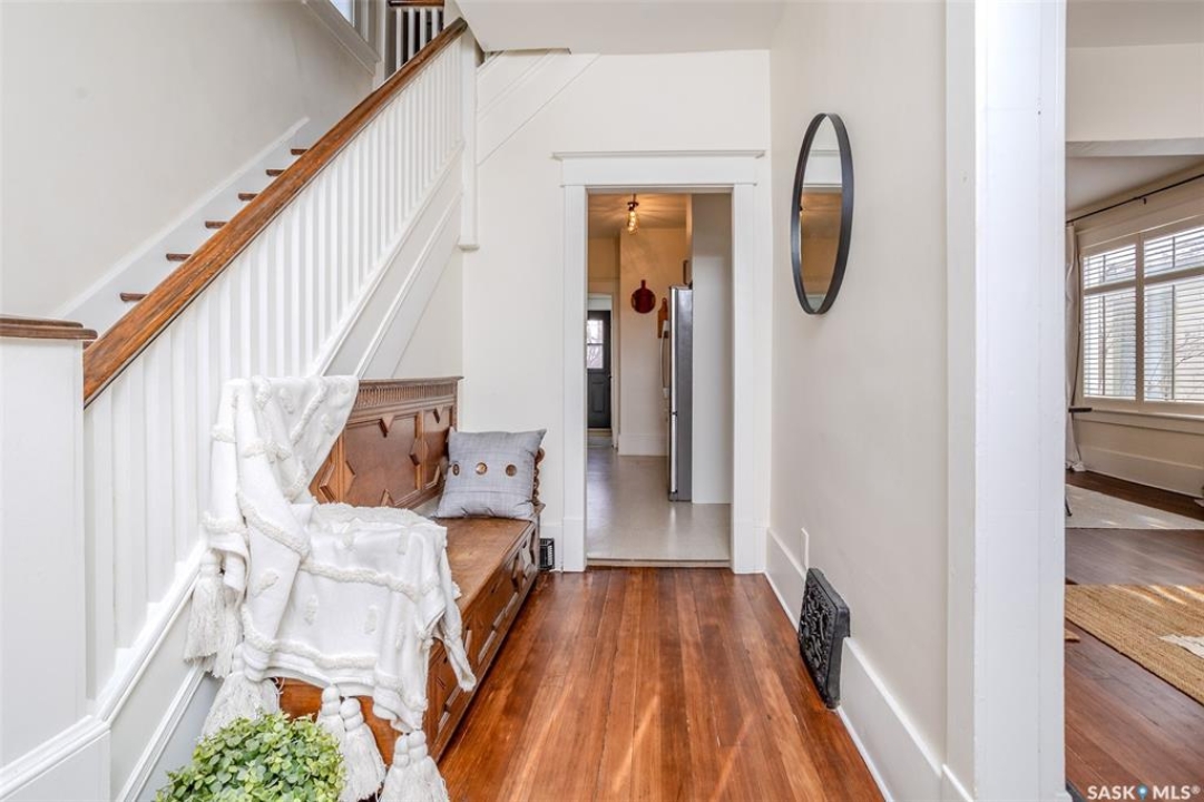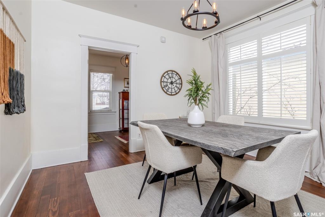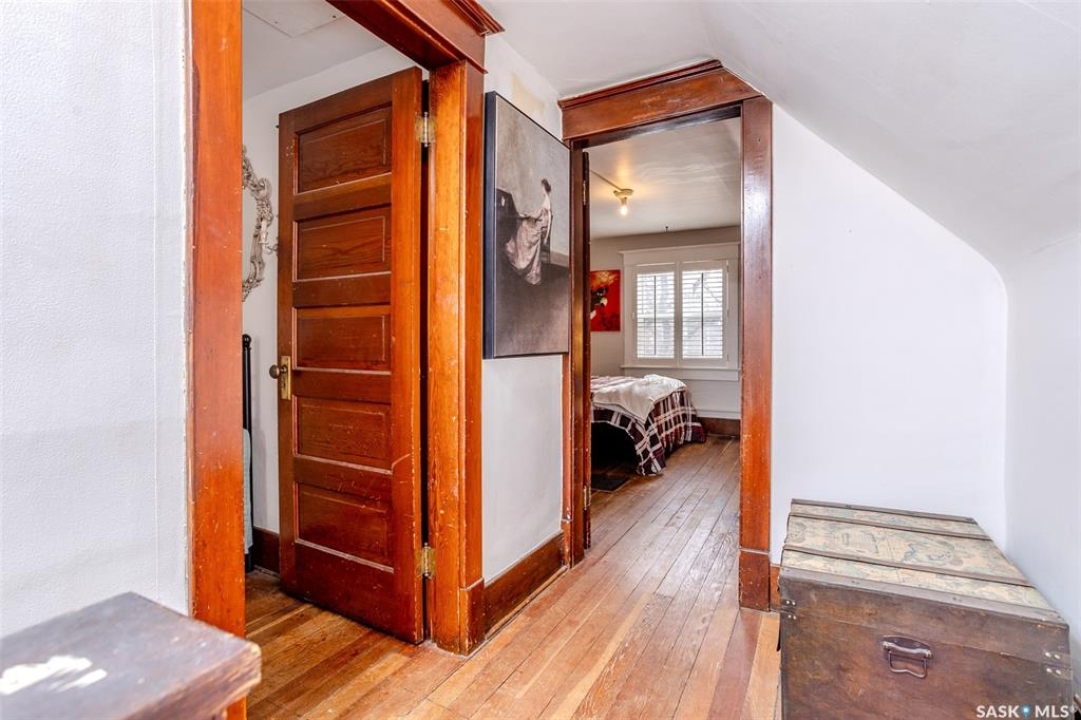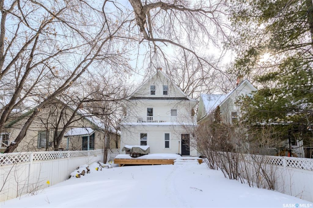 This timeless 2.5 storey character home in the coveted Nutana neighbourhood will not disappoint! The large foyer showcases the staircase and flows into a bright living room, semi formal dining area and a versatile back office or reading nook with convenient powder room. The galley kitchen is functional and well appointed with a gas range, tile backsplash, under cabinet lighting, built in dishwasher and plenty of cabinetry. The second level features two comfortable bedrooms along with a charming sitting room or library with built in shelving, creating the perfect place to relax or read. The beautifully refreshed four piece bathroom includes a claw foot tub, elegant wall sconces, updated wallpaper and access to a Juliet balcony overlooking the backyard. The third level provides two additional bedrooms, offering flexibility for family, guests or home office space. The basement is partially developed and includes a newer three piece bathroom, a den that works well as a hobby room or guest area, and a large utility and laundry space that provides excellent storage. Recent improvements include new furnace (2019), washer/dryer/fridge (2019), windows and exterior doors (2019), exterior paint (2019), electrical update & service extended to garage (2020), new blinds and shutters (2020), interior paint (2023), complete lead pipes replaced (2023), basement bathroom (2024), new detached garage (2024), main floor hardwood refinish (2025), deck (2025), backyard regraded (2025), second floor bathroom update (2025). Located just steps off Broadway Avenue and only minutes to the river valley trails and downtown Saskatoon, this home offers the best of Nutana living with tree lined streets, historic charm and easy access to some of the city's best shops, restaurants and amenities. With extensive upgrades already completed and timeless character preserved, this move in ready home offers a rare opportunity to enjoy classic Nutana charm with the comfort and reliability of modern updates.