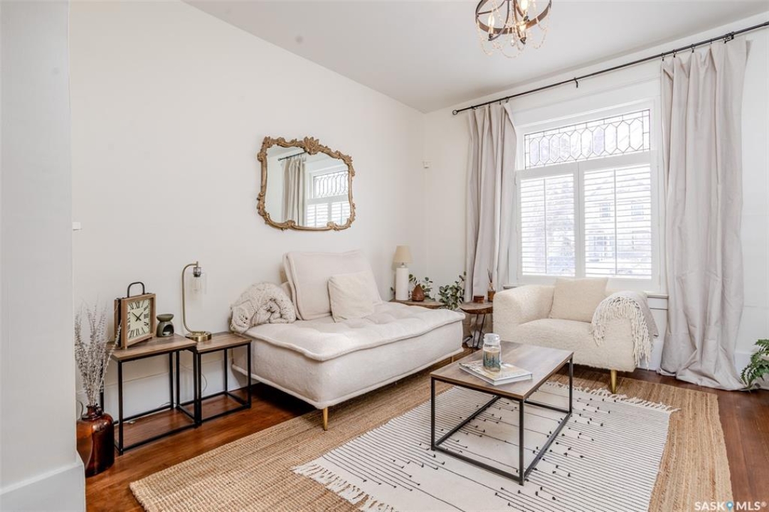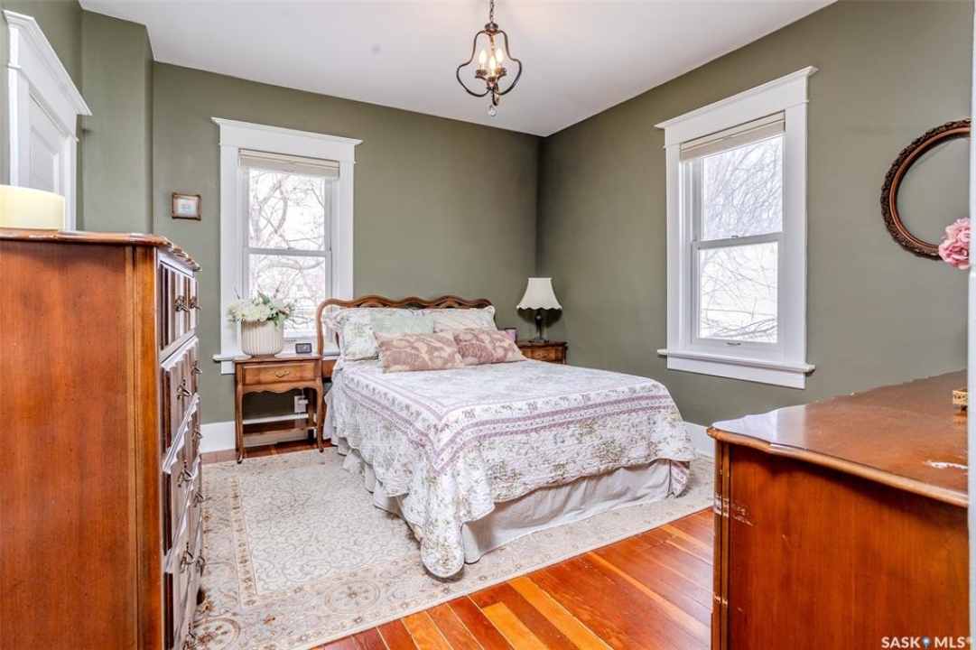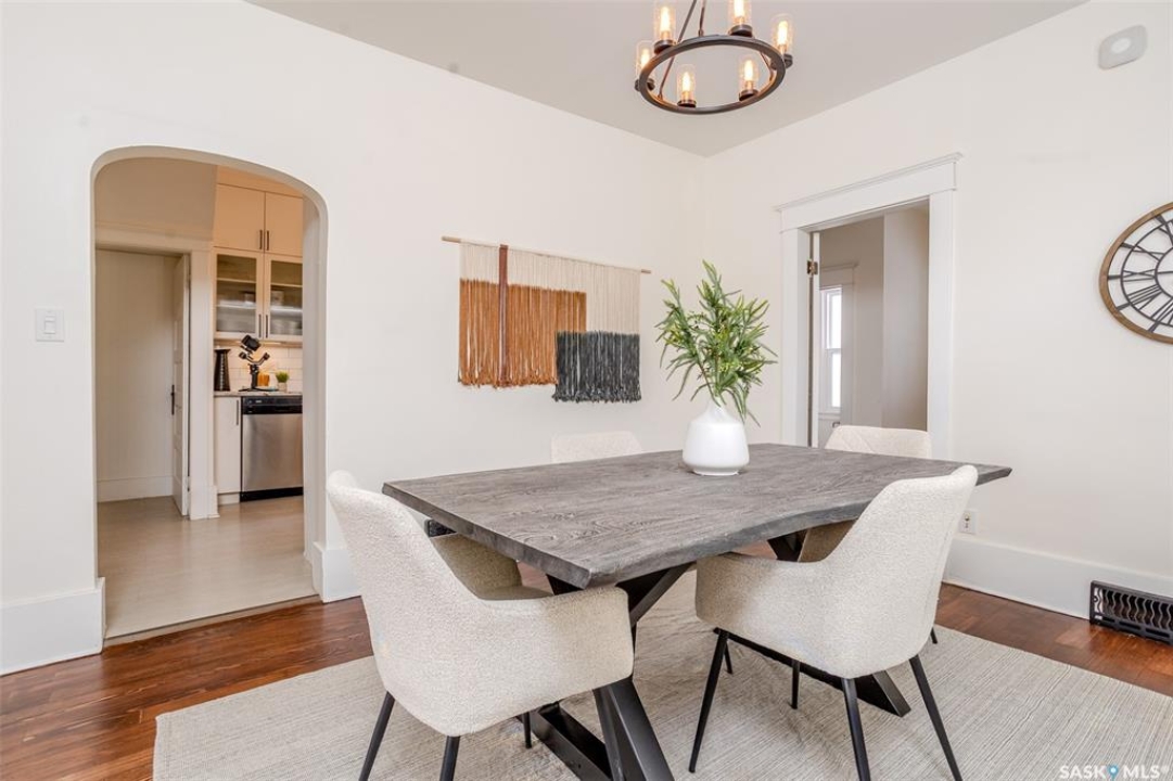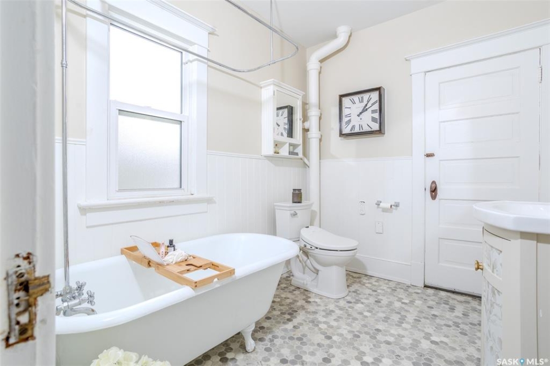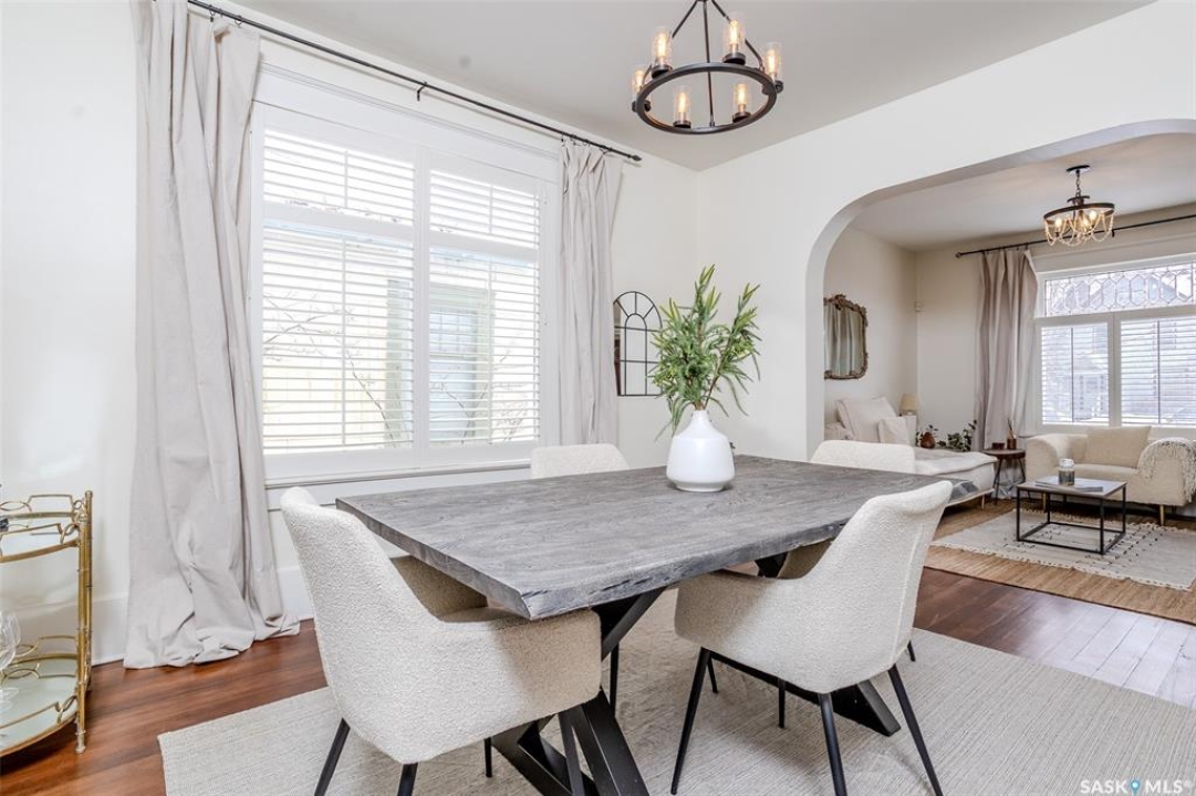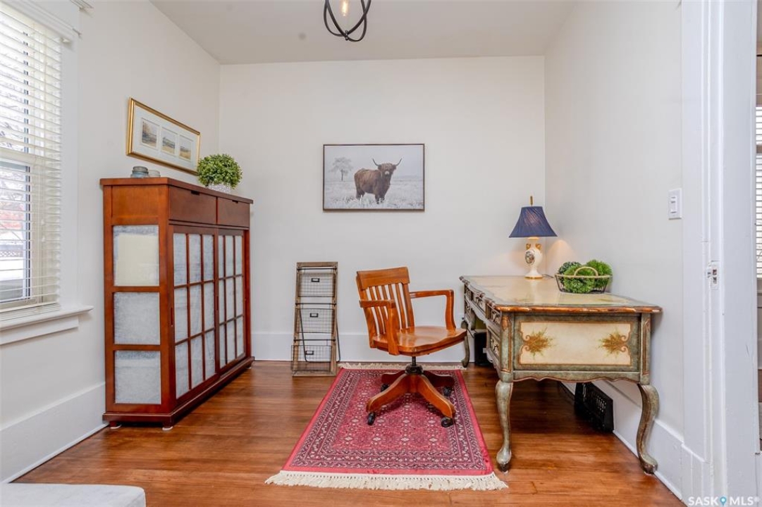 This timeless 2.5 storey character home in the coveted Nutana neighbourhood will not disappoint! The large foyer showcases the staircase and flows into a bright living room, semi formal dining area and a versatile back office or reading nook with convenient powder room. The galley kitchen is functional and well appointed with a gas range, tile backsplash, under cabinet lighting, built in dishwasher and plenty of cabinetry. The second level features two comfortable bedrooms along with a charming sitting room or library with built in shelving, creating the perfect place to relax or read. The beautifully refreshed four piece bathroom includes a claw foot tub, elegant wall sconces, updated wallpaper and access to a Juliet balcony overlooking the backyard. The third level provides two additional bedrooms, offering flexibility for family, guests or home office space. The basement is partially developed and includes a newer three piece bathroom, a den that works well as a hobby room or guest area, and a large utility and laundry space that provides excellent storage. Recent improvements include new furnace (2019), washer/dryer/fridge (2019), windows and exterior doors (2019), exterior paint (2019), electrical update & service extended to garage (2020), new blinds and shutters (2020), interior paint (2023), complete lead pipes replaced (2023), basement bathroom (2024), new detached garage (2024), main floor hardwood refinish (2025), deck (2025), backyard regraded (2025), second floor bathroom update (2025). Located just steps off Broadway Avenue and only minutes to the river valley trails and downtown Saskatoon, this home offers the best of Nutana living with tree lined streets, historic charm and easy access to some of the city's best shops, restaurants and amenities. With extensive upgrades already completed and timeless character preserved, this move in ready home offers a rare opportunity to enjoy classic Nutana charm with the comfort and reliability of modern updates.