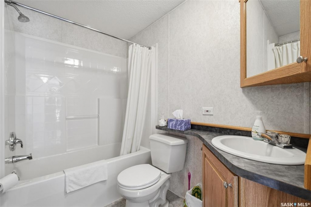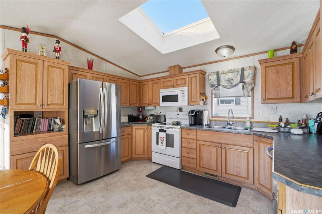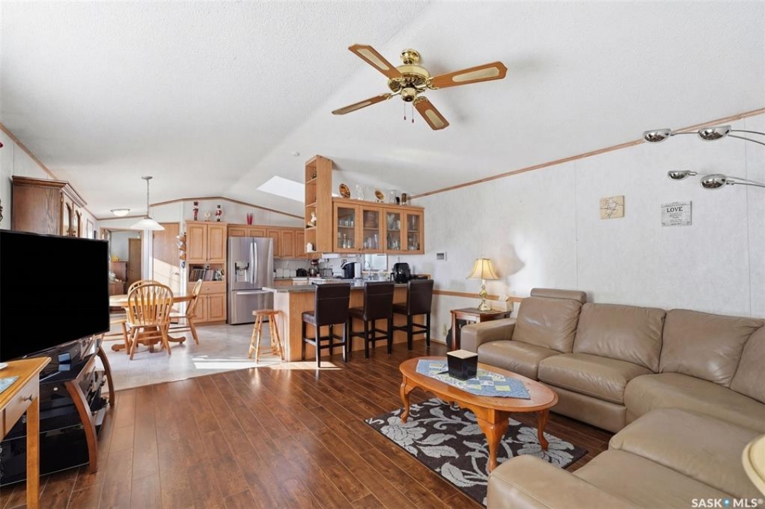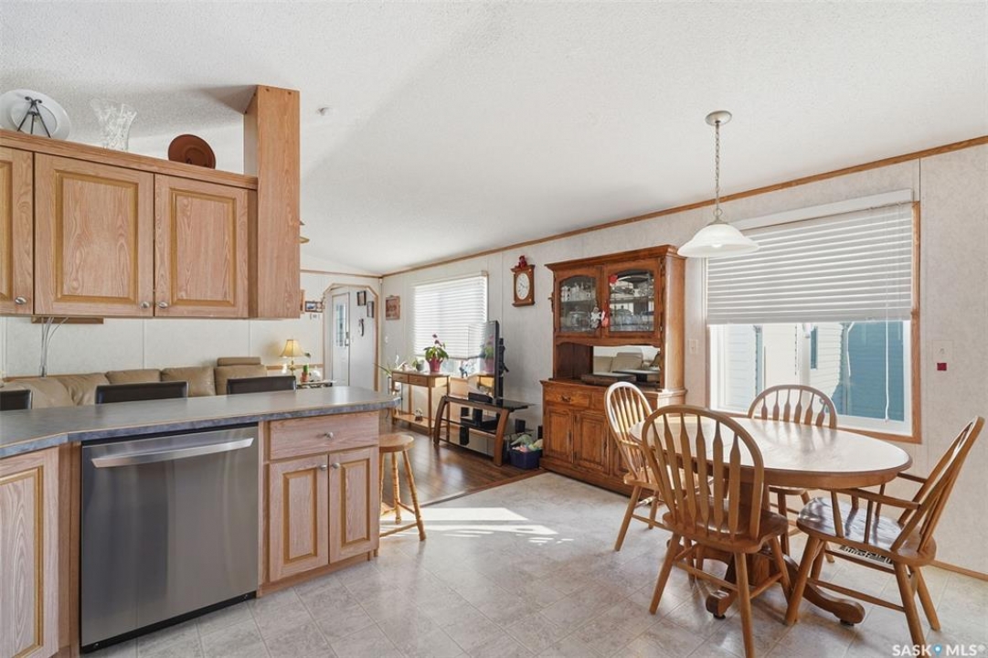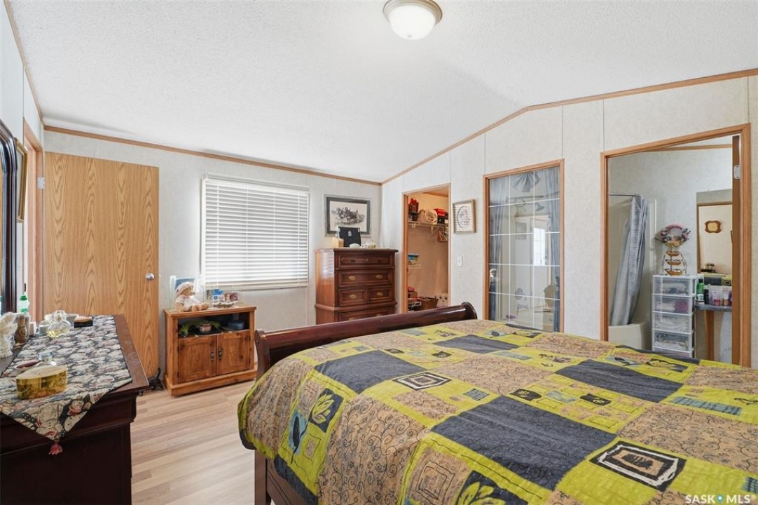 Escape the hustle and bustle of city living without sacrificing convenience or affordability! Located just minutes from Saskatoon, this well-maintained 2006 SRI-built modular home offers 1,216 sq. ft. of comfortable living space in the welcoming community of Sunset Estates Mobile Home Park, less than 10 minutes east of Saskatoon off Highway 5. Situated on a 50' x 100' leased lot backing directly onto a play park, this home offers a peaceful setting with plenty of room for families to enjoy. Inside, you'll appreciate the bright and open layout featuring cathedral ceilings and a spacious open-concept kitchen, dining, and living area—perfect for everyday living and entertaining. The thoughtfully designed floor plan includes 3 bedrooms and 2 full bathrooms. Two bedrooms and a 4-piece bathroom are located at the front of the home, while the private primary suite at the back features a walk-in closet and a large 4-piece ensuite. A generous laundry/utility room adds extra functionality and storage. Outside, the property includes a 14' x 26' garage, a deck, garden shed, and a double-wide driveway (half paved, half gravel). Additional features include central air conditioning, built-in dishwasher, fridge, stove, hood fan, all existing window coverings, and an automatic garage door opener—making this home truly move-in ready. Residents of Sunset Estates enjoy convenient on-site amenities including a gas station, convenience store, community centre, rental office, and playground area. Lot rent is $725/mo as well as the $80/mo RM fee & $45/mo water levy. Buyers must obtain park approval from management as a condition of purchase and verify current lot fees. If you've been looking for affordable living close to the city with a quieter lifestyle, this is a fantastic opportunity worth seeing!