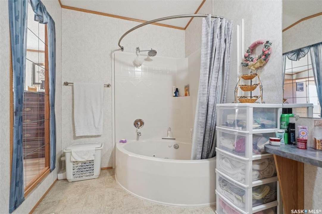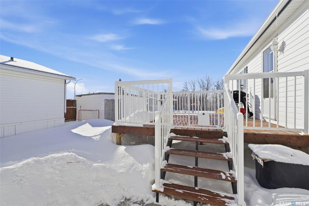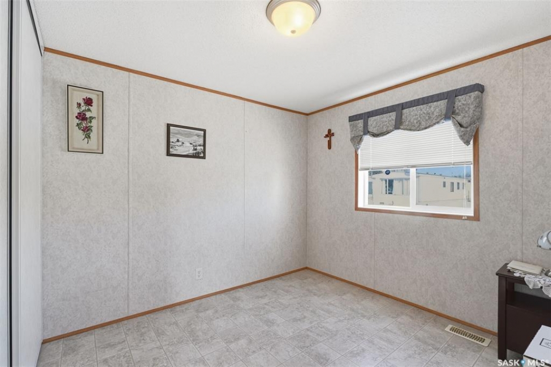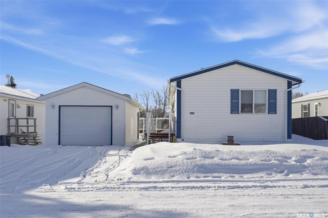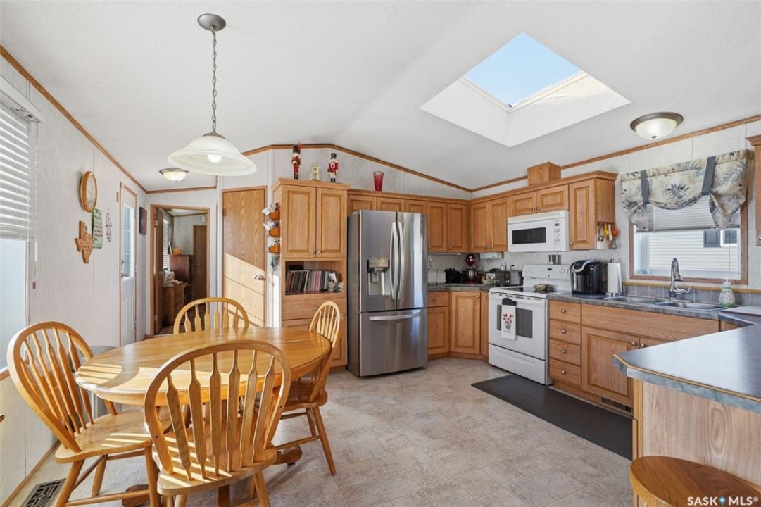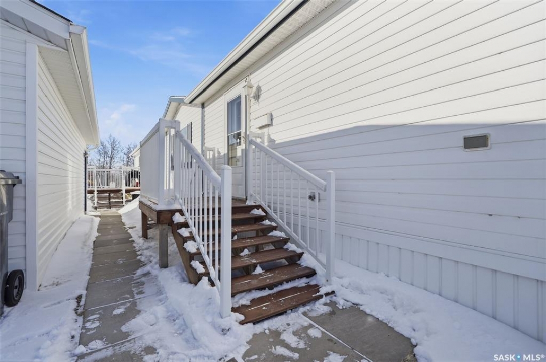 Escape the hustle and bustle of city living without sacrificing convenience or affordability! Located just minutes from Saskatoon, this well-maintained 2006 SRI-built modular home offers 1,216 sq. ft. of comfortable living space in the welcoming community of Sunset Estates Mobile Home Park, less than 10 minutes east of Saskatoon off Highway 5. Situated on a 50' x 100' leased lot backing directly onto a play park, this home offers a peaceful setting with plenty of room for families to enjoy. Inside, you'll appreciate the bright and open layout featuring cathedral ceilings and a spacious open-concept kitchen, dining, and living area—perfect for everyday living and entertaining. The thoughtfully designed floor plan includes 3 bedrooms and 2 full bathrooms. Two bedrooms and a 4-piece bathroom are located at the front of the home, while the private primary suite at the back features a walk-in closet and a large 4-piece ensuite. A generous laundry/utility room adds extra functionality and storage. Outside, the property includes a 14' x 26' garage, a deck, garden shed, and a double-wide driveway (half paved, half gravel). Additional features include central air conditioning, built-in dishwasher, fridge, stove, hood fan, all existing window coverings, and an automatic garage door opener—making this home truly move-in ready. Residents of Sunset Estates enjoy convenient on-site amenities including a gas station, convenience store, community centre, rental office, and playground area. Lot rent is $725/mo as well as the $80/mo RM fee & $45/mo water levy. Buyers must obtain park approval from management as a condition of purchase and verify current lot fees. If you've been looking for affordable living close to the city with a quieter lifestyle, this is a fantastic opportunity worth seeing!