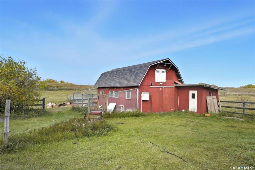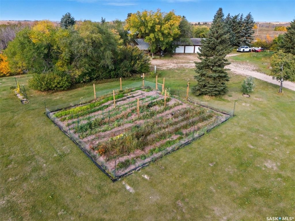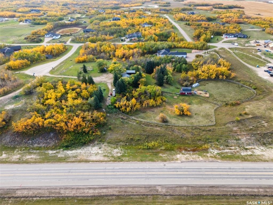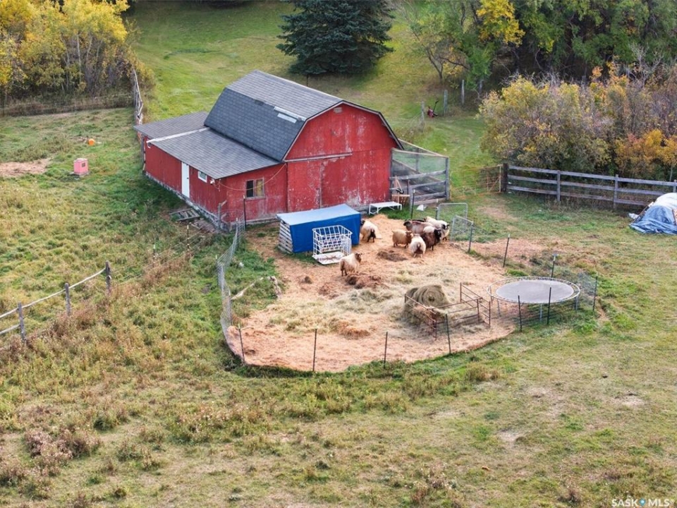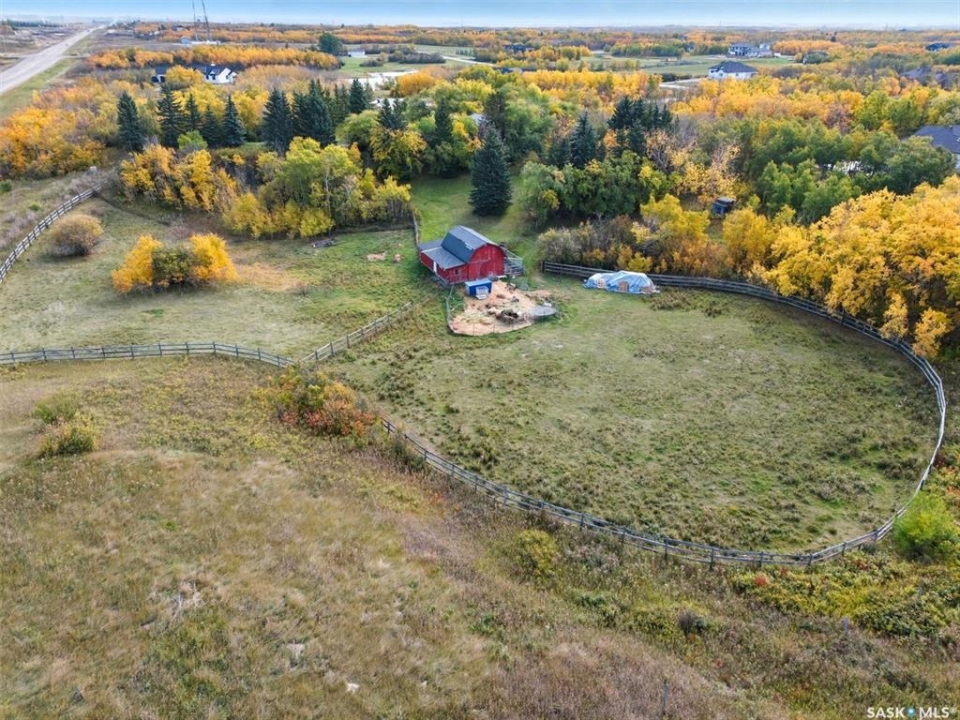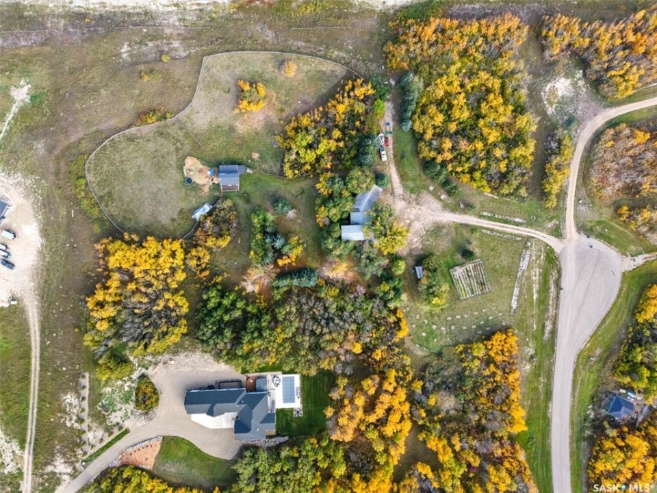Acreage living just 7 minutes from Saskatoon! Welcome to 203 Spur Way in Saddle Ridge Estates — a charming 1.5- storey home on 4.99 acres in the rolling hills. This 4-bedroom, 2-bath home offers warmth, functionality, and space to grow — inside and out. The main floor features hardwood floors, a spacious kitchen with quartz counters, soft maple cabinetry, and matching appliances. The living room flows to the deck through patio doors, making entertaining a breeze. Cozy up downstairs by the gas fireplace, or retreat to the stunning loft bedroom via the oak spiral staircase, complete with Juliette balcony. Enjoy updated central A/C, windows and front door (all within the last 2 years), and a triple attached garage. The acreage includes a barn with box stall, water, tack room, and loft — perfect for horses, storage, or a studio. Now for the showstopper: a thoughtfully planned food forest with 25+ varieties including apple, plum, cherry, pear, grape, haskap, raspberry, kiwi, seabuckthorn, hazelnut, herbs, strawberries, and even asparagus. Over 70 haskaps, 65 asparagus, and dozens of fruit trees, all mulched, edged, and connected by a line watering system. A fenced 200m2 no-till garden produces enough vegetables for full seasonal self-sufficiency. Serviced with city water, septic mound, Fiber Optic internet with Prairie Crocus, school bus access to Clavet, and fully paved development - this property offers a rare blend of rural privacy and urban access. Acreages like this — with natural abundance, modern comfort, and easy commuting — are truly one of a kind.