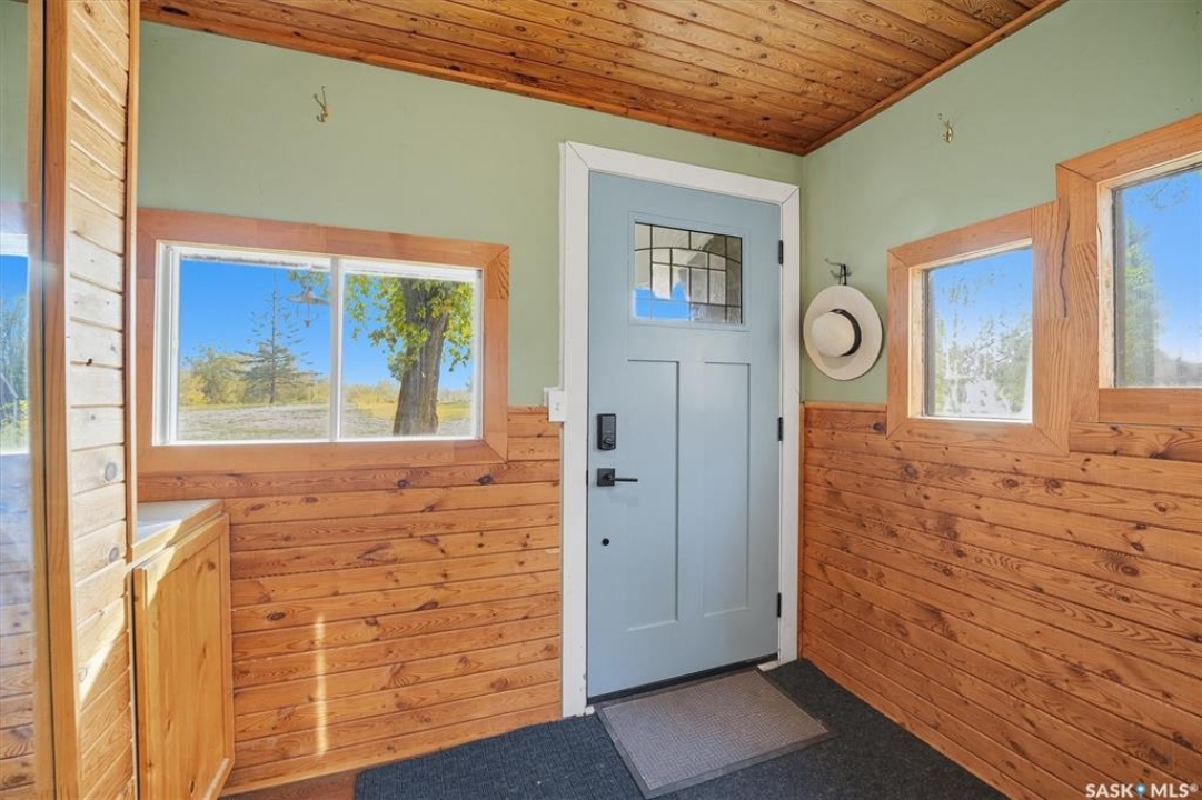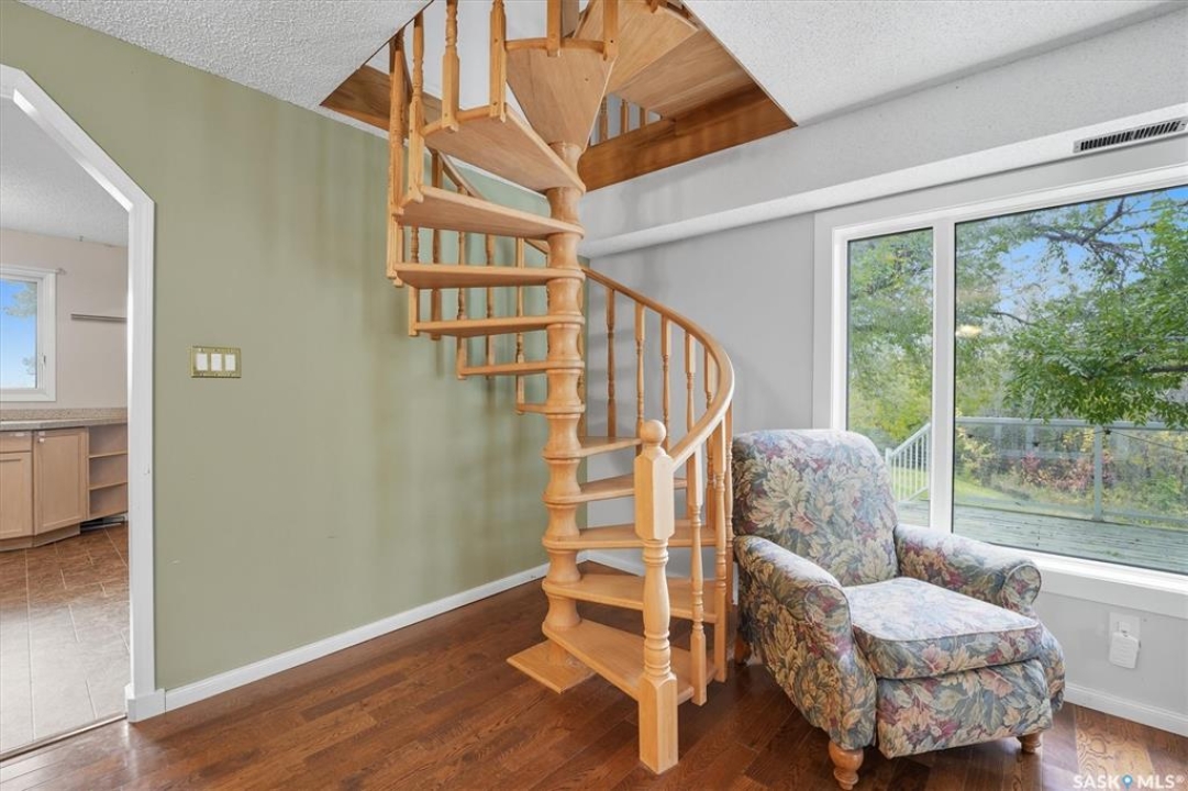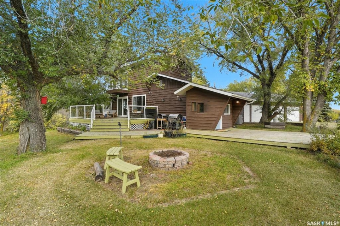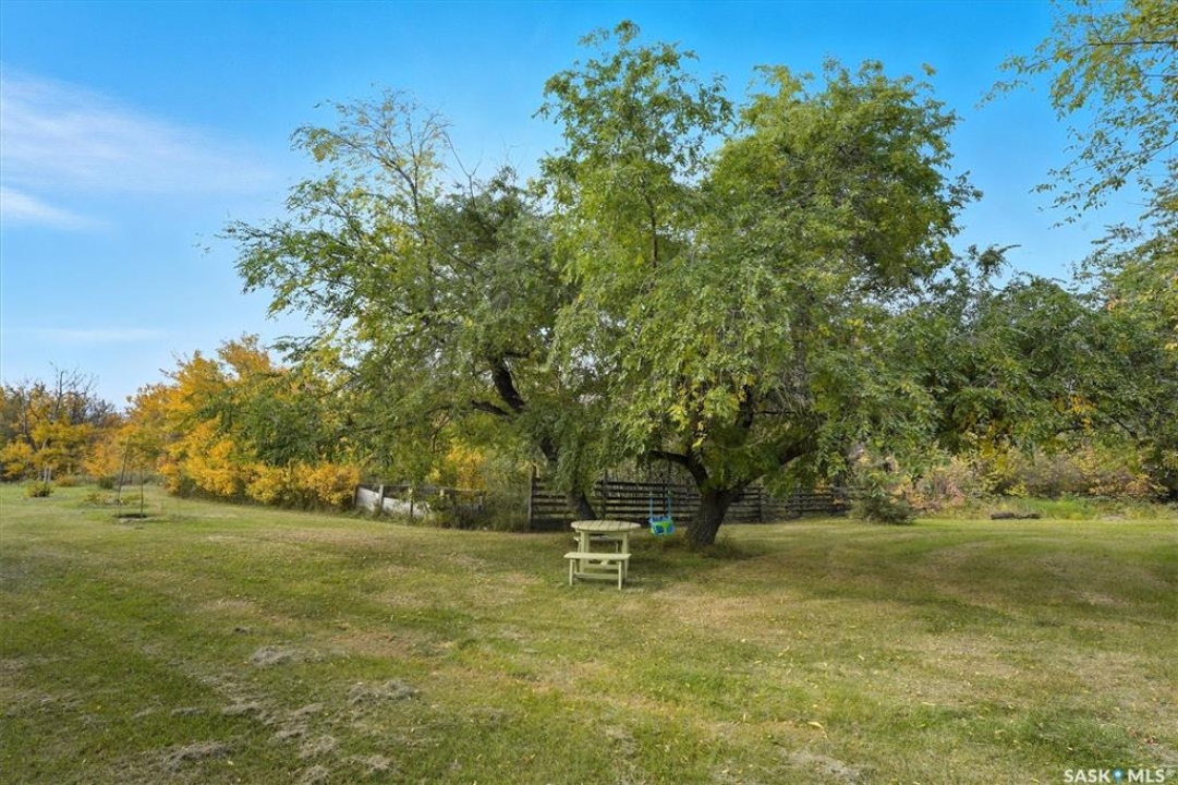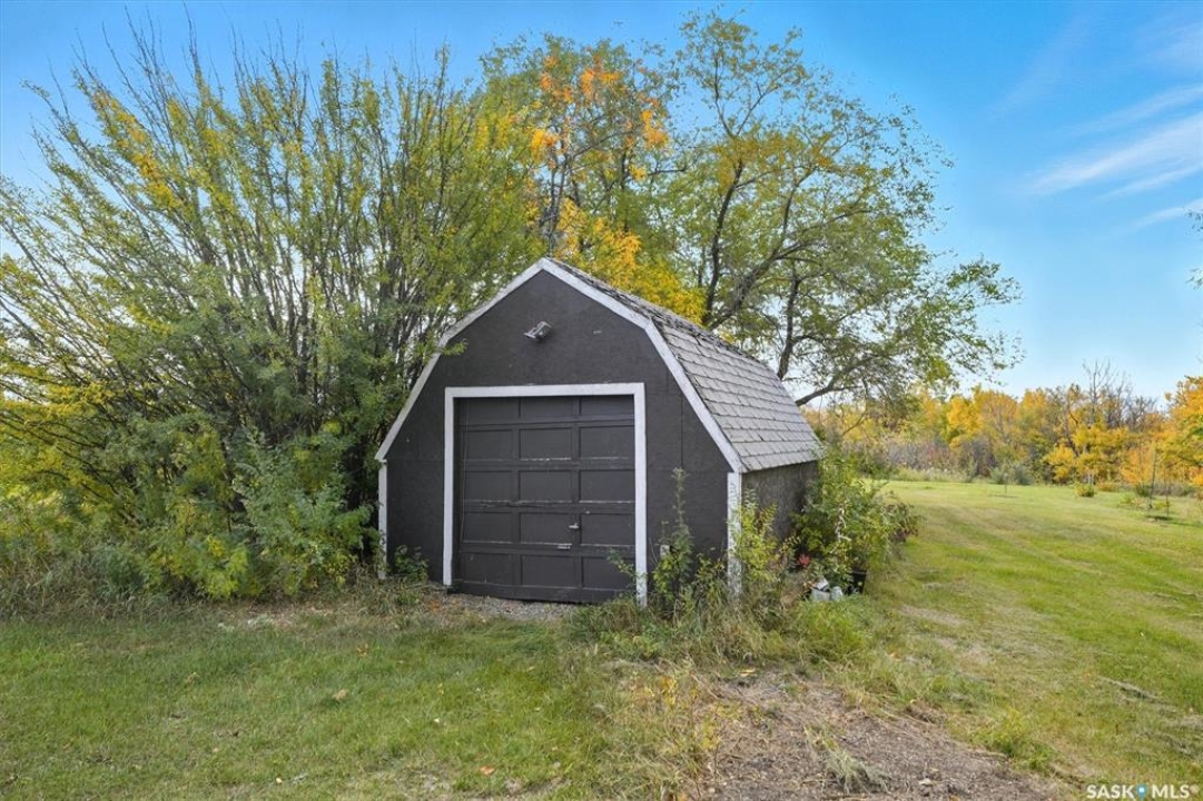 Acreage living just 7 minutes from Saskatoon! Welcome to 203 Spur Way in Saddle Ridge Estates — a charming 1.5- storey home on 4.99 acres in the rolling hills. This 4-bedroom, 2-bath home offers warmth, functionality, and space to grow — inside and out. The main floor features hardwood floors, a spacious kitchen with quartz counters, soft maple cabinetry, and matching appliances. The living room flows to the deck through patio doors, making entertaining a breeze. Cozy up downstairs by the gas fireplace, or retreat to the stunning loft bedroom via the oak spiral staircase, complete with Juliette balcony. Enjoy updated central A/C, windows and front door (all within the last 2 years), and a triple attached garage. The acreage includes a barn with box stall, water, tack room, and loft — perfect for horses, storage, or a studio. Now for the showstopper: a thoughtfully planned food forest with 25+ varieties including apple, plum, cherry, pear, grape, haskap, raspberry, kiwi, seabuckthorn, hazelnut, herbs, strawberries, and even asparagus. Over 70 haskaps, 65 asparagus, and dozens of fruit trees, all mulched, edged, and connected by a line watering system. A fenced 200m2 no-till garden produces enough vegetables for full seasonal self-sufficiency. Serviced with city water, septic mound, Fiber Optic internet with Prairie Crocus, school bus access to Clavet, and fully paved development - this property offers a rare blend of rural privacy and urban access. Acreages like this — with natural abundance, modern comfort, and easy commuting — are truly one of a kind.