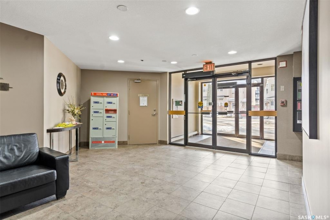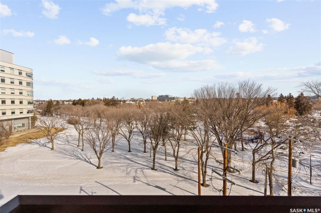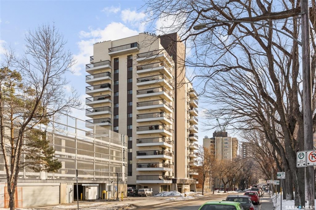Beautiful condo in downtown Saskatoon. Fabulous view of Kinsmen Park, the river and U of S. 1324 sq ft open concept with 2 bedrooms, and 2 bathrooms. Living room with an electric fireplace. 1 underground parking stall. Laundry on every floor. Games room on main floor, swimming pool, hot tub and sauna. Tile party roof to enjoy the view. Newer flooring in 2011, light fixtures, paint, newer island in 2006. Wrap-around deck facing north and east. Central air, elevator, includes fridge, stove, built-in dishwasher & freezer.