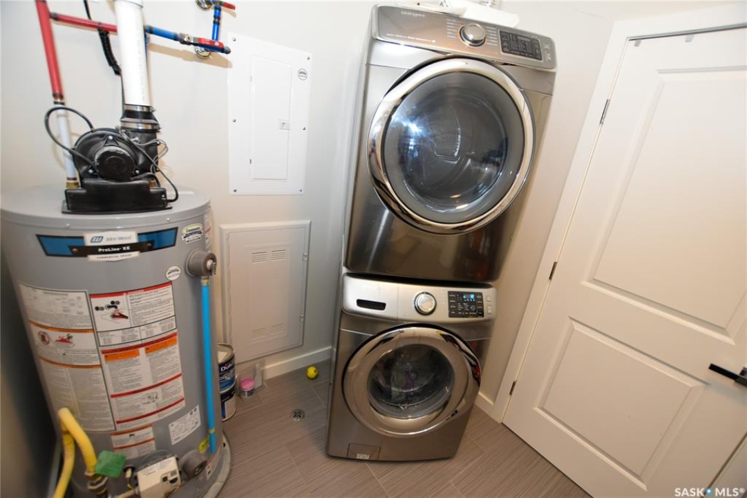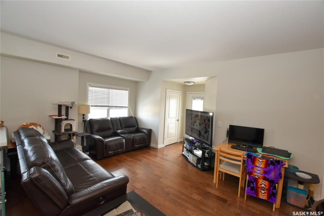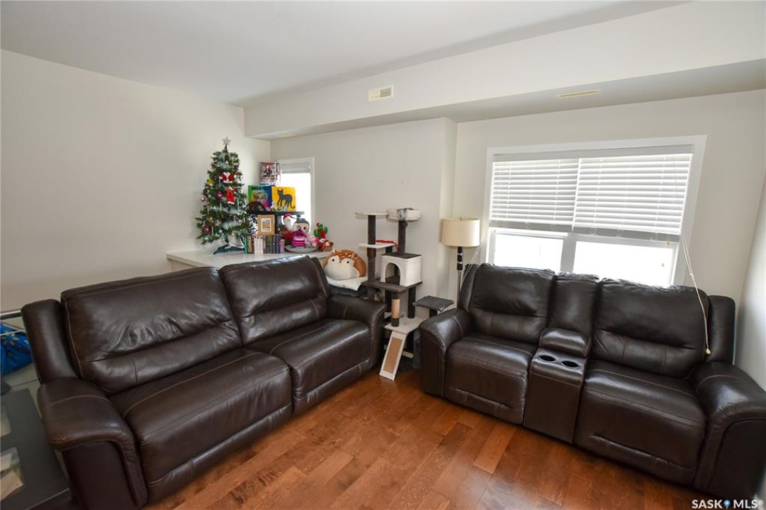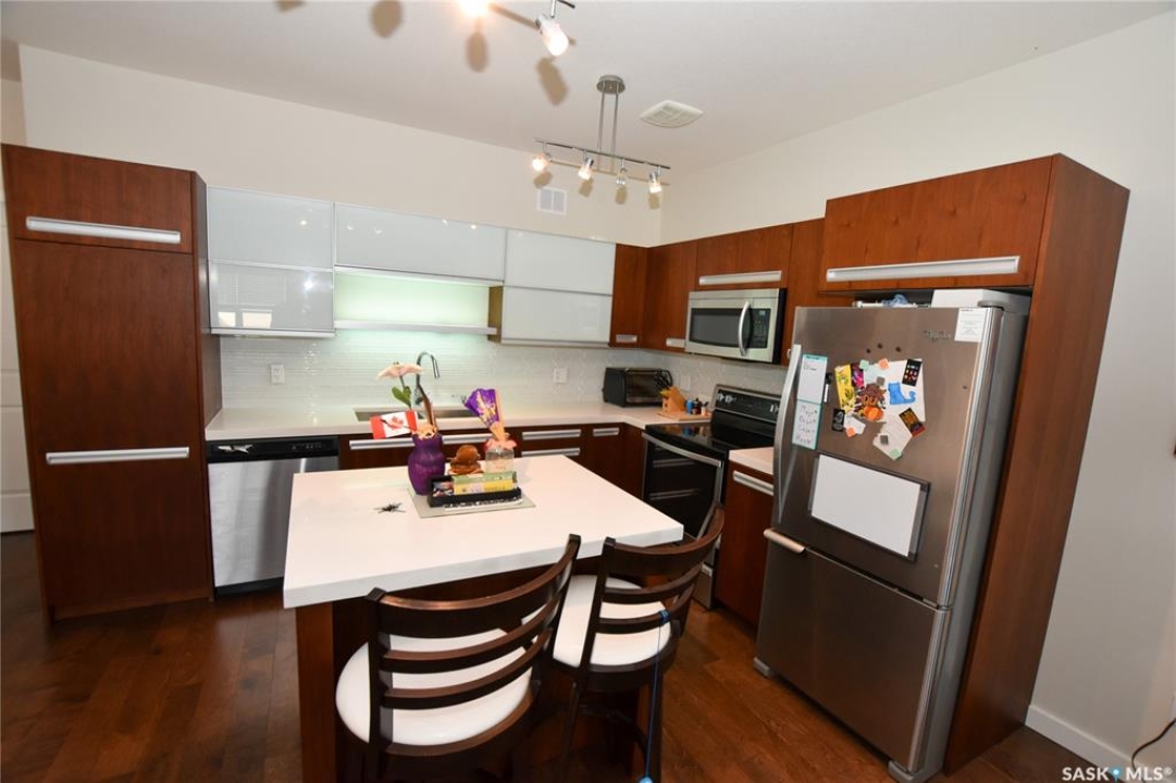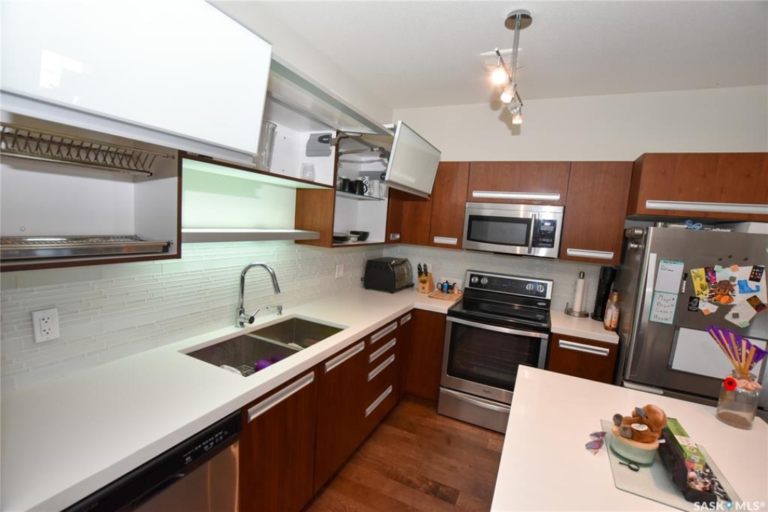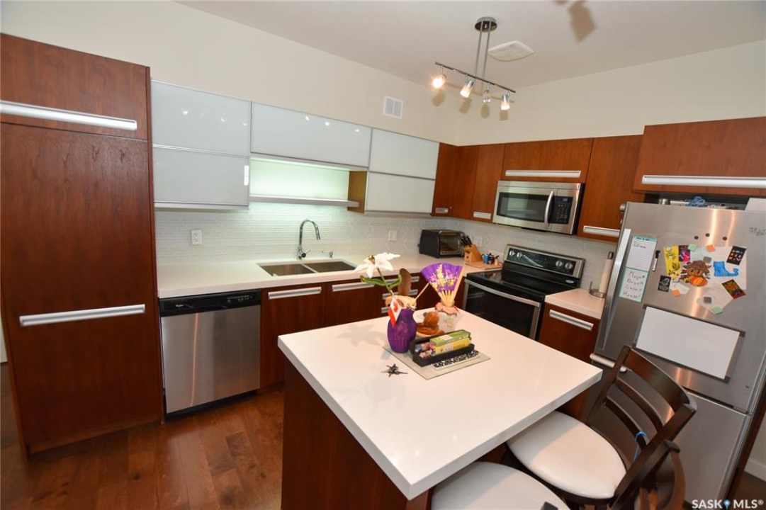 Don't miss out on this original owner top floor corner unit with 953 sq.ft of modern living space in the sought after Montierra condominium complex. The modern design includes quartz countertops, glass backsplash, under-mount sinks, New York style cabinetry with BLUM soft close doors and drawers. Featuring a high efficient furnace, updated hot water tank, central air conditioning, engineered hardwood in the main living and kitchen area, while you have tile in the entrance, bathroom & laundry, and carpeting in the bedrooms. Located conveniently in Hampton Village, you have easy access to the Airport and Circle Drive. With 2 electrified parking stalls, stainless steel kitchen appliances, and an upgraded washer/dryer package, this unit is a great fit for a first time home buyer or investor. Featuring numerous dual pane windows, this unit is the benefit for an abundance of natural light. There is a generous pet friendly program in place (with property management approval, some exceptions may apply). This unit can be your new home sooner rather than later... so don't delay... setup your showing appointment to view it today!