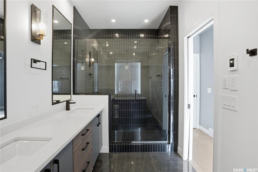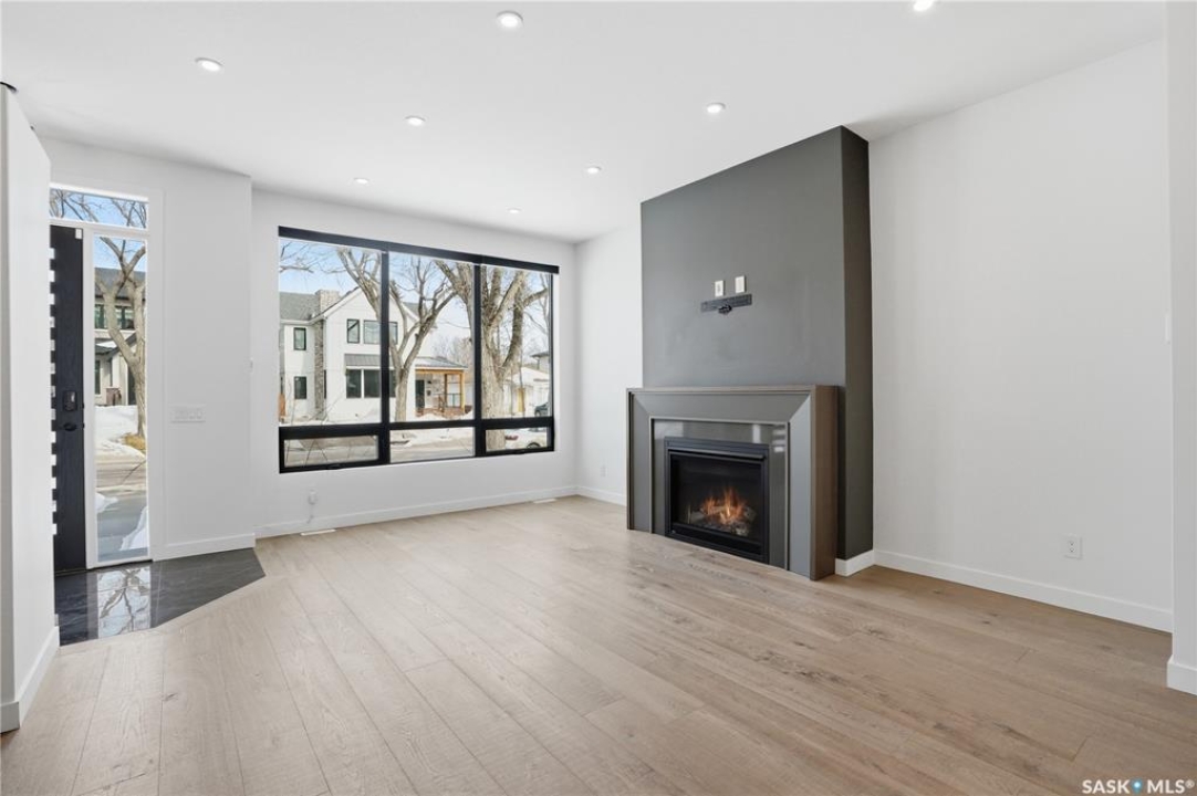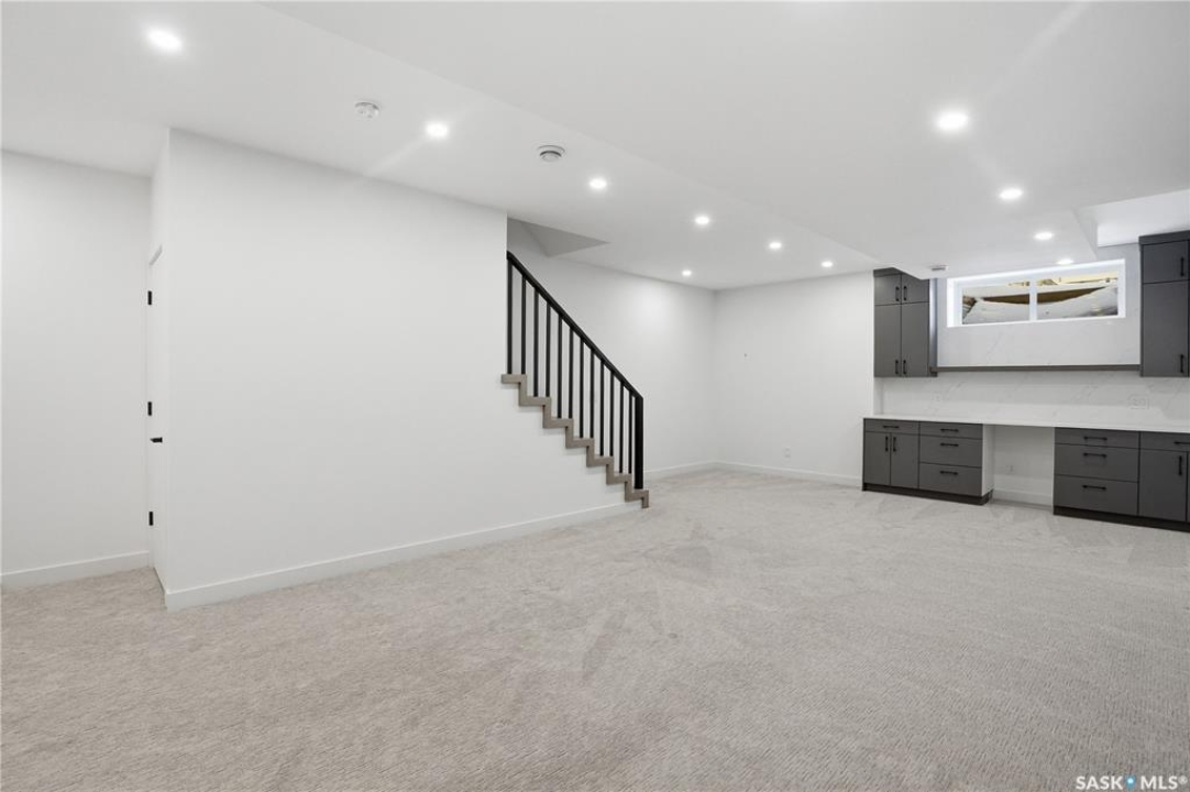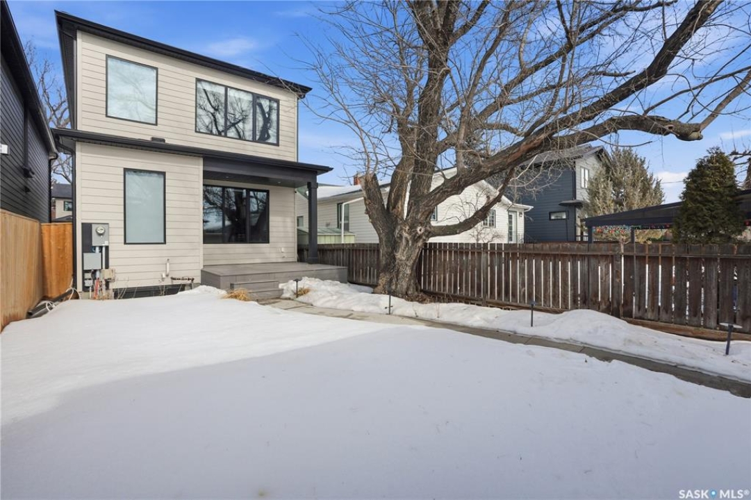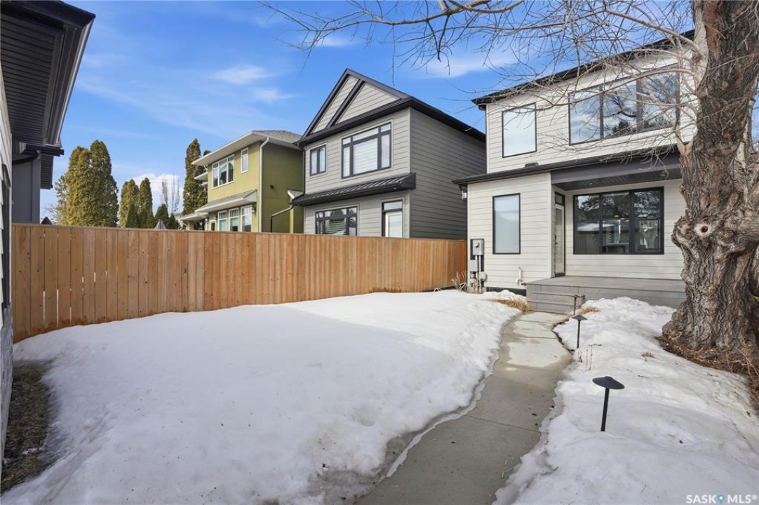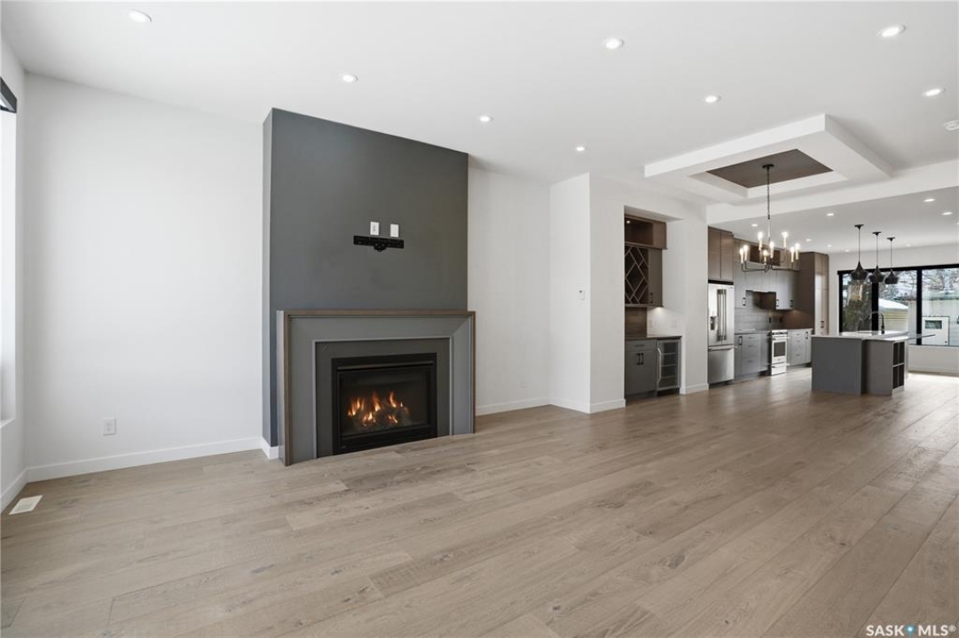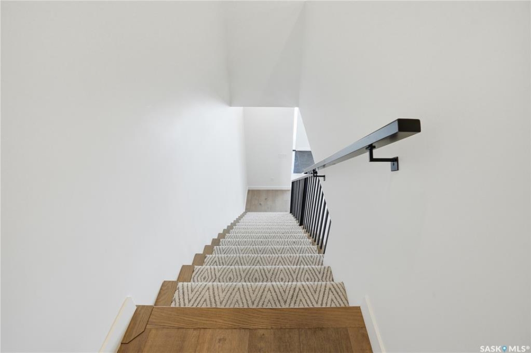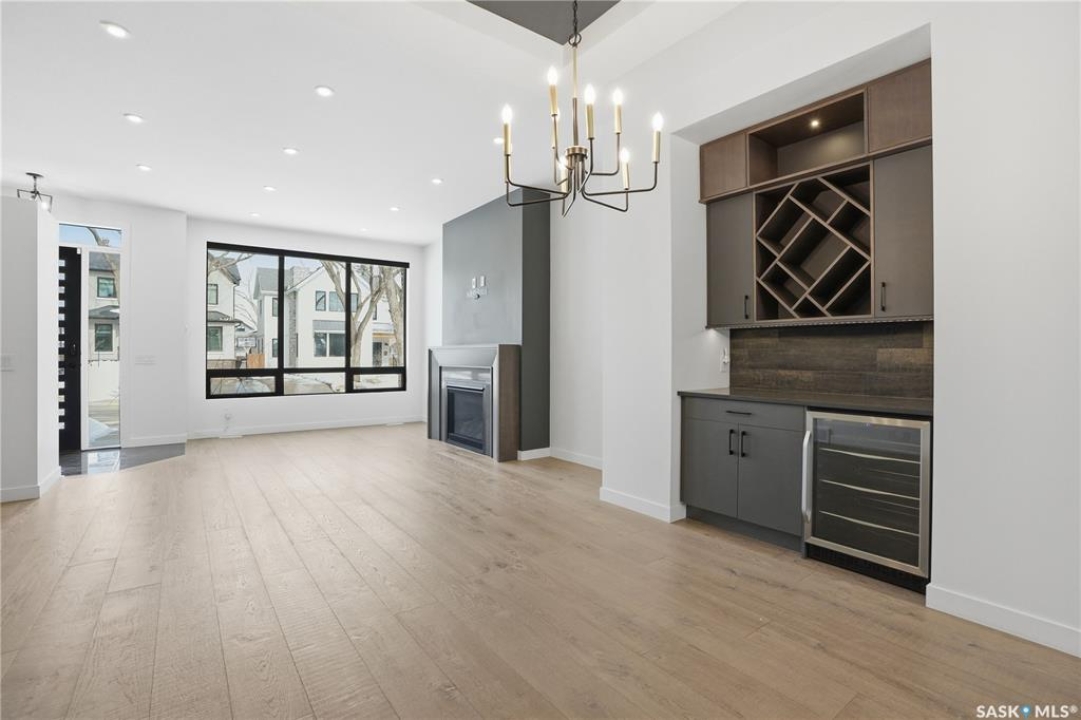 Welcome to 1312 15th Street East, a former Lexus show home, nestled in the prestigious Varsity View neighborhood. This 1,944 sq ft two-storey residence offers refined elegance and premium living throughout. Step inside to a stunning open-concept main floor, where engineered hardwood floors flow seamlessly beneath 10 ft ceilings. A gas fireplace with custom modern trim anchors the living space, while a bespoke wine bar with integrated fridge leads to the high-end kitchen. Designed for both function and style, the kitchen features a large island with seating, pendant lighting, stainless steel appliance package including a convection oven and custom hood fan, two-tone soft-close cabinetry to the ceiling with walnut accents, tile backsplash, and quartz countertops. Enjoy direct access to the rear deck, complete with built-in seating and hooks. A 2-piece powder room completes this level. Upstairs, the spacious primary suite showcases a custom ceiling detail, a walk-in closet with built-in organizers, and a luxurious 4-piece ensuite featuring in-floor heat, a soaker tub, 24x24 tile flooring, and a walk-in tile shower with 10mm tempered glass. Two additional bedrooms, a full 4-piece bathroom with tile shower, and a dedicated laundry room complete the second floor. The fully finished basement offers 9 ft ceilings, recessed lighting, plush carpet with upgraded underlay, a generous family room with electric fireplace, and a custom composite panel feature wall. Entertain effortlessly with the bar, complete with quartz countertops and backsplash. This level also includes a 3-piece bathroom with walk-in tile shower, an additional bedroom, and mechanical room. Thoughtfully curated with cohesive, high-end finishes throughout, home includes motorized blinds on main. The exterior features a composite deck, landscaped yard, and walkway leading to a heated double detached garage with flex seal flooring. Ideally located near the South Saskatchewan River, university, schools, parks.