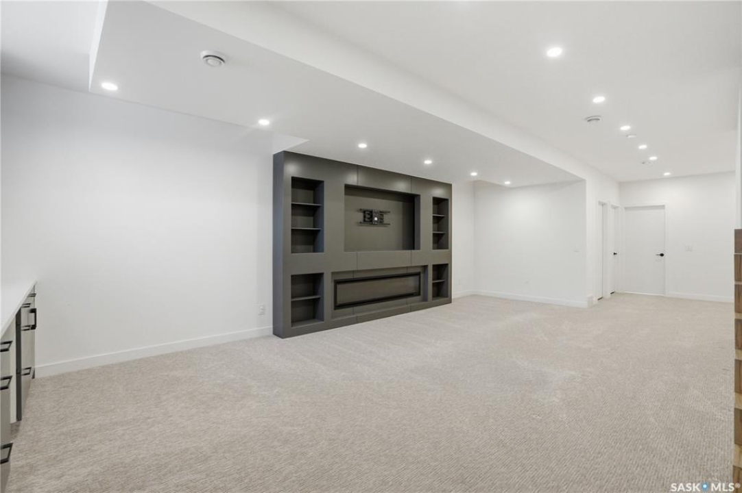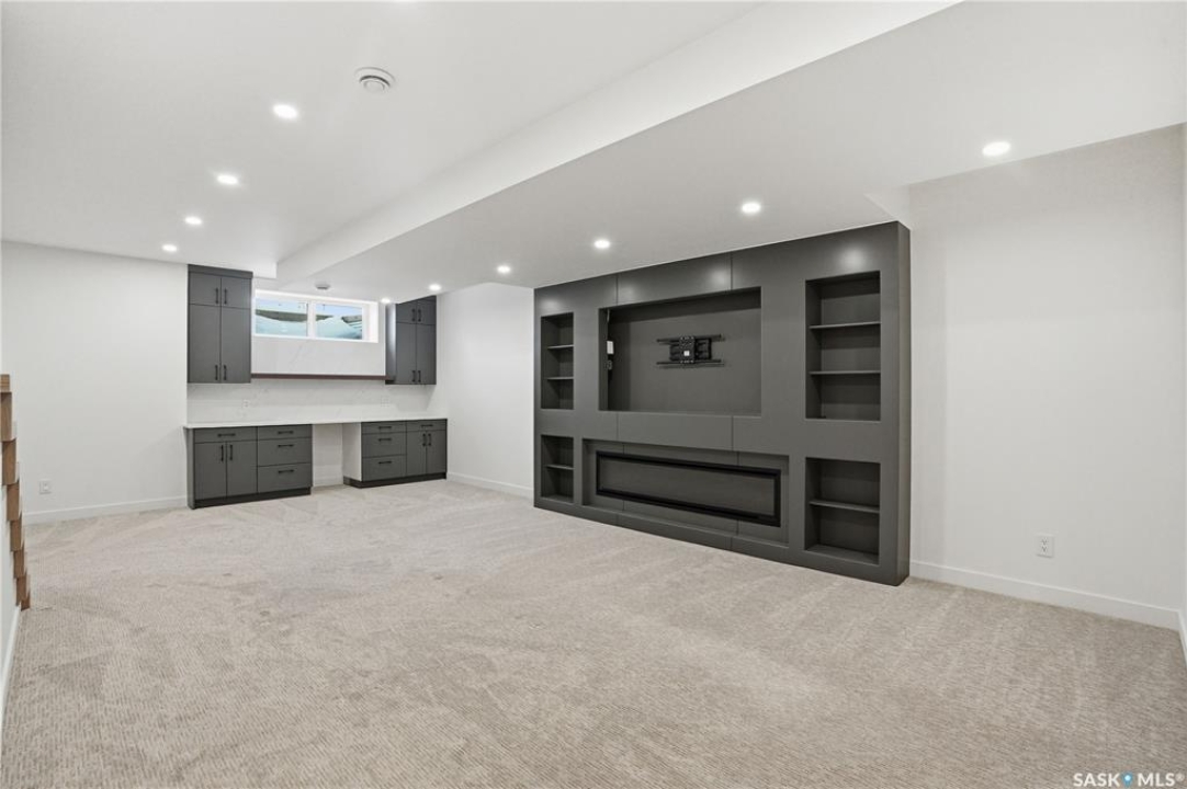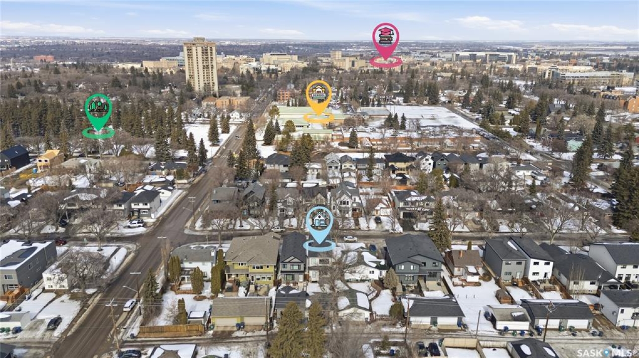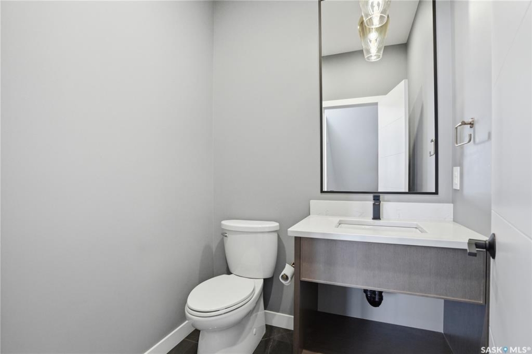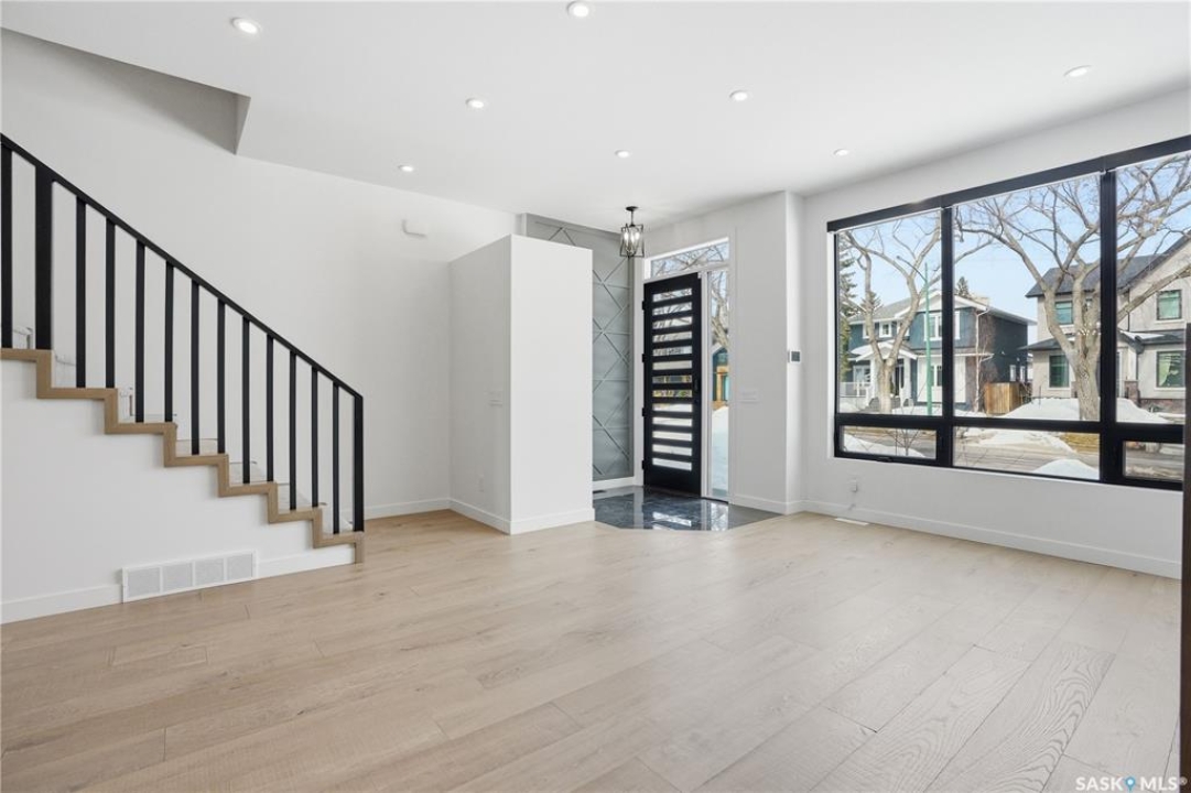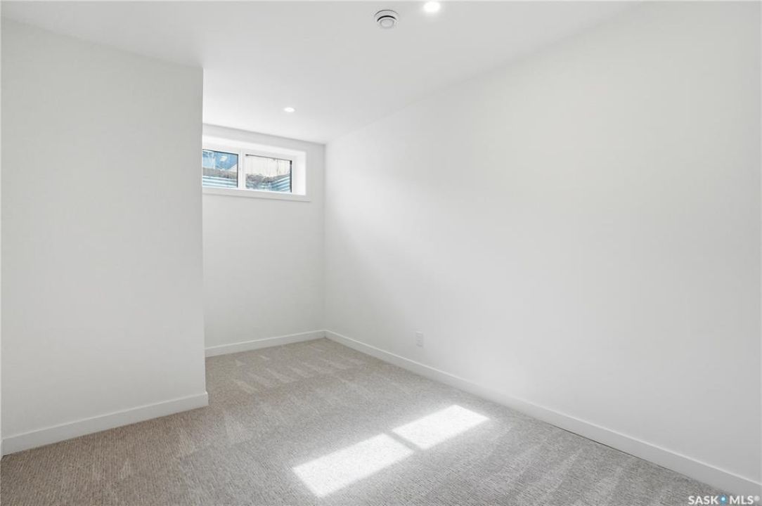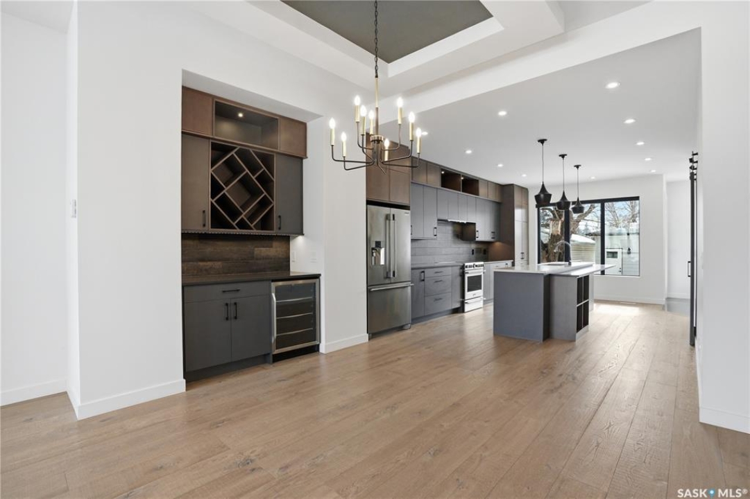Welcome to 1312 15th Street East, a former Lexus show home, nestled in the prestigious Varsity View neighborhood. This 1,944 sq ft two-storey residence offers refined elegance and premium living throughout. Step inside to a stunning open-concept main floor, where engineered hardwood floors flow seamlessly beneath 10 ft ceilings. A gas fireplace with custom modern trim anchors the living space, while a bespoke wine bar with integrated fridge leads to the high-end kitchen. Designed for both function and style, the kitchen features a large island with seating, pendant lighting, stainless steel appliance package including a convection oven and custom hood fan, two-tone soft-close cabinetry to the ceiling with walnut accents, tile backsplash, and quartz countertops. Enjoy direct access to the rear deck, complete with built-in seating and hooks. A 2-piece powder room completes this level. Upstairs, the spacious primary suite showcases a custom ceiling detail, a walk-in closet with built-in organizers, and a luxurious 4-piece ensuite featuring in-floor heat, a soaker tub, 24x24 tile flooring, and a walk-in tile shower with 10mm tempered glass. Two additional bedrooms, a full 4-piece bathroom with tile shower, and a dedicated laundry room complete the second floor. The fully finished basement offers 9 ft ceilings, recessed lighting, plush carpet with upgraded underlay, a generous family room with electric fireplace, and a custom composite panel feature wall. Entertain effortlessly with the bar, complete with quartz countertops and backsplash. This level also includes a 3-piece bathroom with walk-in tile shower, an additional bedroom, and mechanical room. Thoughtfully curated with cohesive, high-end finishes throughout, home includes motorized blinds on main. The exterior features a composite deck, landscaped yard, and walkway leading to a heated double detached garage with flex seal flooring. Ideally located near the South Saskatchewan River, university, schools, parks.