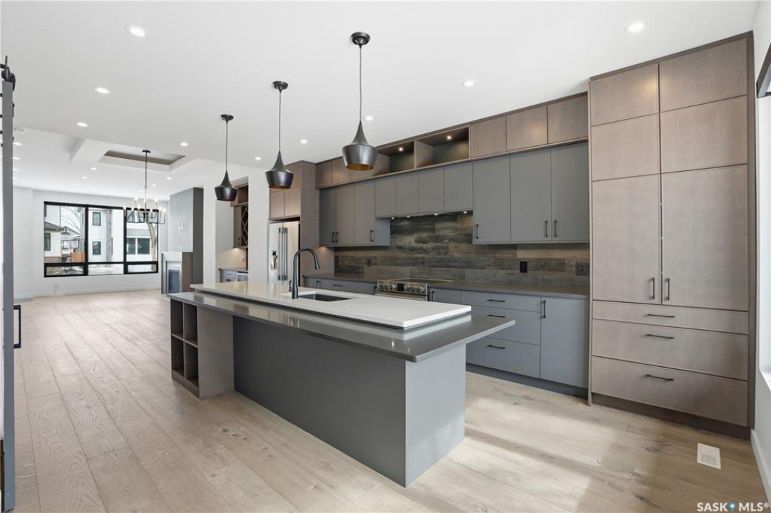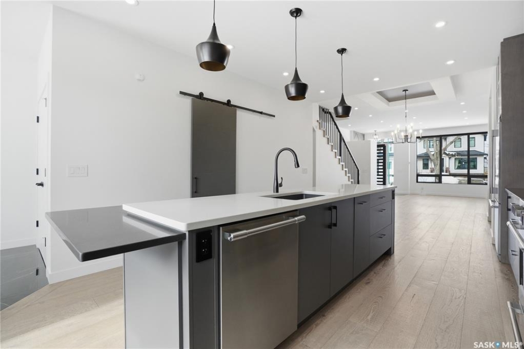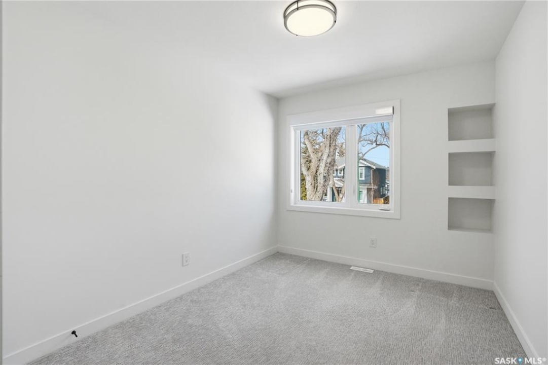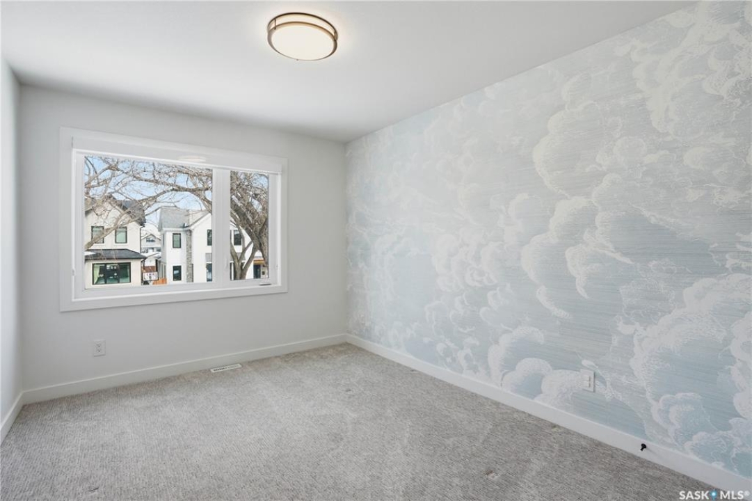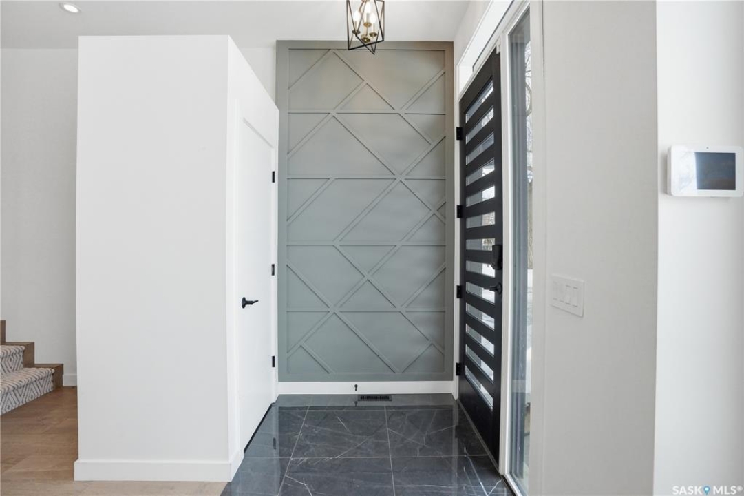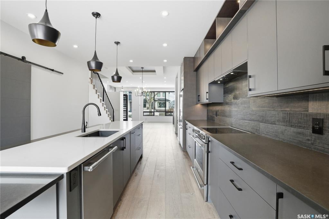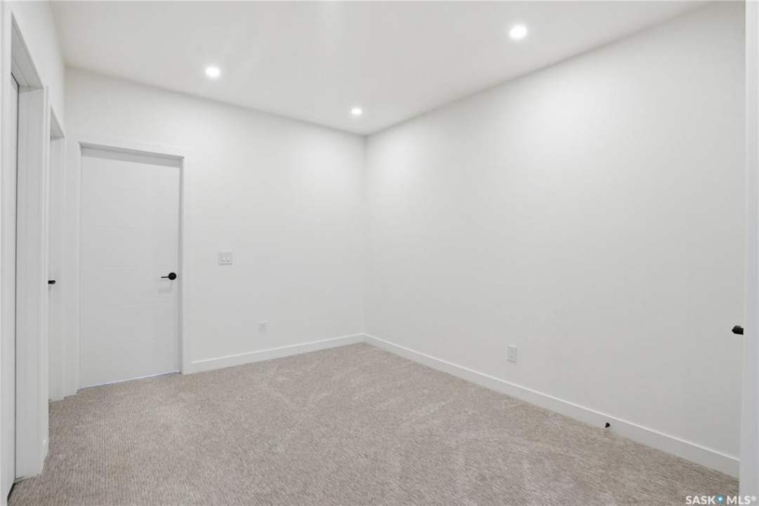 Welcome to 1312 15th Street East, a former Lexus show home, nestled in the prestigious Varsity View neighborhood. This 1,944 sq ft two-storey residence offers refined elegance and premium living throughout. Step inside to a stunning open-concept main floor, where engineered hardwood floors flow seamlessly beneath 10 ft ceilings. A gas fireplace with custom modern trim anchors the living space, while a bespoke wine bar with integrated fridge leads to the high-end kitchen. Designed for both function and style, the kitchen features a large island with seating, pendant lighting, stainless steel appliance package including a convection oven and custom hood fan, two-tone soft-close cabinetry to the ceiling with walnut accents, tile backsplash, and quartz countertops. Enjoy direct access to the rear deck, complete with built-in seating and hooks. A 2-piece powder room completes this level. Upstairs, the spacious primary suite showcases a custom ceiling detail, a walk-in closet with built-in organizers, and a luxurious 4-piece ensuite featuring in-floor heat, a soaker tub, 24x24 tile flooring, and a walk-in tile shower with 10mm tempered glass. Two additional bedrooms, a full 4-piece bathroom with tile shower, and a dedicated laundry room complete the second floor. The fully finished basement offers 9 ft ceilings, recessed lighting, plush carpet with upgraded underlay, a generous family room with electric fireplace, and a custom composite panel feature wall. Entertain effortlessly with the bar, complete with quartz countertops and backsplash. This level also includes a 3-piece bathroom with walk-in tile shower, an additional bedroom, and mechanical room. Thoughtfully curated with cohesive, high-end finishes throughout, home includes motorized blinds on main. The exterior features a composite deck, landscaped yard, and walkway leading to a heated double detached garage with flex seal flooring. Ideally located near the South Saskatchewan River, university, schools, parks.