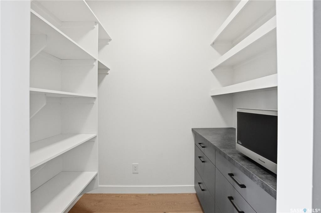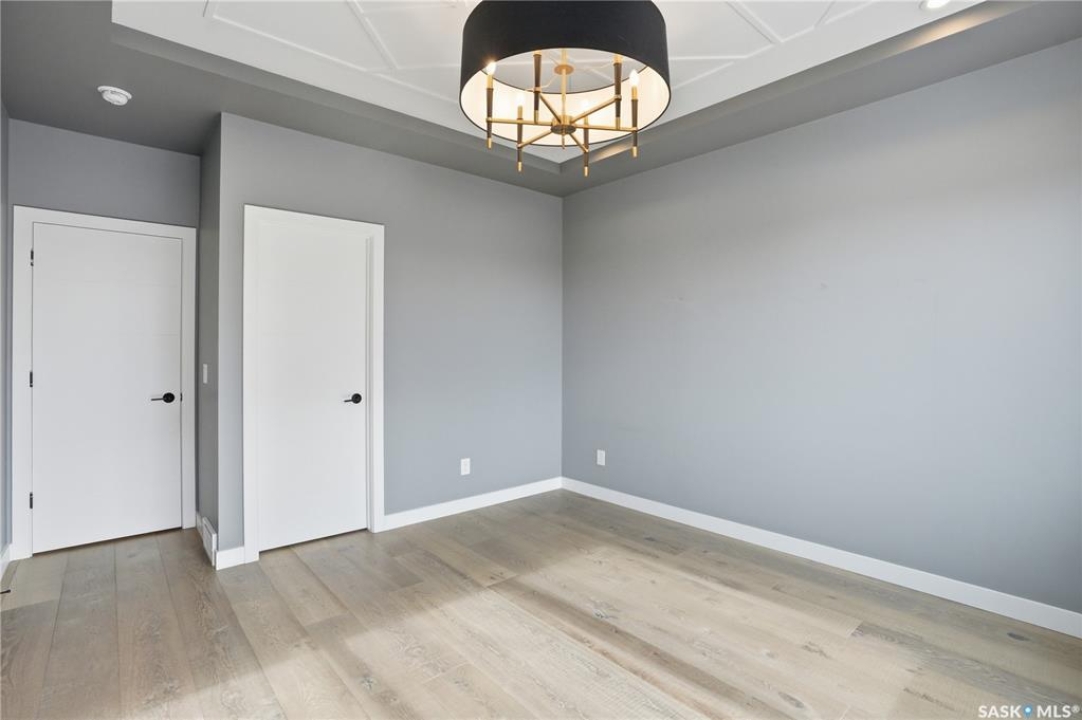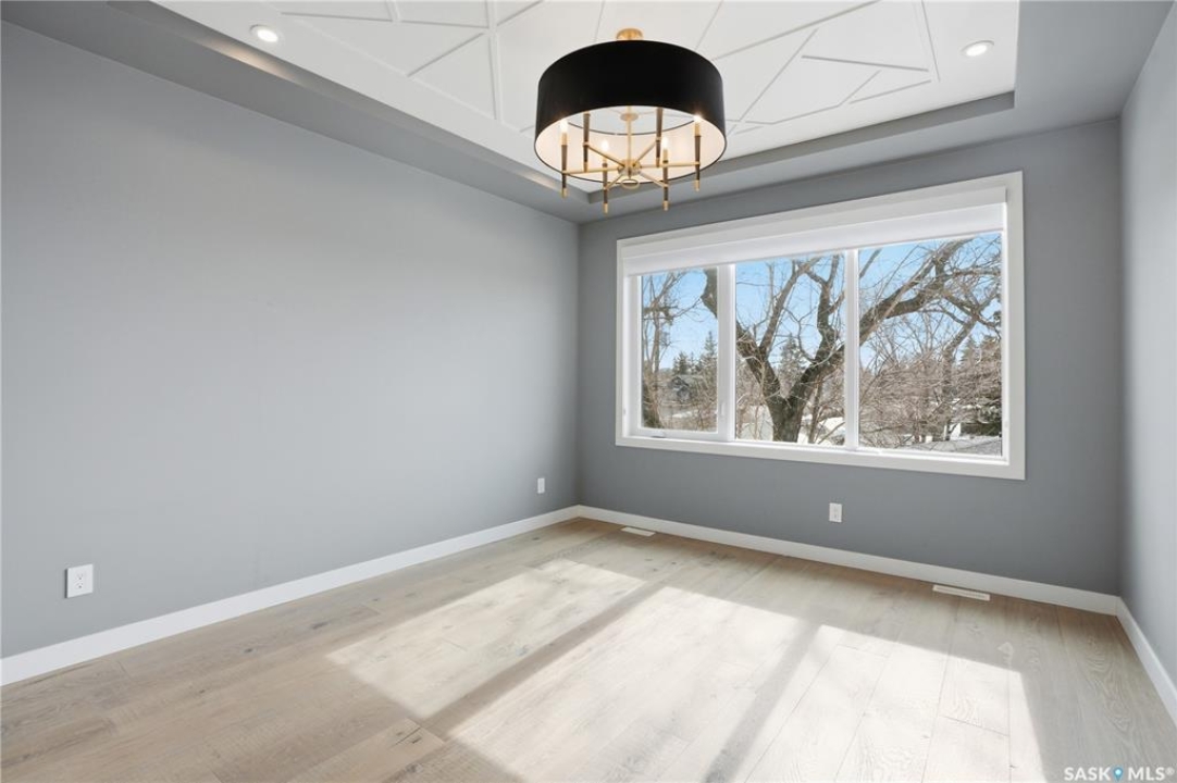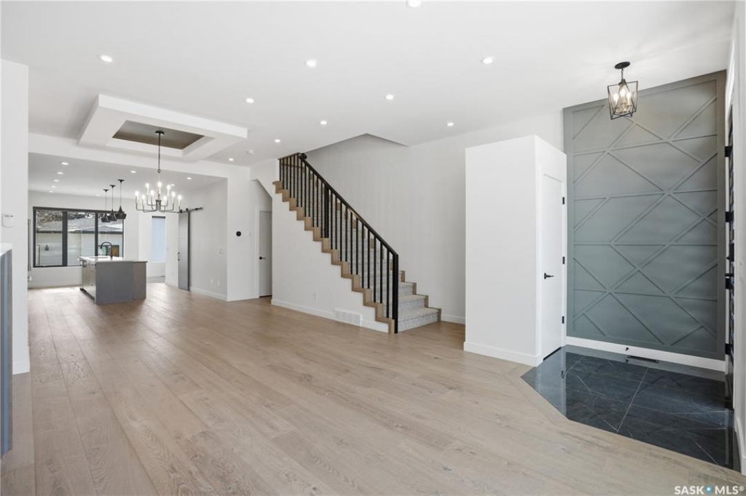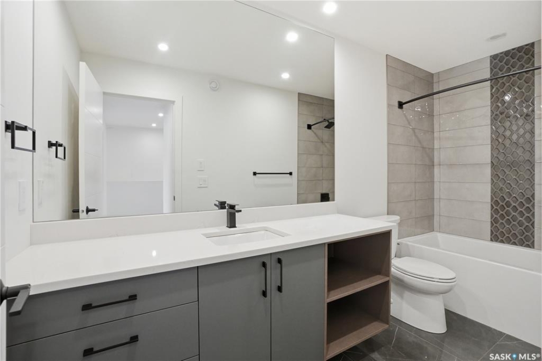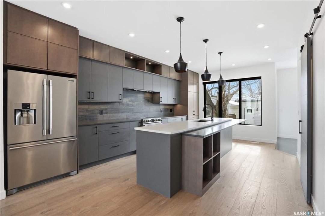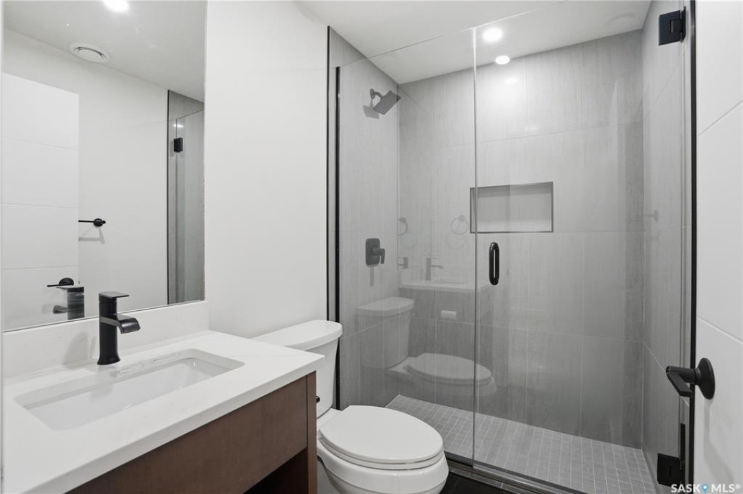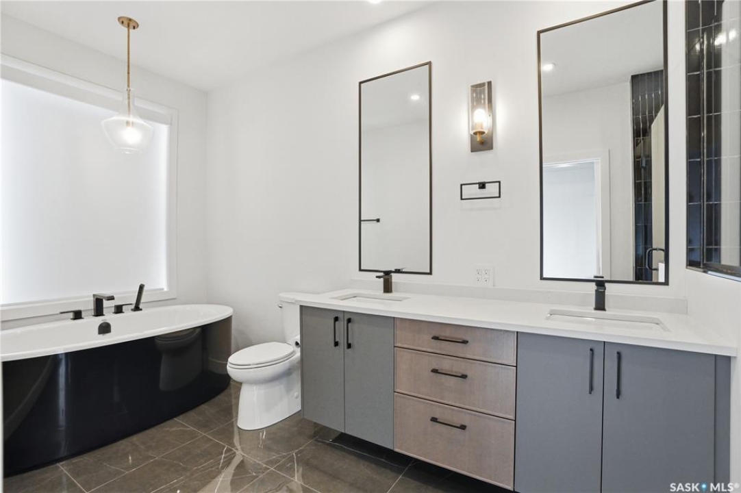 Welcome to 1312 15th Street East, a former Lexus show home, nestled in the prestigious Varsity View neighborhood. This 1,944 sq ft two-storey residence offers refined elegance and premium living throughout. Step inside to a stunning open-concept main floor, where engineered hardwood floors flow seamlessly beneath 10 ft ceilings. A gas fireplace with custom modern trim anchors the living space, while a bespoke wine bar with integrated fridge leads to the high-end kitchen. Designed for both function and style, the kitchen features a large island with seating, pendant lighting, stainless steel appliance package including a convection oven and custom hood fan, two-tone soft-close cabinetry to the ceiling with walnut accents, tile backsplash, and quartz countertops. Enjoy direct access to the rear deck, complete with built-in seating and hooks. A 2-piece powder room completes this level. Upstairs, the spacious primary suite showcases a custom ceiling detail, a walk-in closet with built-in organizers, and a luxurious 4-piece ensuite featuring in-floor heat, a soaker tub, 24x24 tile flooring, and a walk-in tile shower with 10mm tempered glass. Two additional bedrooms, a full 4-piece bathroom with tile shower, and a dedicated laundry room complete the second floor. The fully finished basement offers 9 ft ceilings, recessed lighting, plush carpet with upgraded underlay, a generous family room with electric fireplace, and a custom composite panel feature wall. Entertain effortlessly with the bar, complete with quartz countertops and backsplash. This level also includes a 3-piece bathroom with walk-in tile shower, an additional bedroom, and mechanical room. Thoughtfully curated with cohesive, high-end finishes throughout, home includes motorized blinds on main. The exterior features a composite deck, landscaped yard, and walkway leading to a heated double detached garage with flex seal flooring. Ideally located near the South Saskatchewan River, university, schools, parks.