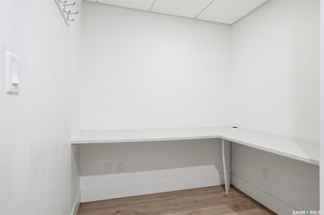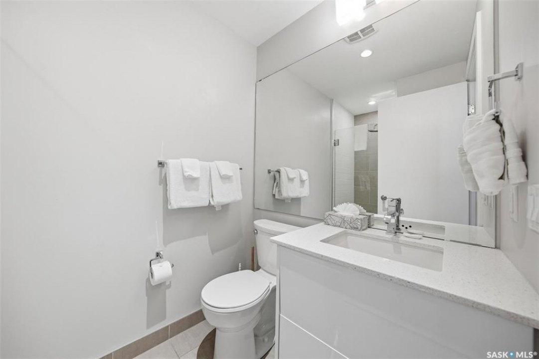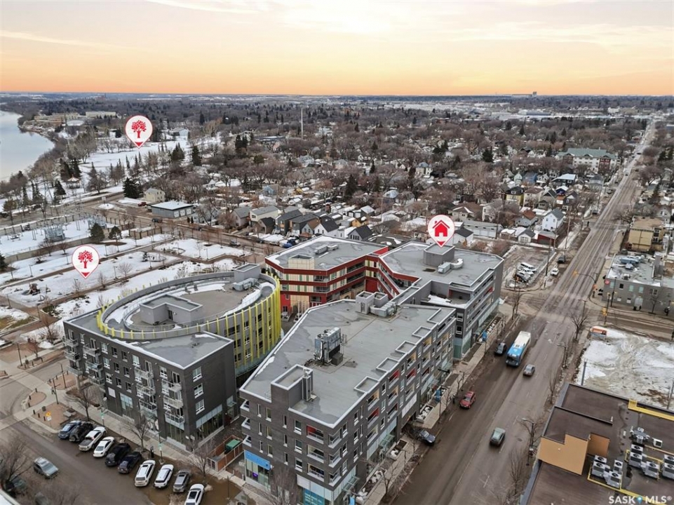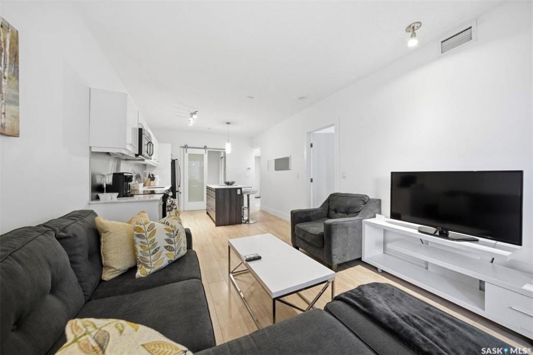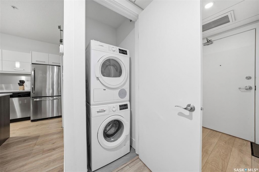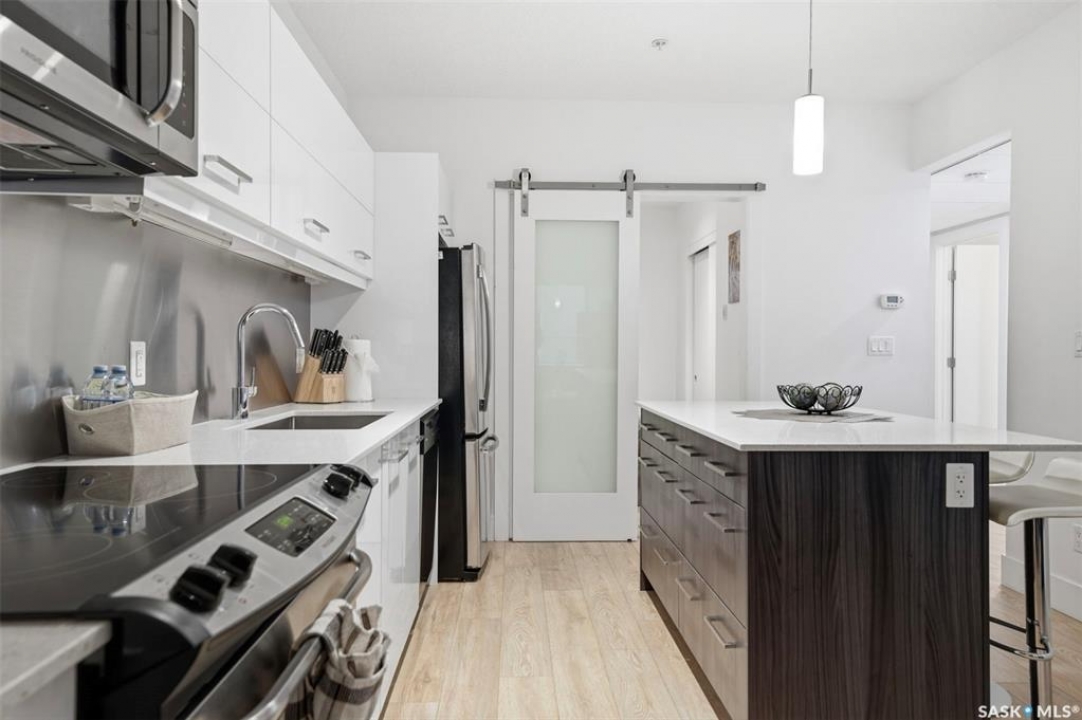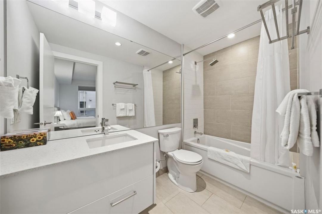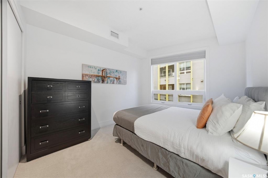 Welcome to Unit 228 at The Banks, offering modern condo living in one of Saskatoon's most vibrant neighbourhoods, just steps from the river bank encompassed by many great businesses, shops, cafes, and local markets. This well-appointed unit features a spacious front foyer with a conveniently located 3-piece bathroom complete with walk-in shower, a versatile den/study area, and in-suite laundry for added functionality and convenience. The main living space showcases a sleek contemporary design with high-gloss cabinetry, quartz countertops throughout kitchen and bathrooms, a large kitchen island, stainless steel backsplash, and stainless steel appliances. The primary bedroom offers a comfortable retreat with a 4-piece ensuite featuring a tub/shower combination with tile surround. A second bedroom and recessed south facing balcony complete the package. Additional highlights include central air conditioning, one titled underground parking stall, and a storage unit. The Banks is home to a variety of popular local businesses and is situated in a highly walkable, amenity-rich area. Pet-friendly building for unit owners (subject to board approval) and ready for immediate possession. Just move in and enjoy this low maintenance lifestyle!