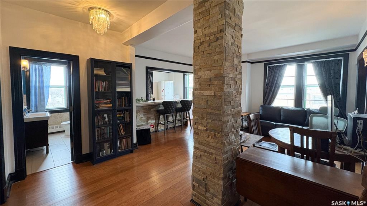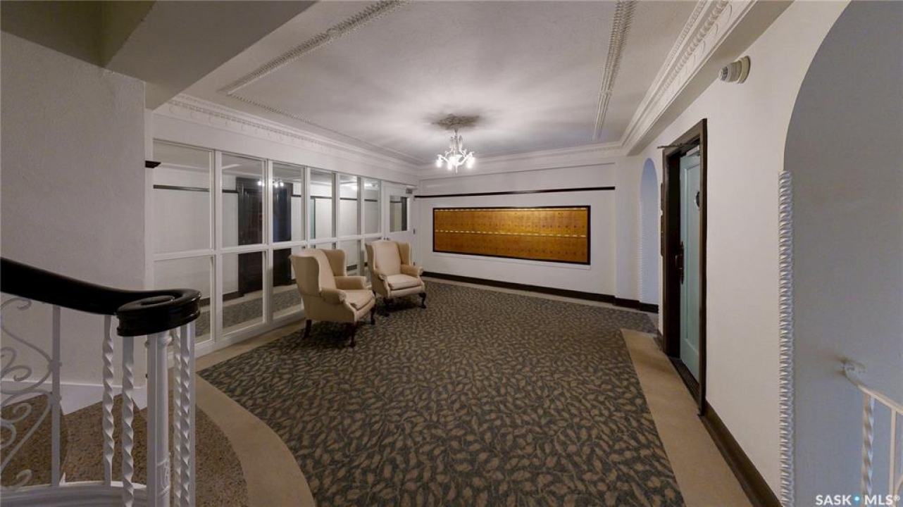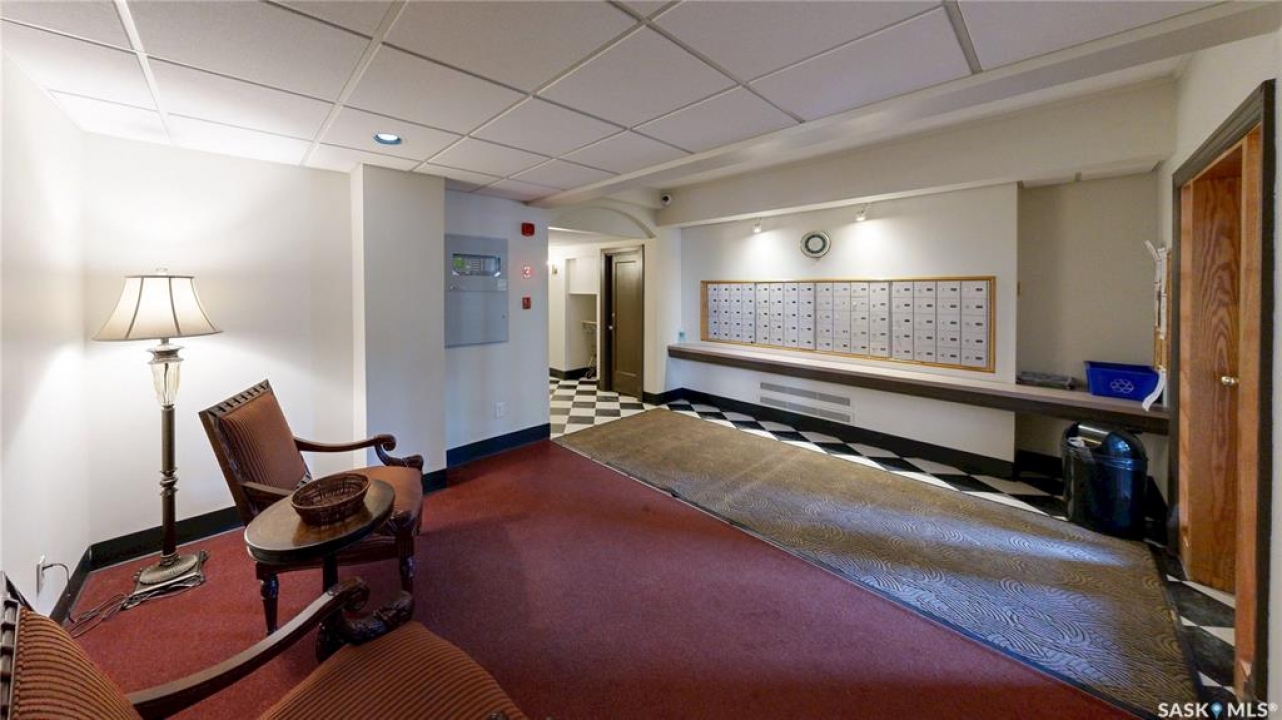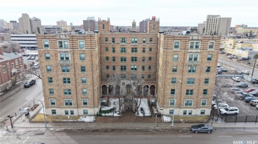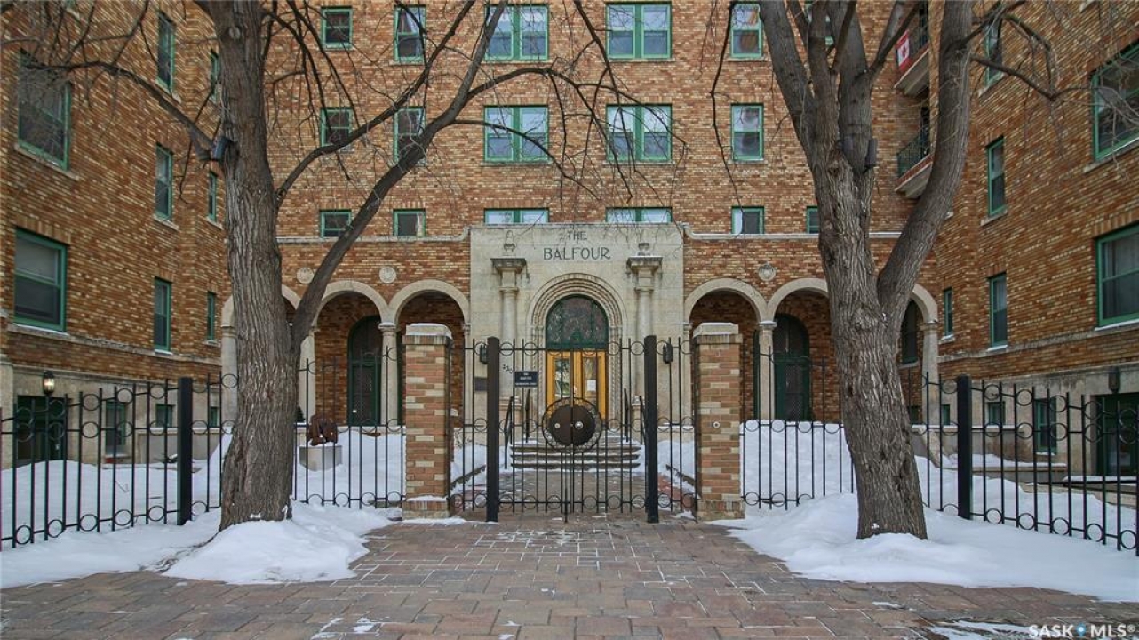 Welcome to The Balfour at 2305 Victoria Avenue, this heritage building is ideally situated in the heart of downtown Regina. With easy access to the Cornwall Centre, Victoria Park, nearby restaurants, and convenient bus routes. This charming brick building was constructed in 1929 and offers a welcoming visitor entry along with excellent shared amenities. Residents have access to a comfortable common room featuring a kitchen, TV, and ample seating. Ideal for visiting with neighbours or hosting guests. From there, step out onto the large outdoor patio complete with seating and a BBQ area. Condo fees are $511 per month and include heat and water, as well as common area maintenance, exterior building upkeep, garbage, sewer, common area insurance, and reserve fund contributions. Unit 400 is on the 4th floor and is a north west corner suite so it gets tons of natural light with a wonderful view of downtown. This space is 723 square feet with a very cozy feel. As you enter you see the bright living room with original hardwood floors and built-in shelving. The kitchen is to the left with more beautiful west facing windows and the fridge and stove top and portable air conditioner are included! The bedroom has hardwood floors and a closet. The unit is finished off with a 4 piece bathroom with tile floor. It also comes with 2 handy storage lockers as well as access to the shared laundry and rentable bike hangers!