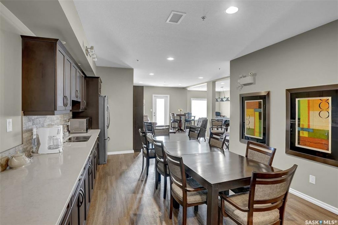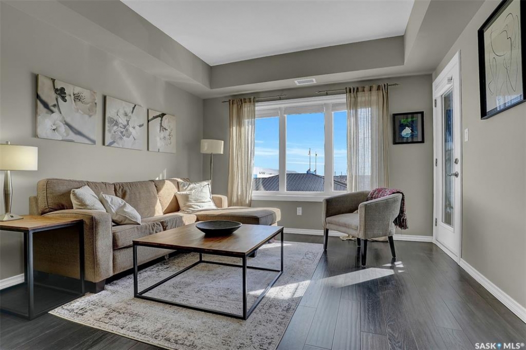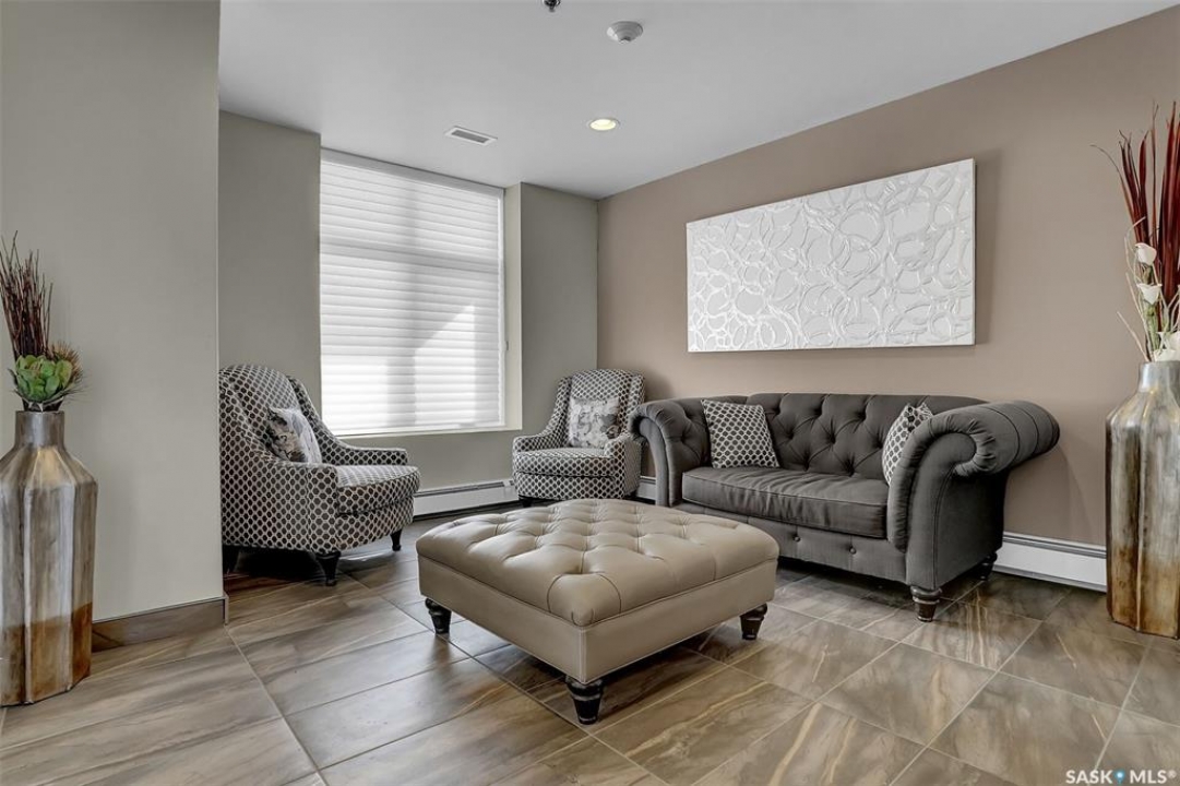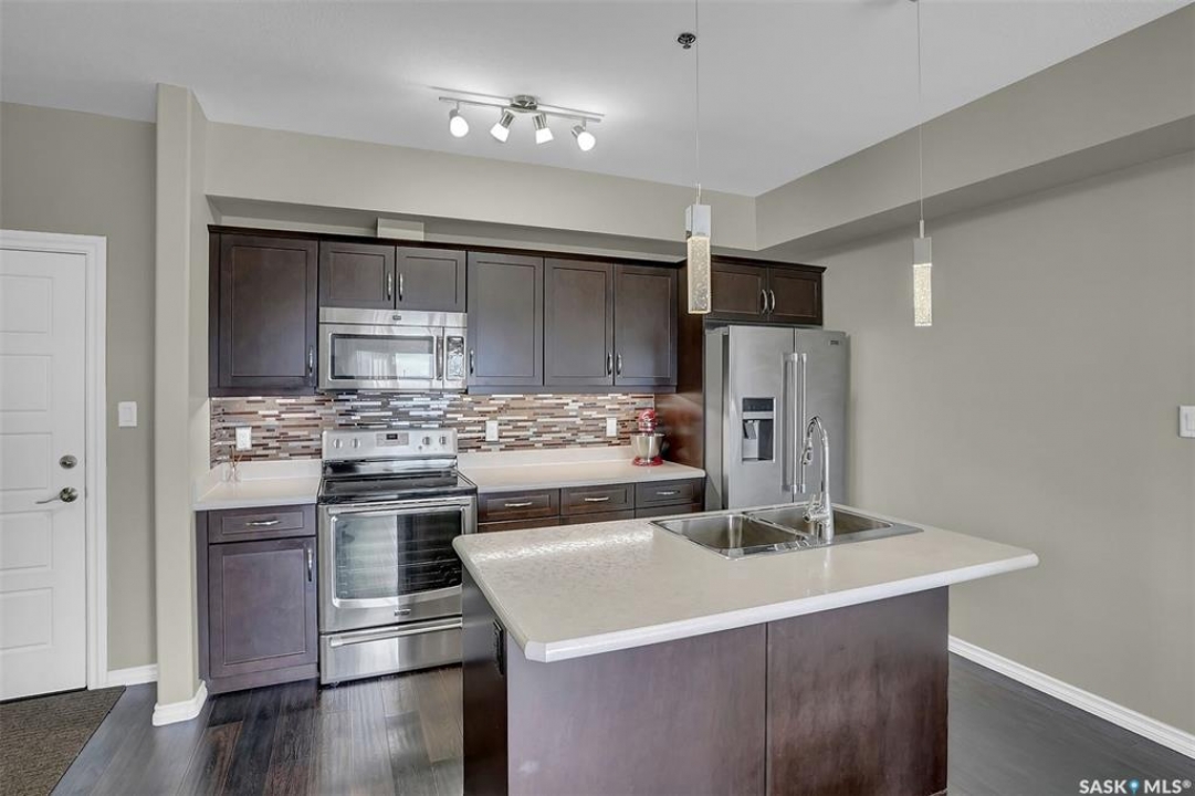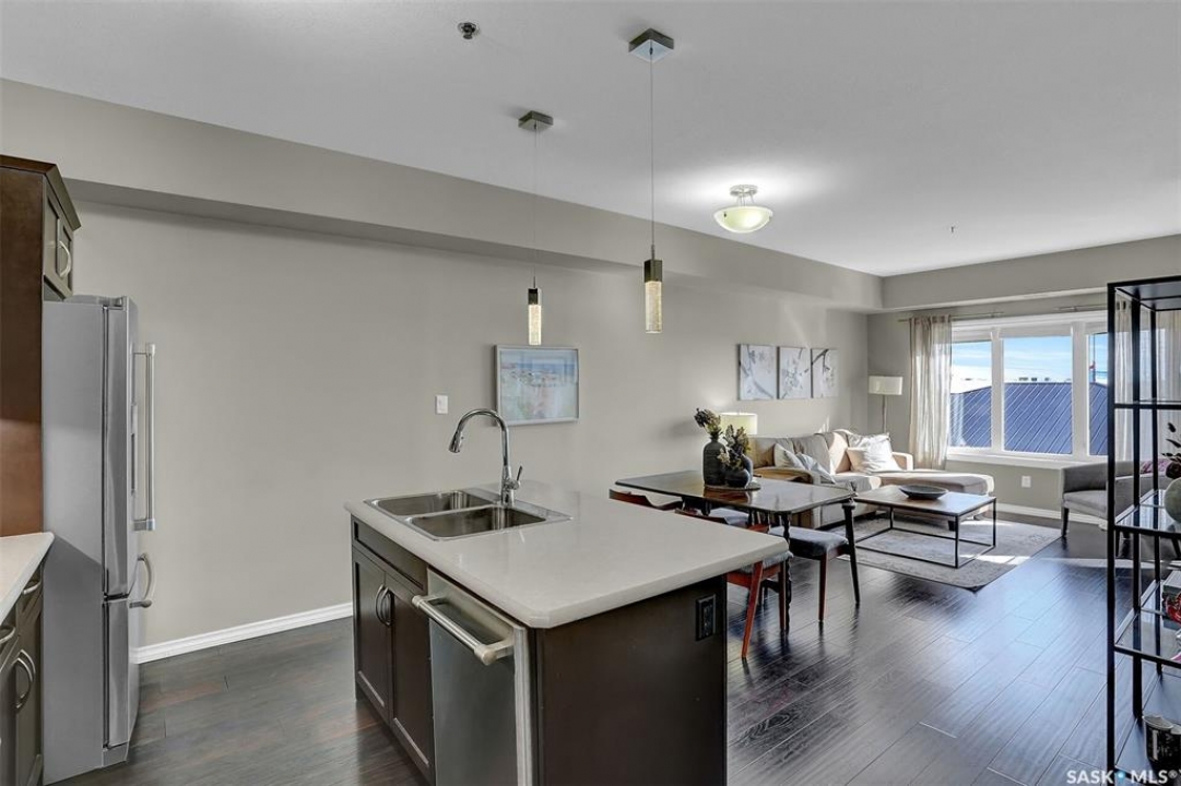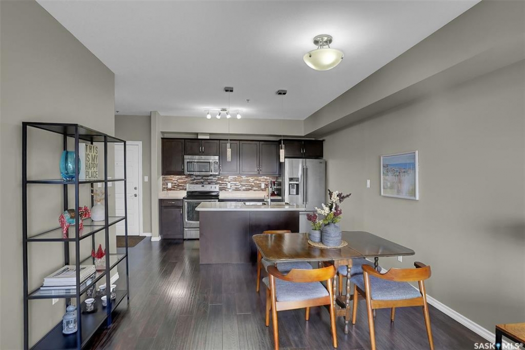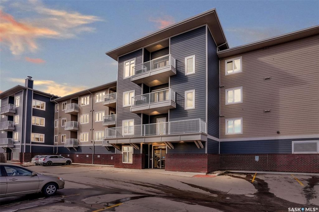 Welcome to this well-maintained 917 sq ft apartment-style condo located in Regina's desirable Lakeridge neighbourhood. This unit offers 2 bedrooms, 2 bathrooms, and the convenience of a heated underground parking stall. The open concept layout is bright and inviting, with large living room windows allowing natural light to flow throughout the main living space. The kitchen is both functional and stylish, featuring a large island with an integrated sink, stainless steel appliances, and a tiled backsplash. The dining area is conveniently located off the kitchen, while the living room provides direct access to your private balcony—perfect for relaxing. The primary bedroom offers a walk-in closet and a 3-piece ensuite, while a second bedroom and a 4-piece bathroom provide additional space for guests, family, or a home office. In-suite laundry with extra storage adds to the everyday convenience of this unit. The building features an elevator, visitor parking, and amenities room, with heat and water included in the condo fees for added value and ease of living. This is a fantastic opportunity to enjoy comfortable, low-maintenance living in a great location close to grocery stores, restaurants, parks, and all services you require for everyday living.