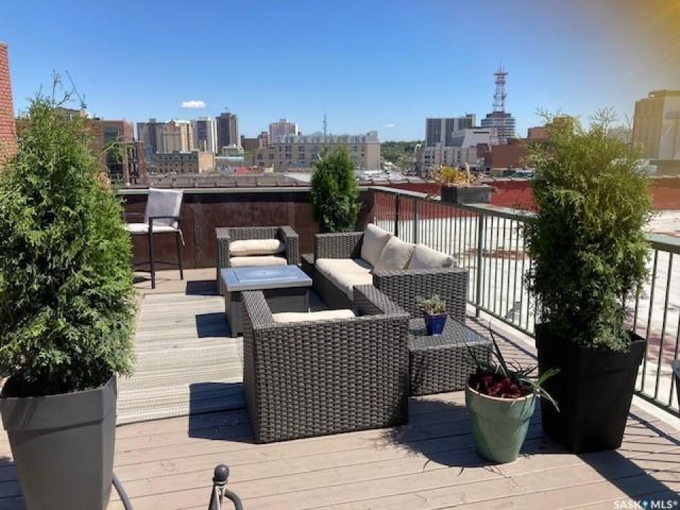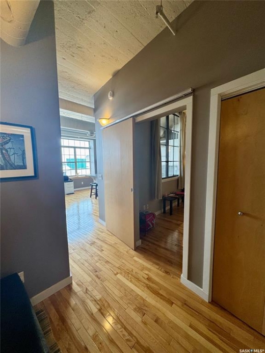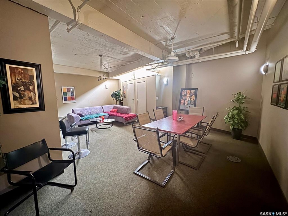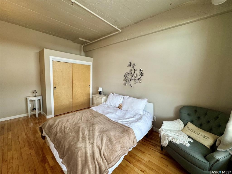 Welcome to the historic Fairbanks building, one of downtown Saskatoon's most recognizable heritage properties. Originally built in 1911 as the Fairbanks Morse warehouse, the building was thoughtfully converted into unique loft-style condos in 2006. This 2-bed, 2-bath suite is full of historic charm. Tall ceilings and oversized windows fill the open-concept living and kitchen area with natural light. The kitchen features an island, stainless steel appliances, and updated laminate countertops (2025). The primary bedroom offers a spacious layout with a 4-piece ensuite. The second bedroom features an original interior window overlooking the kitchen, a unique architectural detail that reflects the building's history. A convenient half bath is located near the entrance, and the unit includes in-suite laundry. Hardwood flooring runs throughout the main living areas, with tile in both bathrooms. This condo also includes a rare, fully insulated and heated detached garage (14' x 21'), along with a private storage room (6'2” x 11'10”) located in the basement. Residents can also enjoy the building's rooftop patio, amenities room, and guest suite available to rent for $40/night. A rare opportunity to own a distinctive loft in one of Saskatoon's most iconic heritage buildings.