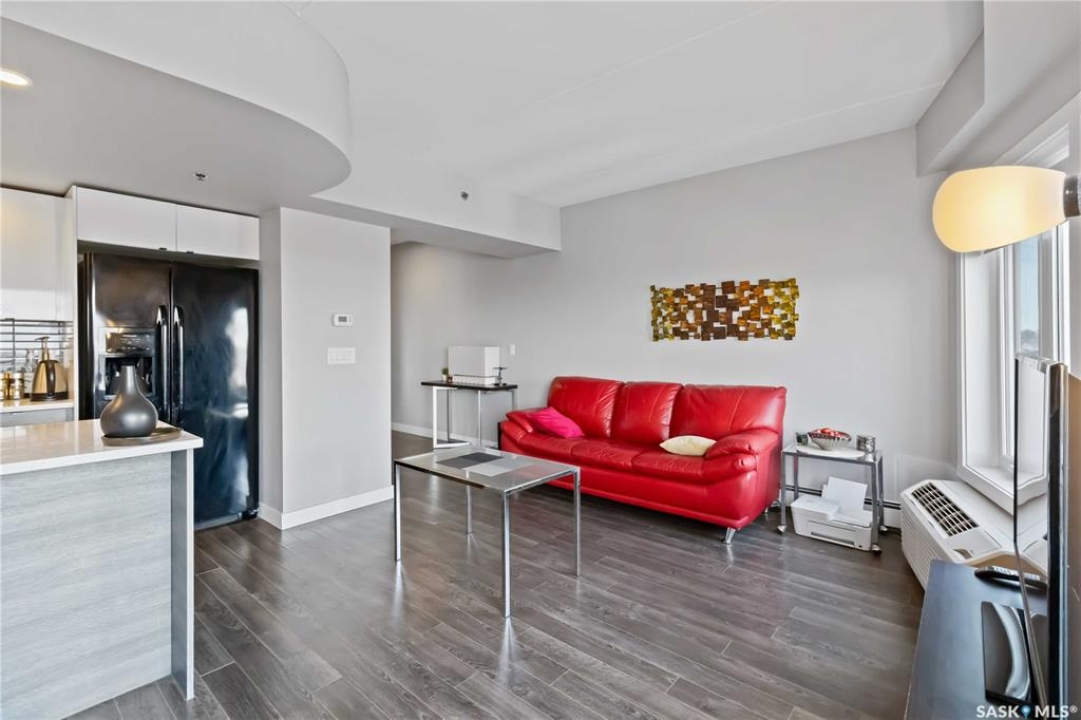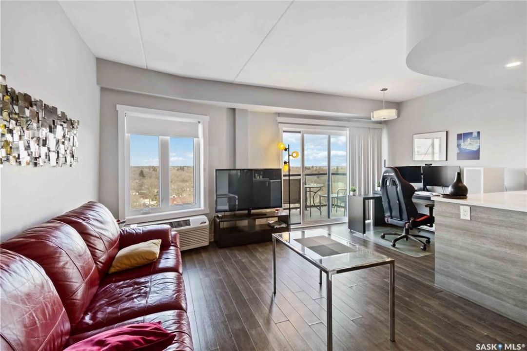 HIGH FLOOR CITY VIEWS, CITY LIVING, CORNER UNIT! Welcome to 550 4th Ave #801 a 601 sqft apartment located in downtown Saskatoon - originally built by North Prarie Developments. This primely located apartment features one bedroom and one bathroom. This unit features natural views of Saskatoon while also being located on the 8th floor with no neighbours located above. The living room and kitchen layout are hard to come by in this building with a spacious island and corner kitchen layout with the kitchen featuring quartz countertops, tile backsplash, and high-end finishes throughout. This unit benefits from plenty of natural sunlight during the day and beautiful sunset views. Featuring one underground parking space, park your car worry-free in downtown Saskatoon! Given its proximity to Royal University Hospital, Saskatoon City Hospital, the University of Saskatchewan, and Jim Pattison's Children's Hospital, this location is ideal for nearby commuters. In the summer time, take advantage of your proximity to Meewasin Trails, Condo Amenities like a rooftop BBQ space, and your proximity to local coffee shops and restaurants! This building was constructed using concrete - while also featuring modern design. Furniture can be negotiated! This unit is extremely unique featuring sunlight, being a corner unit, high floor, with a peninsula island, and spectacular location! Book your showing today!