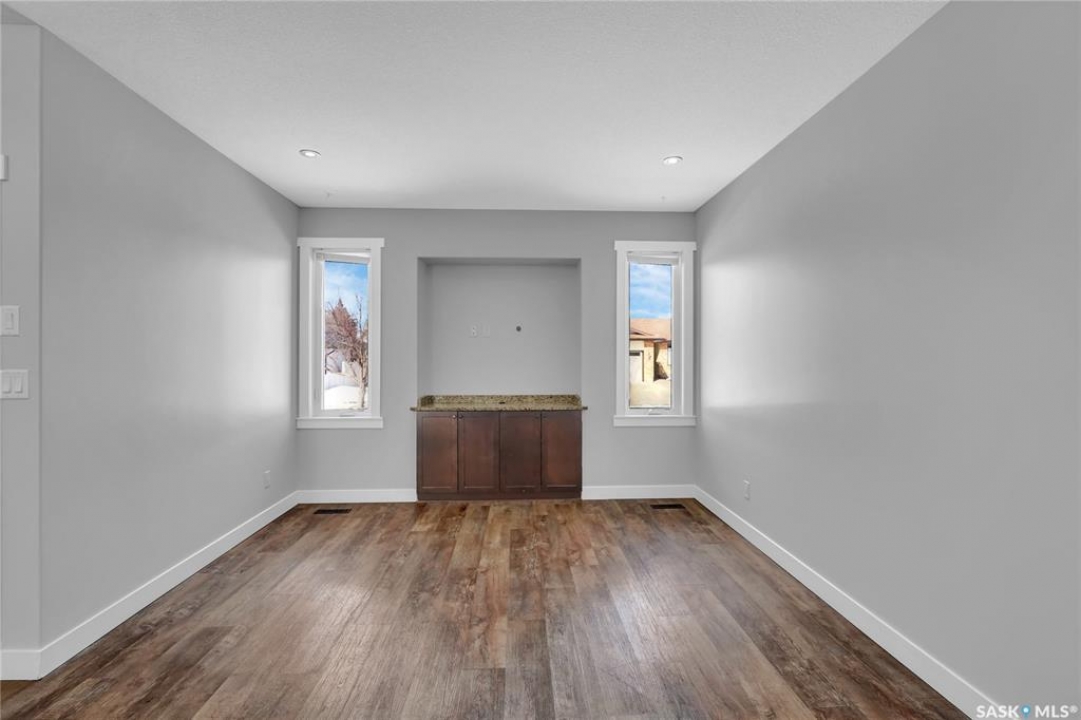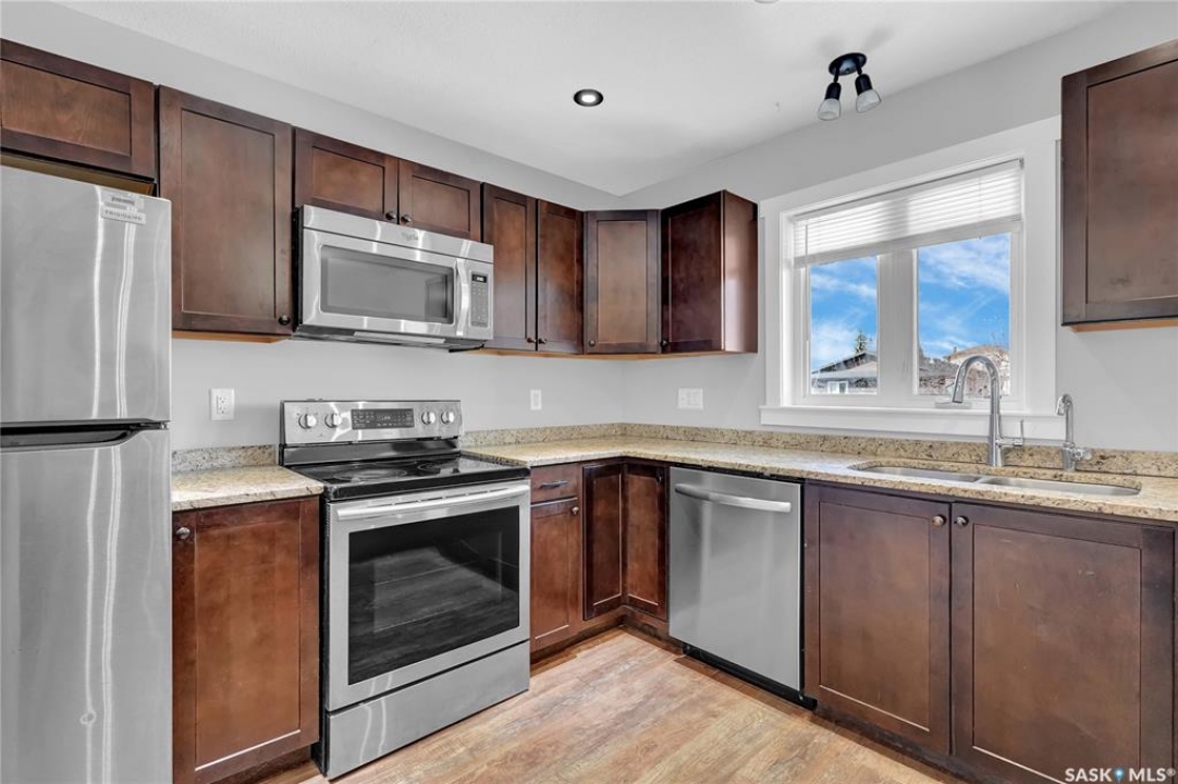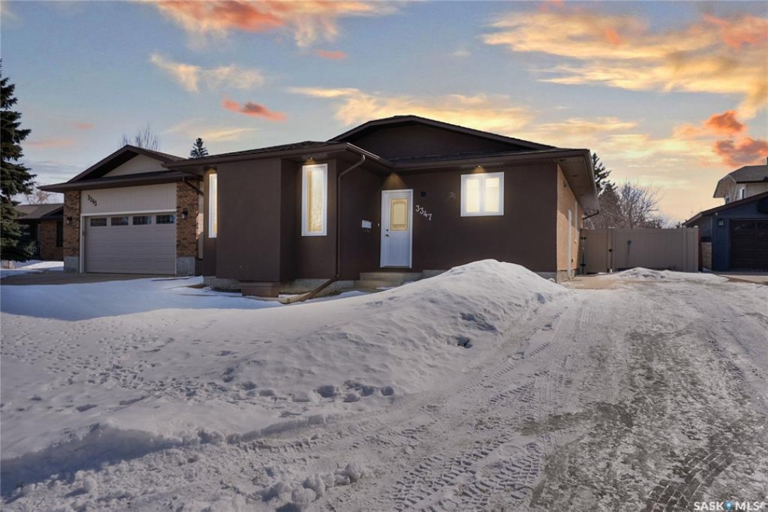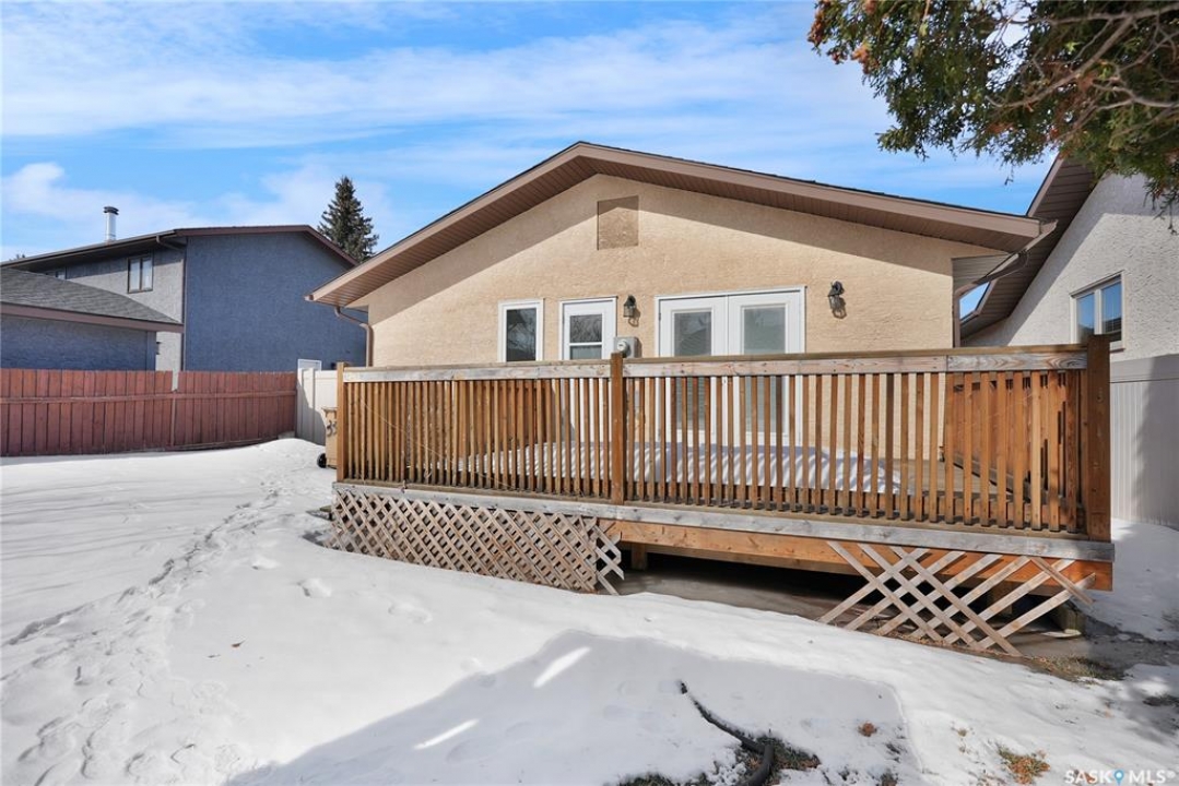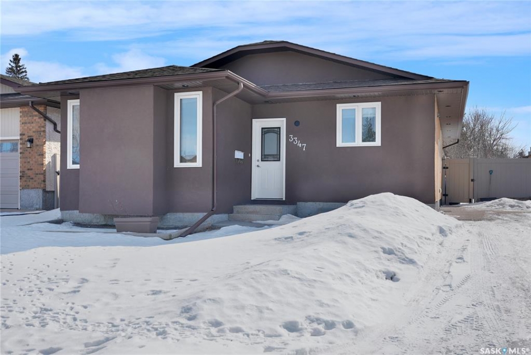 Welcome to 3347 E Coughlin Bay, a 4 bedroom, 3 bathroom bungalow nestled in the sought-after Wood Meadows. Offering 1,180 sq ft on a 4,590 sq ft lot, this home delivers value with thoughtful updates throughout and a fully developed lower level that nearly doubles your living space. From the moment you arrive, the charming curb appeal sets the tone. Step inside to a welcoming entryway that opens onto the upper level, where rich LVP flooring flows throughout the main living areas. The kitchen is a true highlight, featuring rich dark cabinetry, granite countertops, stainless steel appliances, and a generous peninsula that connects to the adjacent living space, perfect for everyday living and entertaining alike. The primary bedroom is a comfortable retreat complete with a walk-in closet, ceiling fan, patio doors leading to the rear deck, and its own private ensuite featuring a tiled walk-in shower with glass doors. A second bedroom and an updated main floor bathroom with a deep soaker tub and full tile surround round out the upper level. Downstairs, the fully developed basement offers incredible flexibility with two additional bedrooms, a spacious family room and a three-piece bathroom. Whether you're housing a growing family, setting up a home office, or hosting guests, the lower level has room for it all. A separate laundry room with Samsung washer and dryer and additional storage space complete the package below grade. Out back, a large wood deck overlooks the fully fenced yard, a great space for summer evenings, kids, and pets. The property also features updated windows throughout and an HRV system for year-round air quality. Wood Meadows is a well-established family neighbourhood with easy access to schools, parks, and all the amenities of Regina. Homes like this one with four bedrooms, three bathrooms, and a fully finished basement don't come along often at this price point. Room being used in basement as a bedroom doesn't meet current egress requirements.