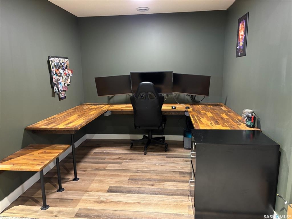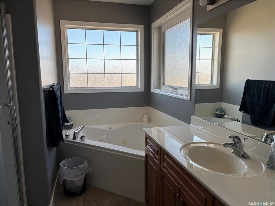 Welcome to this well laid out two-storey family home in the peaceful family friendly community of Emerald Park, only 8 minutes from Regina. Designed with both comfort and functionality in mind. Step inside to discover a bright and inviting main floor featuring open concept with large windows that fill the home with natural light, complemented by elegant hardwood flooring throughout. The kitchen showcases maple cabinetry, ample storage, and a layout perfect for both everyday living. Upstairs, you'll find three spacious bedrooms, including a generous primary suite complete with a private ensuite featuring a relaxing jacuzzi tub, your own personal retreat at the end of the day. With a total of 3.5 bathrooms, this home easily accommodates growing families or guests. The fully finished basement adds even more living space, including a custom den workspace, ideal for a home office or hobby area. The oversized heated double car garage provides year-round comfort and storage, while additional RV parking and 220 volt plug offers flexibility for your lifestyle needs. Backyard with large deck, gas bbq hook-up, shed, grass and greenery makes the perfect summer day outside. This home is just minutes from the golf course, parks, and all the amenities Emerald Park has to offer. Newer furnace. Water softener is owned. New roof shingles will be included in purchase. Shingle colour choice to be selected by buyer and replacement arrangements from Seller will be done prior to possession. Brand new air exchanger is being installed. This is a perfect opportunity to enjoy small-town living with modern comforts and low property taxes!