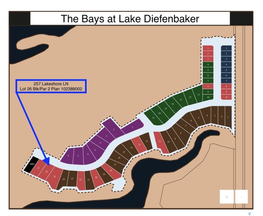Welcome to Lot 26 – 257 Lakeshore Lane at The Bays on Diefenbaker! This PRIME LAKEFRONT LOT offers a rare opportunity to own a SPACIOUS PROPERTY with a BEAUTIFUL SANDY SHORELINE right out front, with NO GST applicable and PRICED TO SELL. Located just 10 km WEST OF ELBOW, Saskatchewan, and within easy reach of Saskatoon (110 km) and Regina (191 km), this GROWING RESORT COMMUNITY is quickly becoming a SOUGHT-AFTER DESTINATION, offering EXPANSIVE VIEWS of Lake Diefenbaker and its THREE BAYS along with plenty of room to build. Owners have the opportunity to connect to the MUNICIPAL LINE 19 potable water system (connection fee of $5,000 and annual fee of $960), making it easy to plan for either a SEASONAL GETAWAY or a YEAR-ROUND HOME. Whether you're looking to build your DREAM LAKEFRONT RETREAT or invest in a VIBRANT RECREATIONAL COMMUNITY, The Bays on Diefenbaker offers an EXCEPTIONAL LIFESTYLE. CALL TODAY for more details!