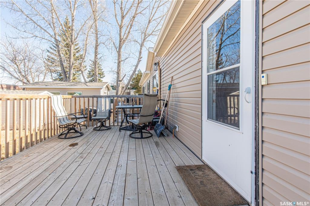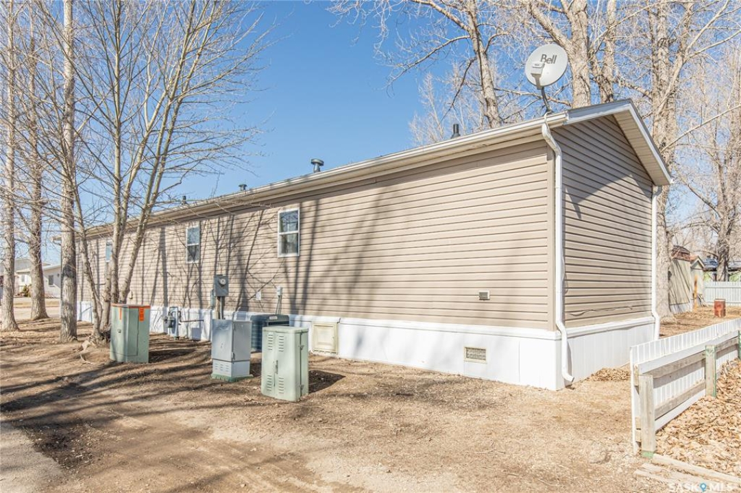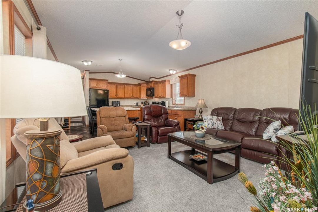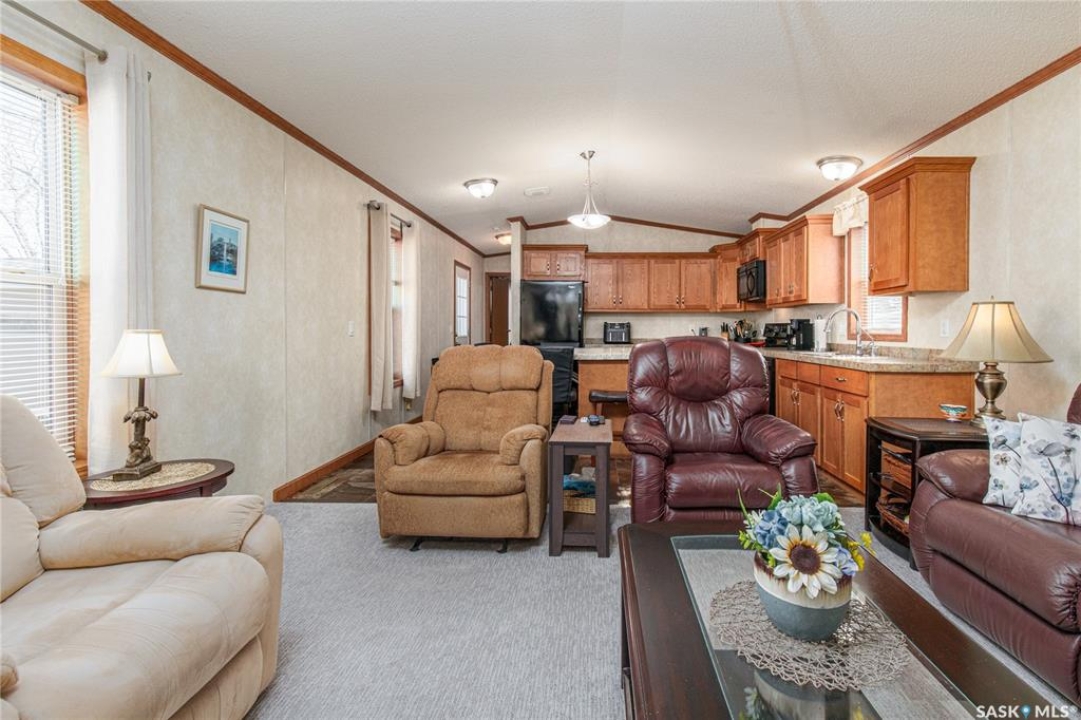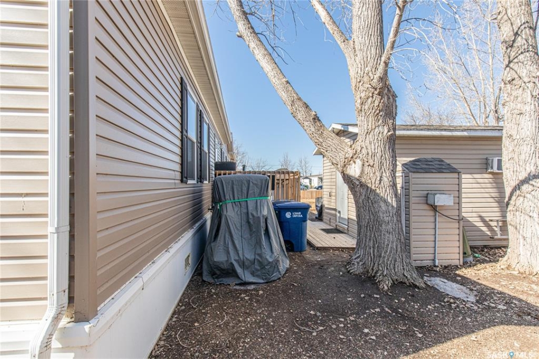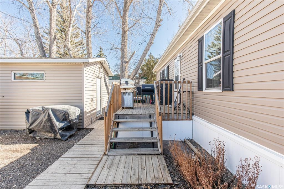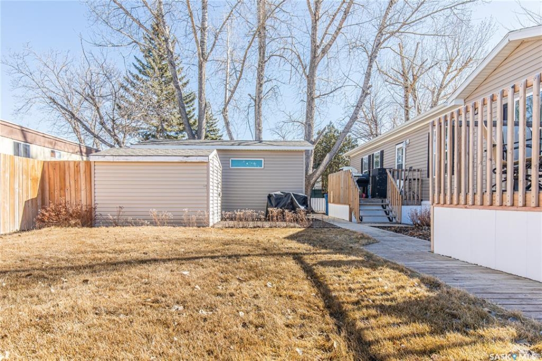 Welcome to this well-maintained 2015 mobile home located in the desirable Prairie Oasis Trailer Court! Situated on a partially fenced corner lot, this property offers a great blend of comfort, functionality & outdoor space. Outside you can enjoy the landscaped yard complete with lawn, perennials & a garden area-perfect for those who love spending time outdoors. The home features both a front & back deck, ideal for relaxing or entertaining. A standout bonus is the fully equipped “he/she shed” offering electric baseboard heat, A/C & power. Even better, the heat can be turned on from inside the home for added convenience. This versatile space also includes cabinets, a fridge & a TV mount-perfect for a hobby space, office or retreat. Inside the home, you'll find a bright open-concept layout connecting the kitchen, dining & living room. The kitchen offers ample oak cabinetry with soft-close features, plenty of counter space & a large eat-at island-chairs included-eliminating the need for a dining table. The living room features newer carpet (2025), adding a fresh & cozy feel. This home offers 3 bedrooms & 2 bathrooms. At the front, there are two bedrooms along with a 4-piece main bathroom. The primary bedroom is privately located at the rear, featuring newer carpet (2025), a walk-in closet & a 3-piece ensuite. Additional highlights include C/A, 100-amp service & a utility room with laundry. The home is CSA approved, properly tied down & includes heat tape on sewer & water lines. Exterior updates include vinyl siding completed in 2019. All major appliances are included: fridge, stove, built-in dishwasher, garburator, microwave hood fan, water filtration system, washer & dryer. Affordable, move-in ready & packed with extras-this is a fantastic opportunity you won't want to miss! Monthly fees are $851.97 which breaks down to $146.11/m for city taxes, $16.86/m for garbage/recycling & $689/m for lot rent which includes water, sewer, snow removal, park maintenance