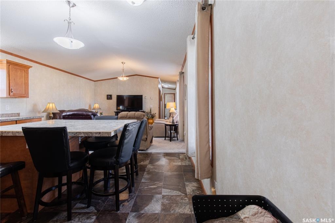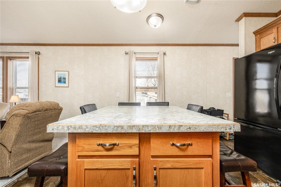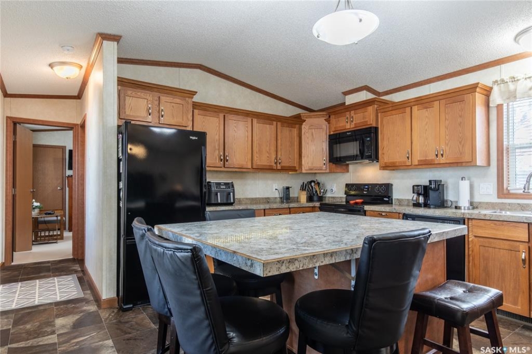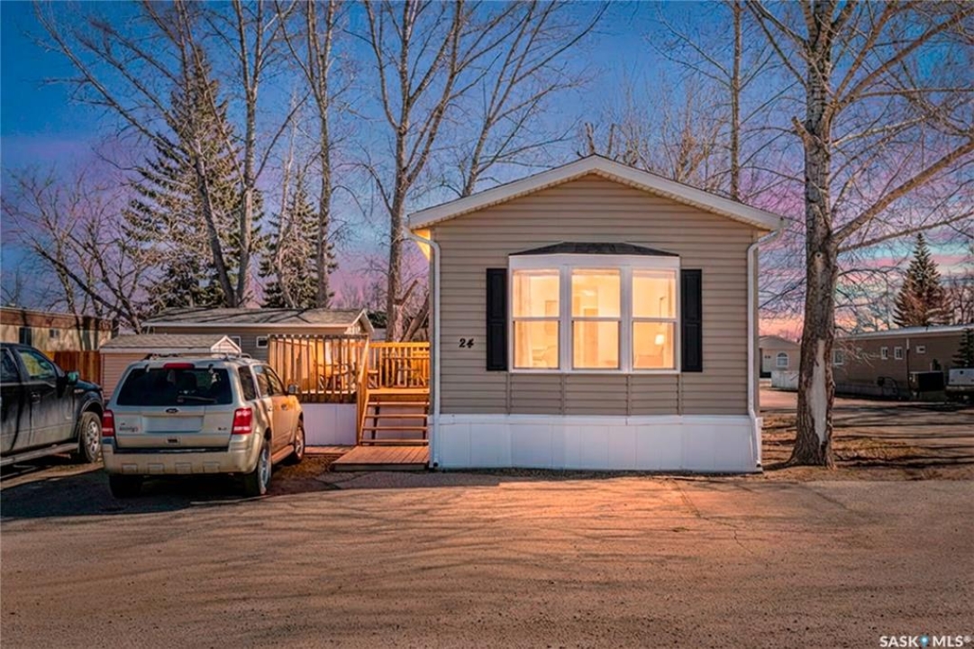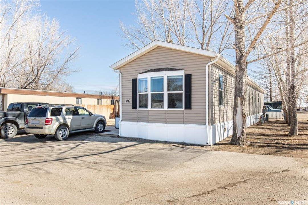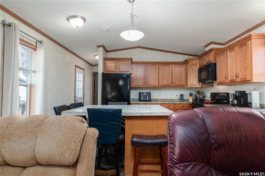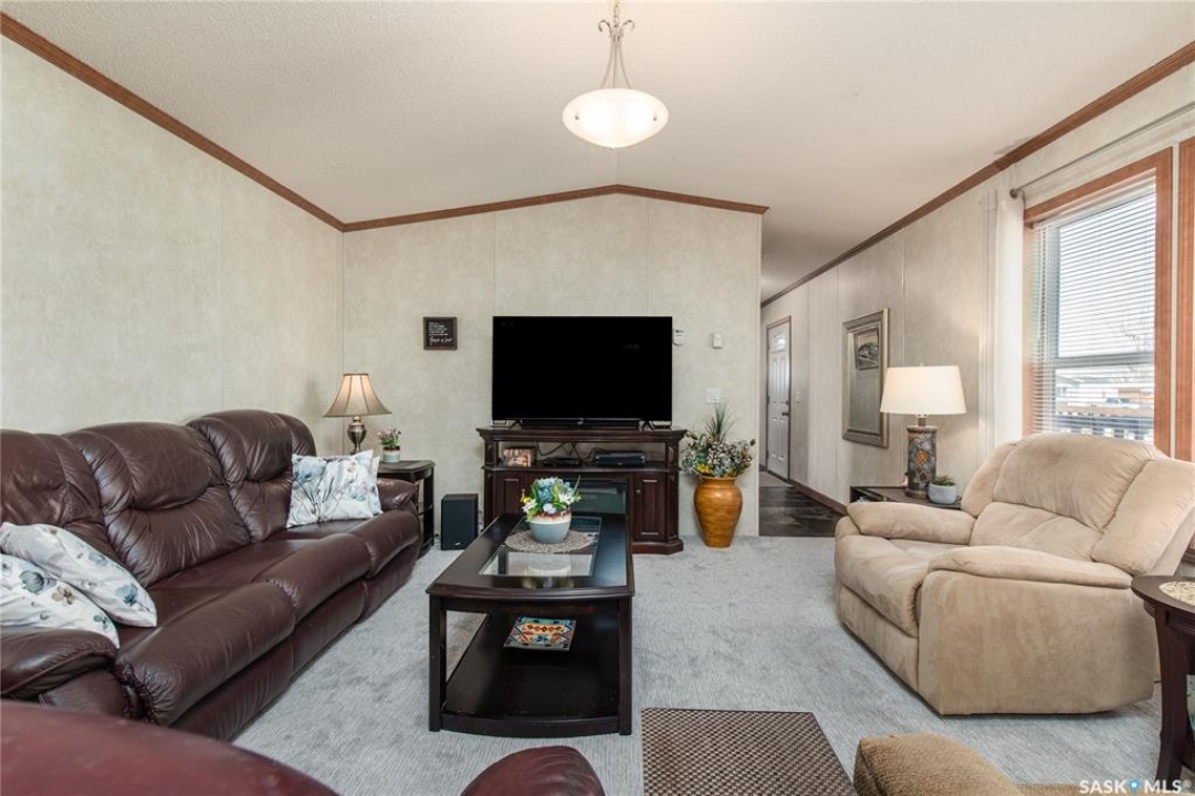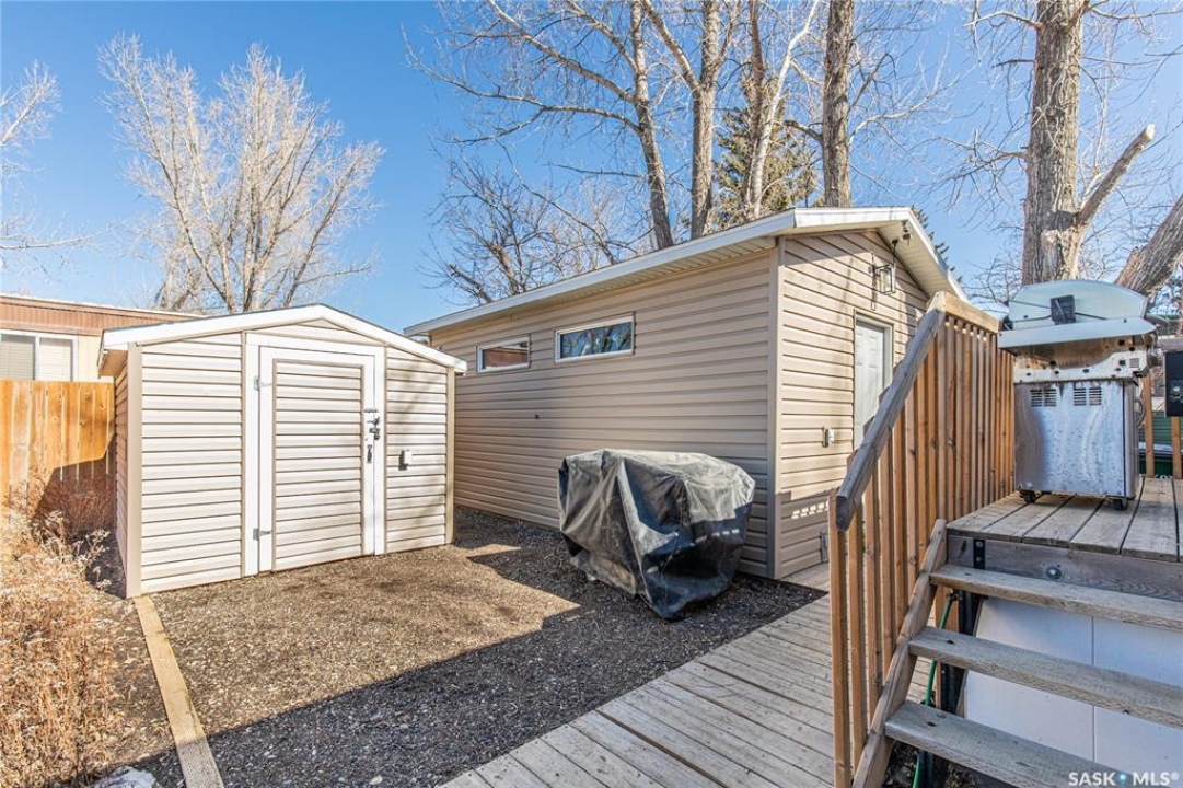 Welcome to this well-maintained 2015 mobile home located in the desirable Prairie Oasis Trailer Court! Situated on a partially fenced corner lot, this property offers a great blend of comfort, functionality & outdoor space. Outside you can enjoy the landscaped yard complete with lawn, perennials & a garden area-perfect for those who love spending time outdoors. The home features both a front & back deck, ideal for relaxing or entertaining. A standout bonus is the fully equipped “he/she shed” offering electric baseboard heat, A/C & power. Even better, the heat can be turned on from inside the home for added convenience. This versatile space also includes cabinets, a fridge & a TV mount-perfect for a hobby space, office or retreat. Inside the home, you'll find a bright open-concept layout connecting the kitchen, dining & living room. The kitchen offers ample oak cabinetry with soft-close features, plenty of counter space & a large eat-at island-chairs included-eliminating the need for a dining table. The living room features newer carpet (2025), adding a fresh & cozy feel. This home offers 3 bedrooms & 2 bathrooms. At the front, there are two bedrooms along with a 4-piece main bathroom. The primary bedroom is privately located at the rear, featuring newer carpet (2025), a walk-in closet & a 3-piece ensuite. Additional highlights include C/A, 100-amp service & a utility room with laundry. The home is CSA approved, properly tied down & includes heat tape on sewer & water lines. Exterior updates include vinyl siding completed in 2019. All major appliances are included: fridge, stove, built-in dishwasher, garburator, microwave hood fan, water filtration system, washer & dryer. Affordable, move-in ready & packed with extras-this is a fantastic opportunity you won't want to miss! Monthly fees are $851.97 which breaks down to $146.11/m for city taxes, $16.86/m for garbage/recycling & $689/m for lot rent which includes water, sewer, snow removal, park maintenance