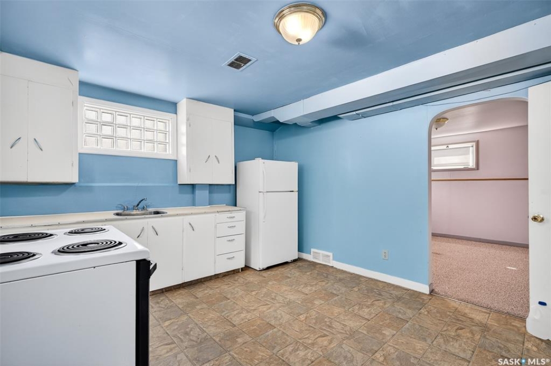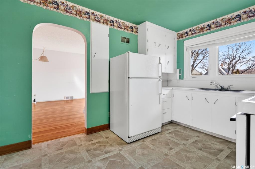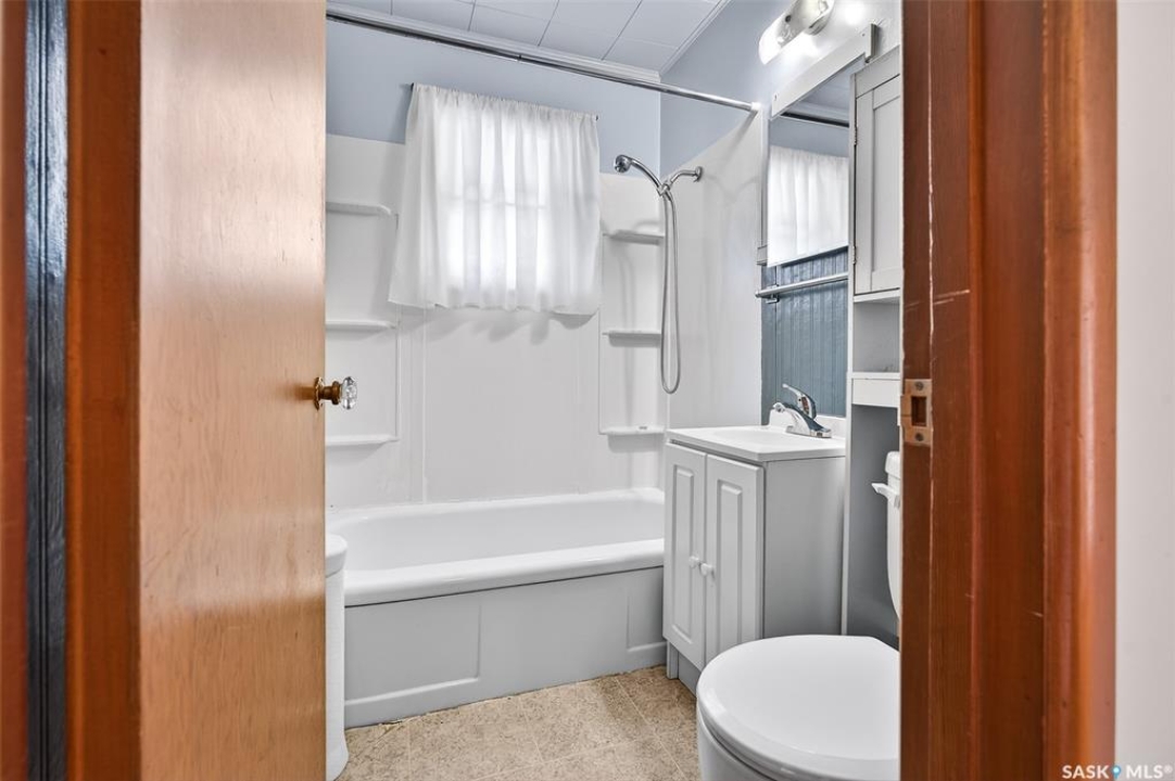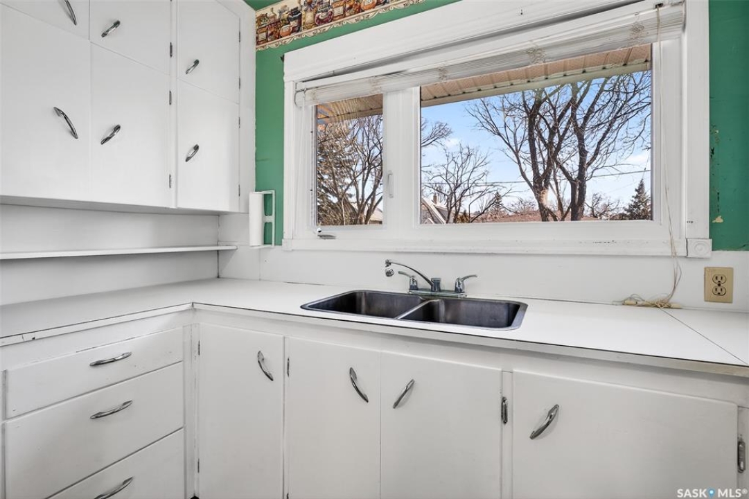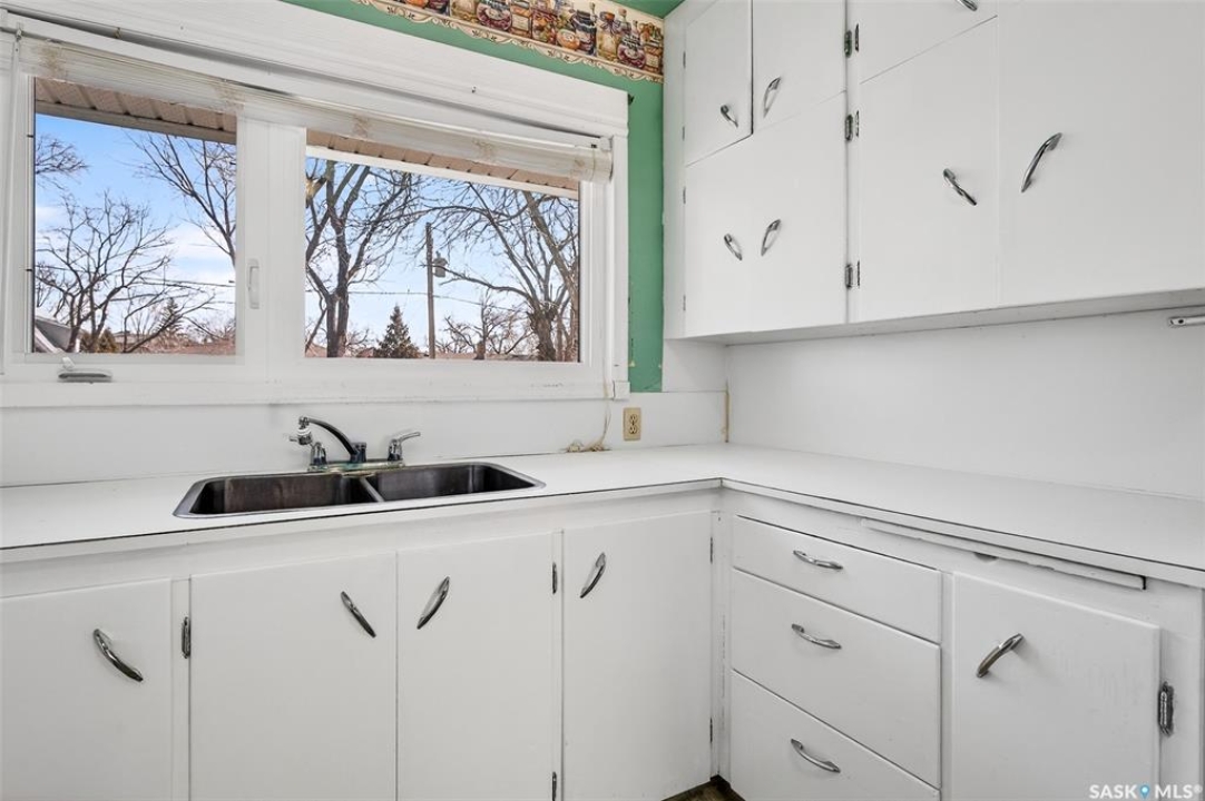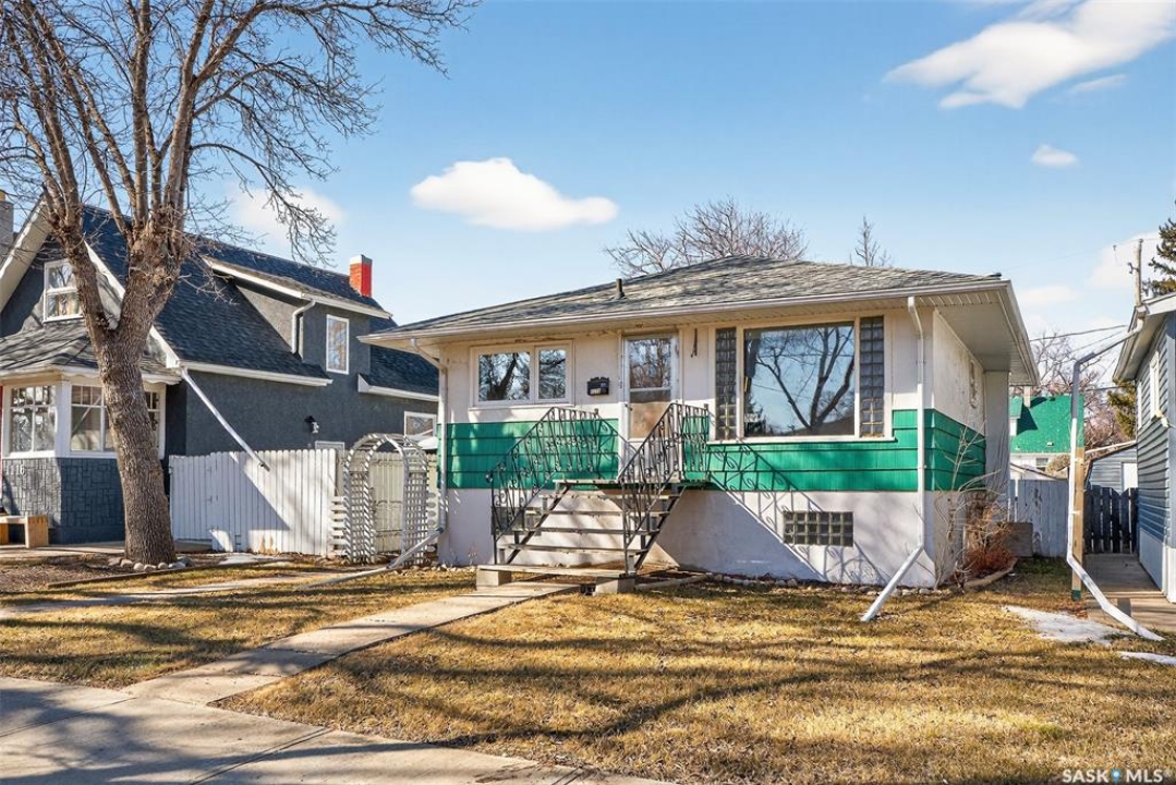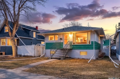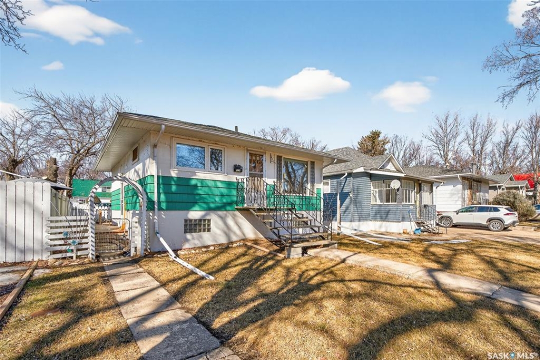 Charming, raised bungalow ideally located close to Sask Polytech, offering excellent potential for homeowners and investors alike! This cozy home features 2 bedrooms and 2 bathrooms, with hardwood floors in the living room and bedrooms. The bright and adorable eat-in kitchen provides a welcoming space for everyday living. The lower level includes a non-regulation basement suite, making it a fantastic opportunity for rental income or extended family living. Downstairs you'll find a spacious family room, large kitchen, 3-piece bathroom, and an oversized utility/laundry room with plenty of storage space. Outside, the property boasts a generously sized yard complete with a fenced backyard, lean-to shed, and a small garage with carriage-style doors. There is also convenient off-street parking for two vehicles on the rear gravel driveway. Important updates have already been completed, including a replaced sewer line, upgraded electrical panel, and newer shingles, soffit, and eavestroughs—adding peace of mind for future owners. With a bit of TLC, this home offers incredible value and is perfect for buyers looking to build equity or take on a rewarding project in a great location.