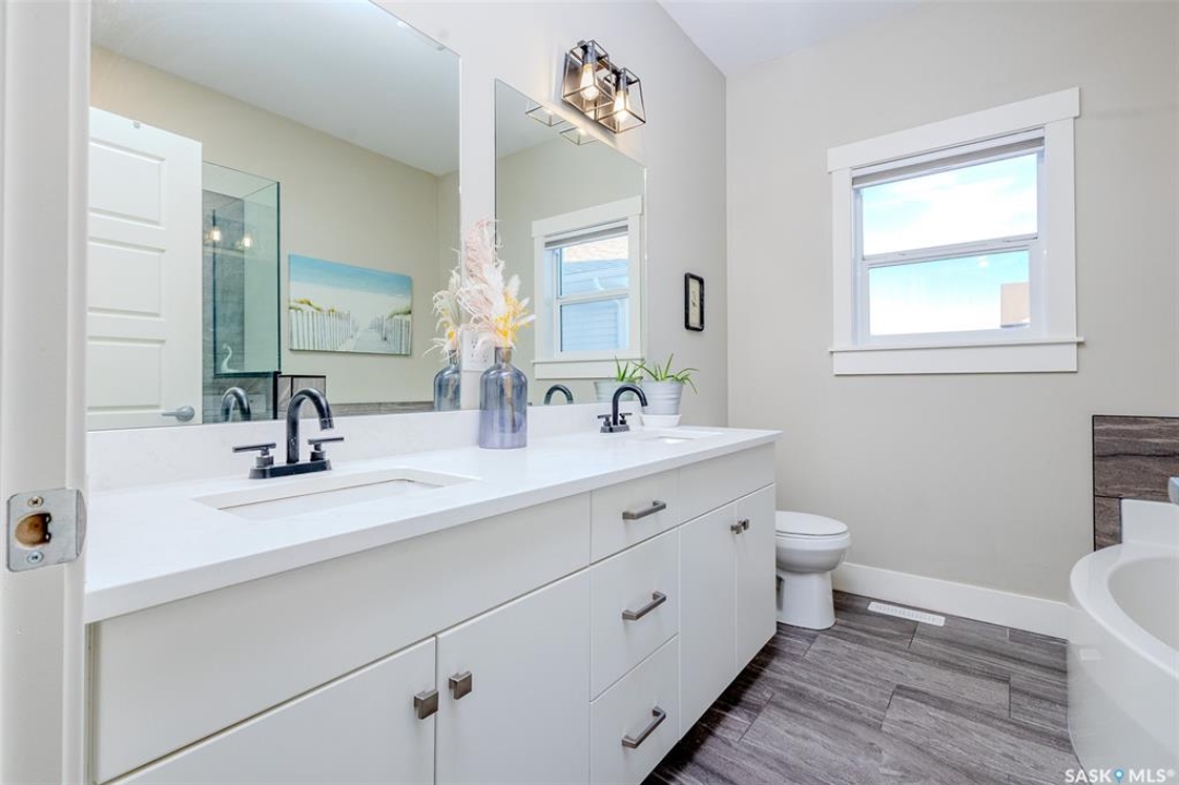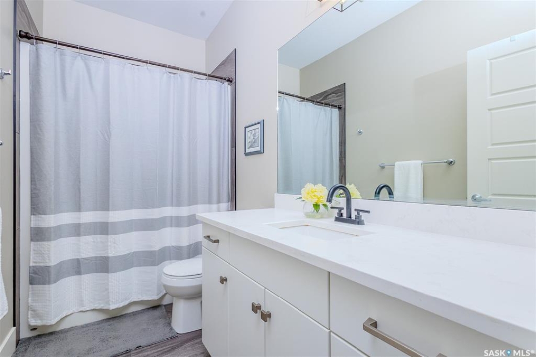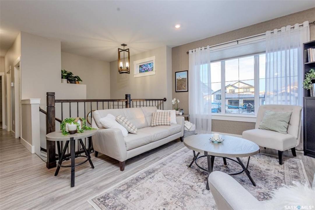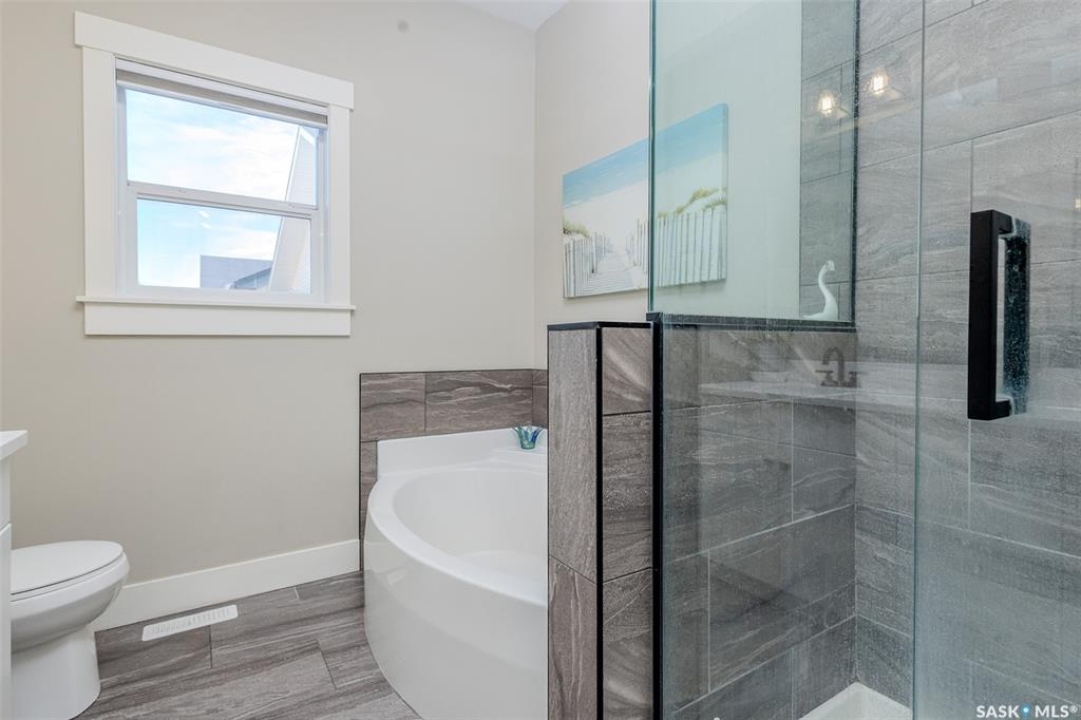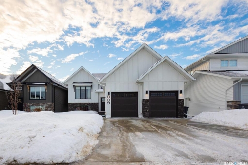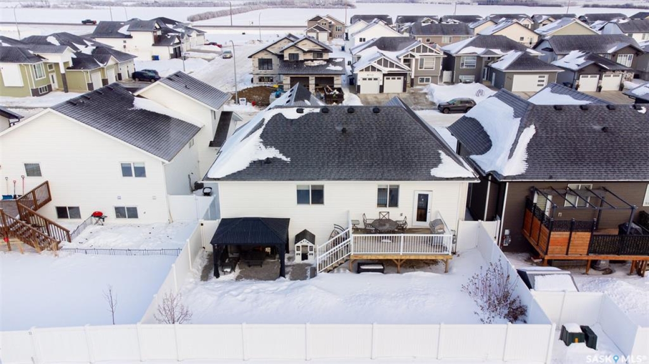 Welcome to this beautiful bievel in the growing city of Warman, offering great street appeal and a bright open layout with 9 foot ceilings and large windows that bring in plenty of natural light. Built just 5 years ago, this property already includes many of the extras that new builds often do not, including fencing, appliances, custom window coverings, and a fully finished south facing backyard so you can move in and enjoy right away. The kitchen is well laid out with quartz countertops, tiled backsplash, stainless steel appliances, built in dishwasher, microwave hood fan, double undermount sink, corner pantry, and a large eat up island over 8 feet in length, ideal for daily use and entertaining. The primary bedroom offers a comfortable retreat with a walk in closet and a spacious 5 piece ensuite featuring a soaker tub, separate tiled shower, dual sinks with quartz countertops, and ceramic tile flooring. The main floor also includes two additional bedrooms and a second full bathroom with quartz countertops and ample counter space, providing flexibility for family, guests, or a home office. The double attached garage features over 10 foot 6 inch ceilings, allowing for excellent storage options. The backyard is fully finished with vinyl fencing, deck, patio with covered gazebo, and perennial flower beds, creating a great space to relax or host. The basement is insulated and polyed with large windows and is ready for future development. With strong curb appeal, a functional layout, modern finishes, and a great location in Warman, this home presents a solid opportunity. Call your Realtor today to book your private showing!
