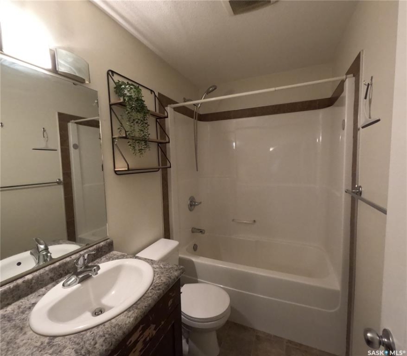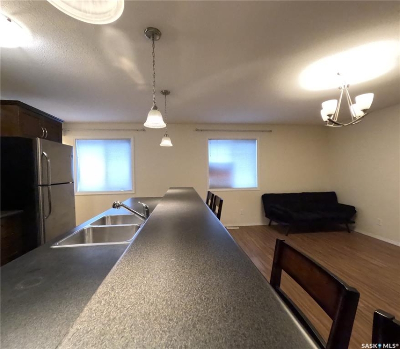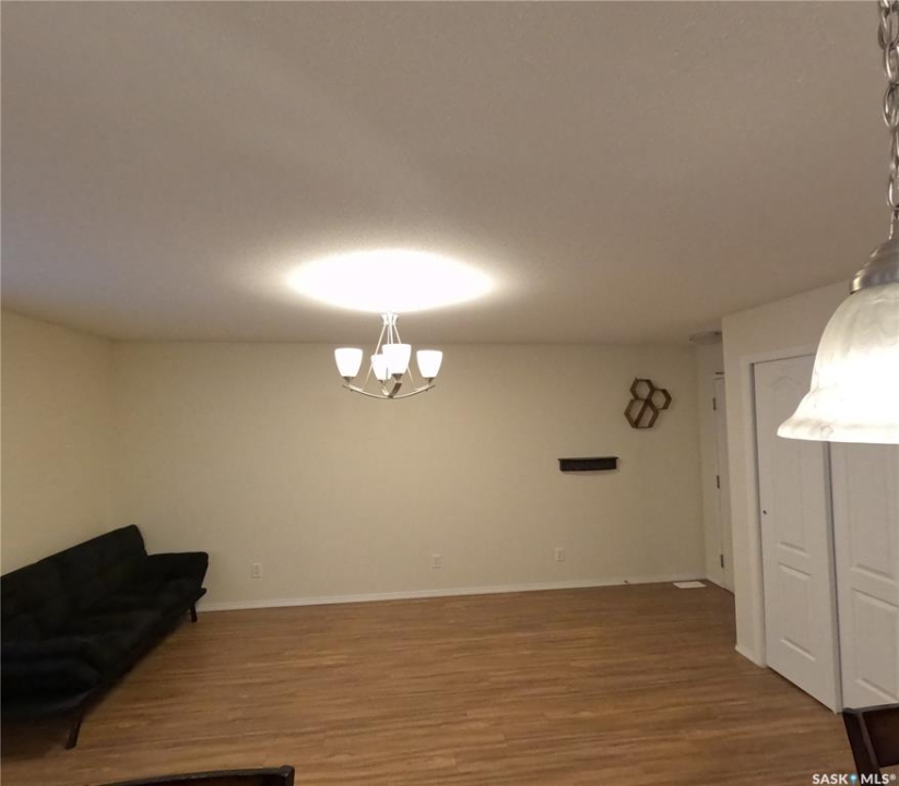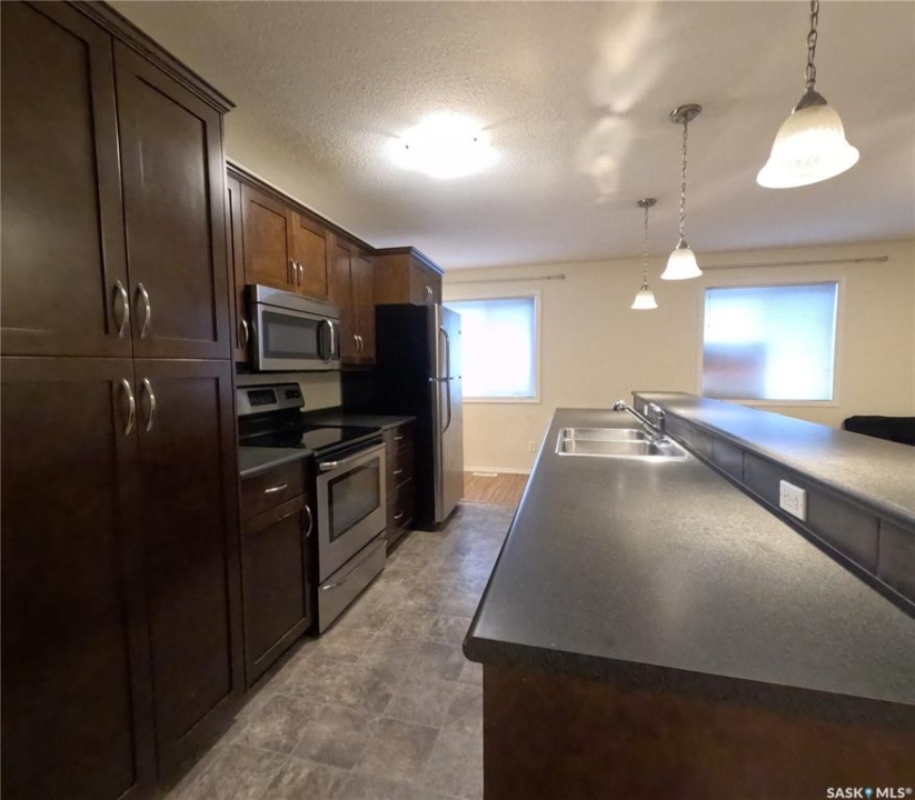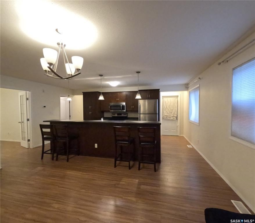Stylish, Move-In Ready, Modern condo featuring a bright open-concept design that's both functional and inviting. The contemporary kitchen boasts a large island with breakfast bar — perfect for cooking, entertaining, or enjoying a quick meal. All appliances are included for your convenience! Just off the kitchen, a private balcony offers the ideal spot to relax and enjoy your morning coffee. The sun-soaked living room is filled with natural southern light, creating a warm and cheerful atmosphere. This home includes two spacious bedrooms with newer carpet, plus a versatile bonus room with elegant glass French doors — ideal as a home office, den, or dining space. A full bathroom and convenient in-suite stackable laundry add to the comfort. Located near Wakamow trails for scenic nature walks, just 4 minutes to the base and 2 minutes to downtown. Your designated, electrified parking stall is right outside the secure front entrance. Enjoy a truly carefree lifestyle — perfect for first-time buyers, retirees, or anyone seeking a pet-friendly, low-maintenance home.