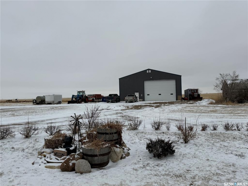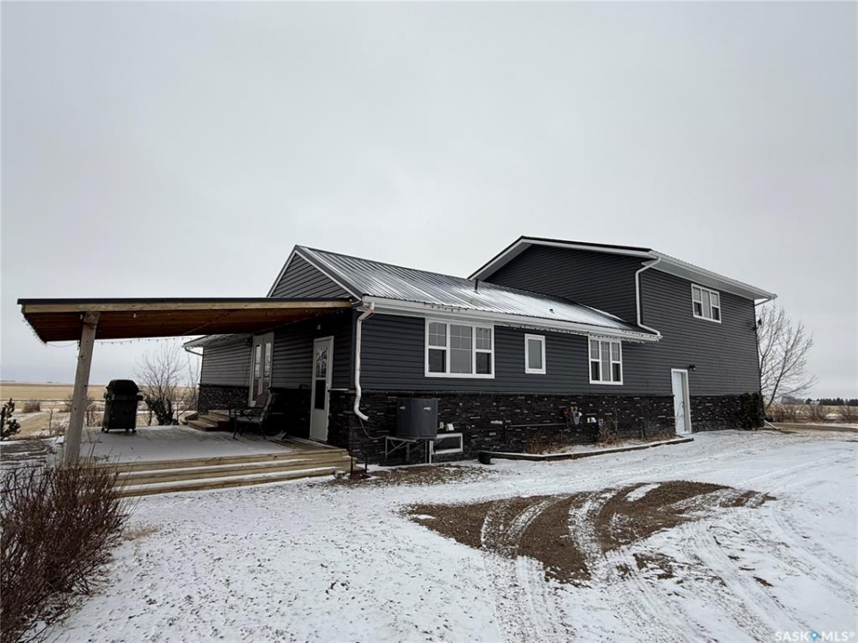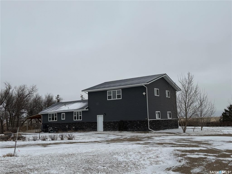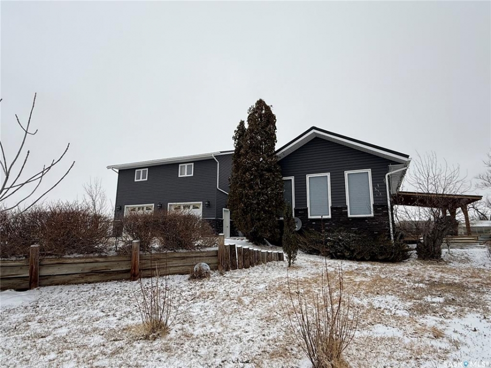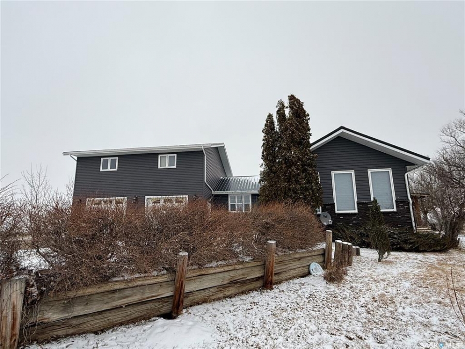 SE-04-25-20 W3 Space, Comfort & Functionality. Located just 4.5 miles south of Eston, this beautifully maintained acreage offers the perfect blend of space and rural charm. Featuring approx. 1,900 sq. ft. two-storey home (originally built in 1961 with a well-planned addition in 1998) Step inside to a large open-concept main floor that seamlessly connects the kitchen, dining, and living areas—perfect for everyday living and entertaining. The sunken living room is a cozy highlight, complete with a stunning stone radiant gas fireplace. The spacious dining area features garden doors that lead out to a covered deck, overlooking the beautifully landscaped yard. The main level also includes a useful bedroom (ideal as an office or den), a bright and versatile office/gym space filled with natural light, and a 4-piece bathroom with a jetted tub and tiled surround. Convenient access to the attached 30' x 30' double garage is also found on this level. Upstairs, you'll find three large bedrooms, including an expansive primary suite with windows on both sides and a walk-in closet. Most of the home has been upgraded with new triple-pane windows for improved efficiency and comfort. The basement offers even more functional space, including a family room, laundry/utility area, additional office space, and a 3-piece bathroom. Outside, the property truly shines. Enjoy the meticulously landscaped yard featuring stonework, tiered steps, mature trees, and a new covered deck. Additional features include: 44' x 76' heated shop with gas radiant heat, concrete floor, oil catch drain, and 24' x 18' power doors. The home has a metal roof and updated siding with stone accents. Cement patio area. Dugout located behind the shop. Large shed, barn, and greenhouse for added versatility .This is a rare opportunity to own a well-equipped acreage in a great location—offering space, privacy, and everything you need for country living.