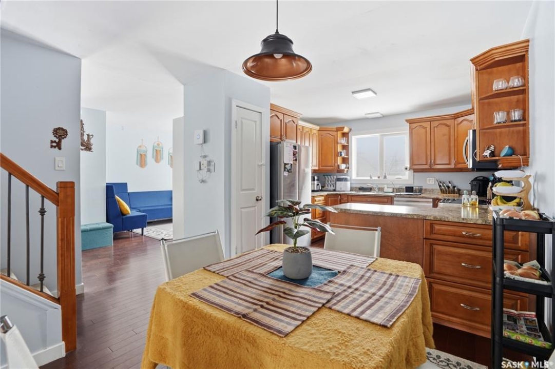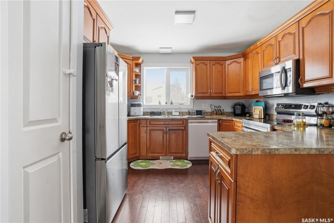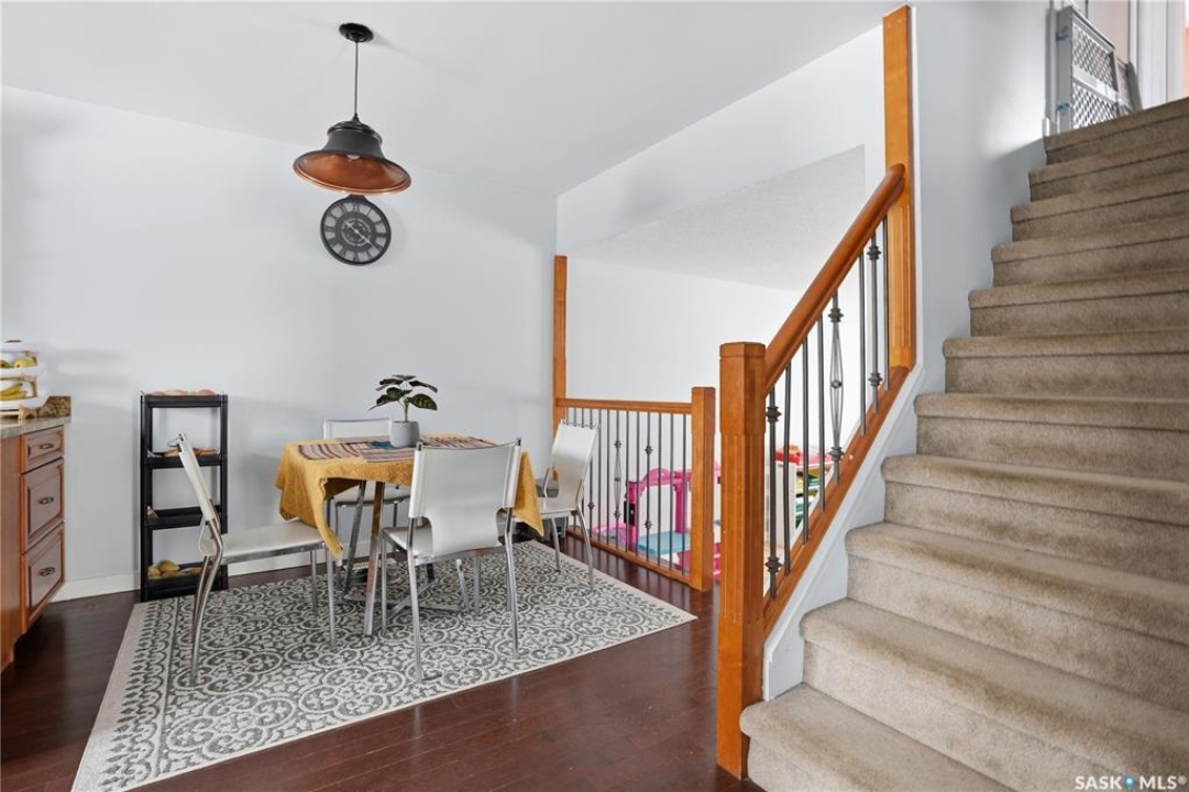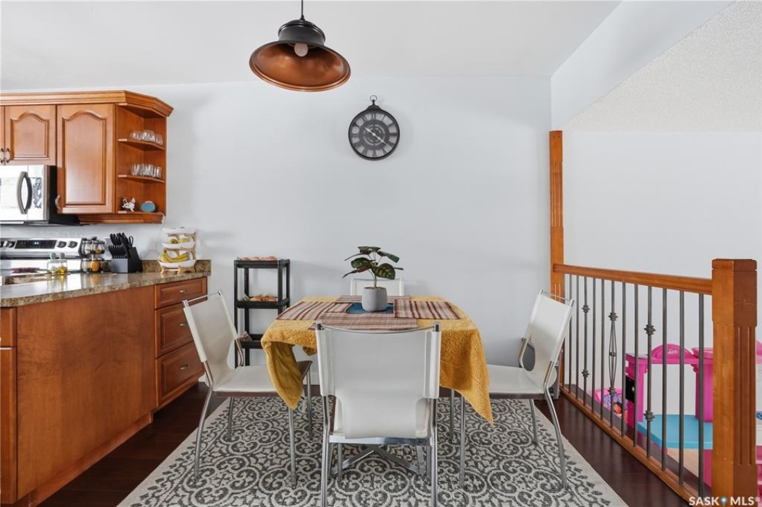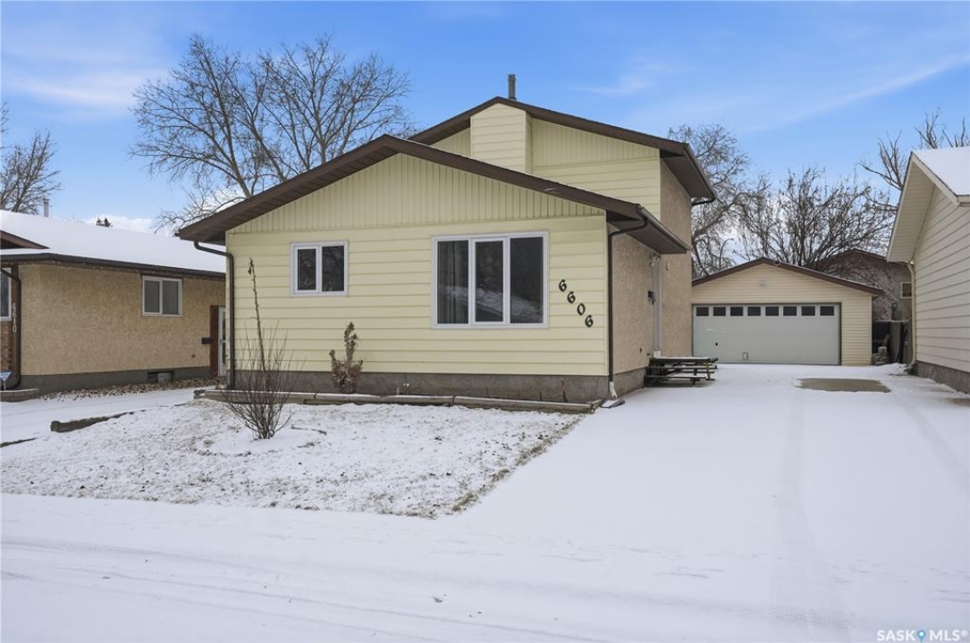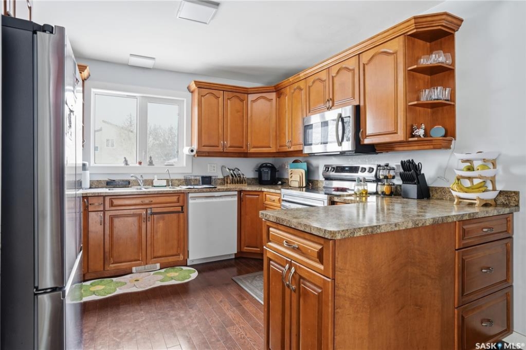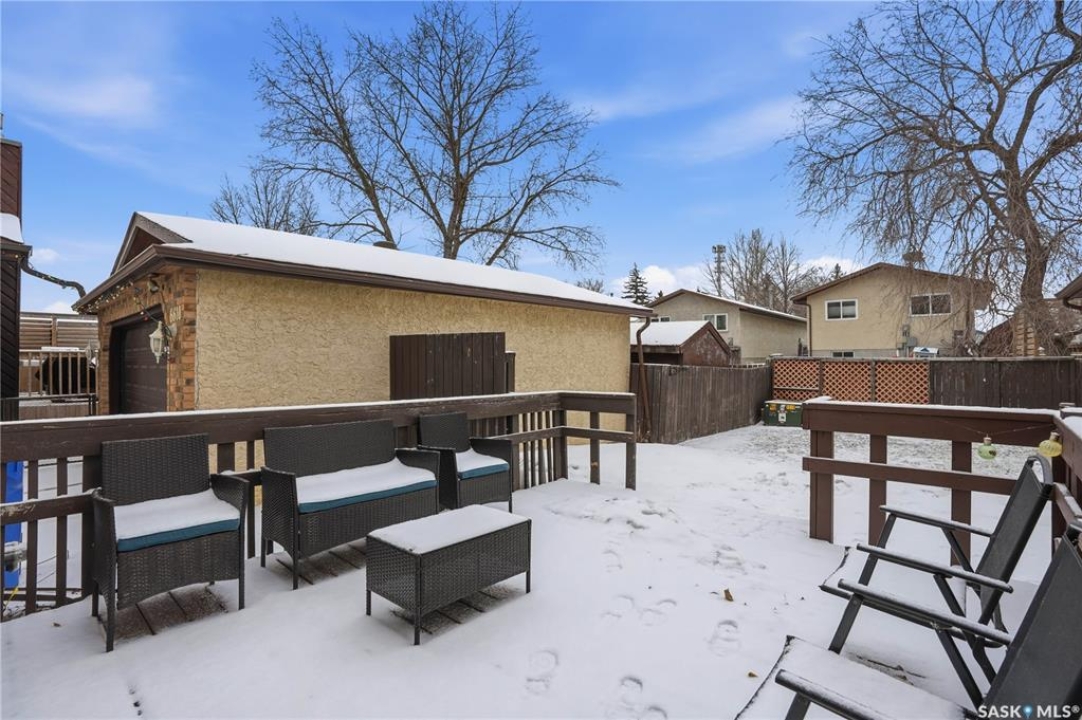 Move-in ready, updated, and ideally located in Regina's Northwest — just minutes from schools, parks, and everyday amenities. This spacious home offers a functional layout with multiple living areas. The main floor features a bright living room, a well-appointed kitchen with ample cabinetry, counter space, and stainless steel appliances — refrigerator (2021), stove (2021), and dishwasher (2024), Microwave plus a convenient dining nook. A sunken family room opens to the private deck and yard, perfect for relaxing or entertaining. The main floor also includes a primary bedroom with a renovated ensuite in modern tones. Upstairs offers three additional bedrooms, including a second primary with a walk-in closet and easy access to the 4-piece bathroom. Recent updates include triple pane PVC windows, new exterior doors(2022), furnace & A/C (2022), recently replaced house shingles, and garage shingles (2025) — adding efficiency and value. The basement features a rec room, laundry, and excellent storage space. Outside, enjoy a private yard with deck, green space, and an oversized double detached garage. A great opportunity to own a well-updated home in a family-friendly location close to schools and amenities. Book your showing today.