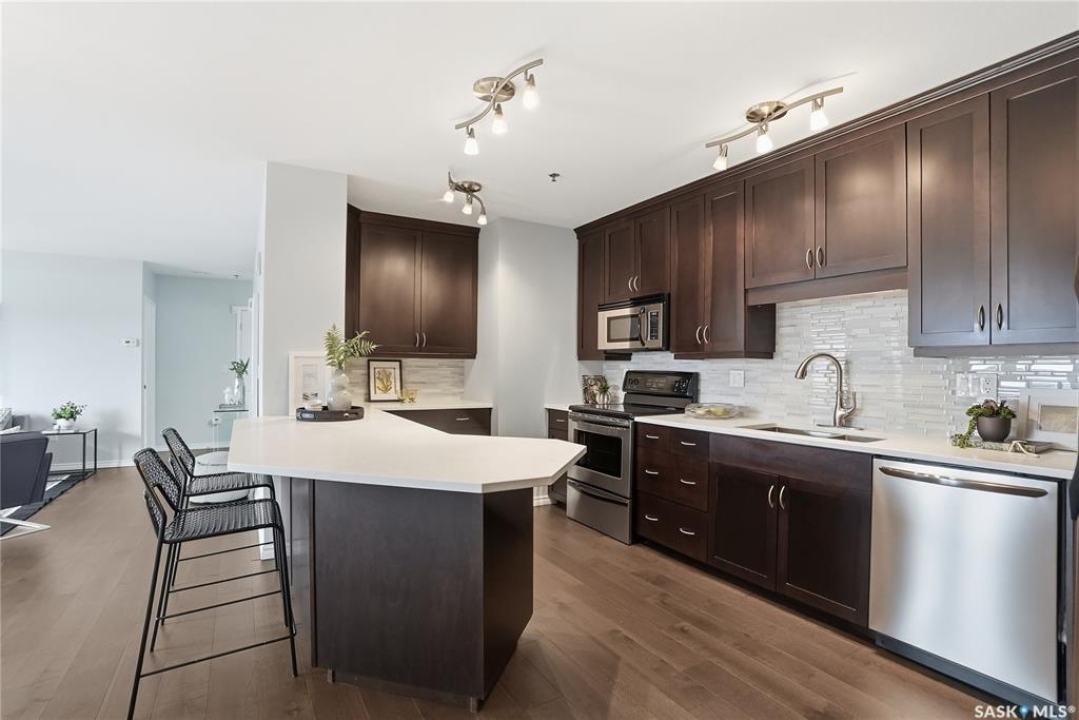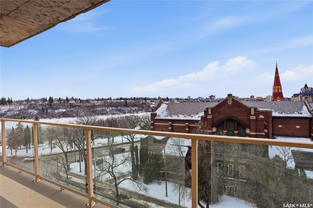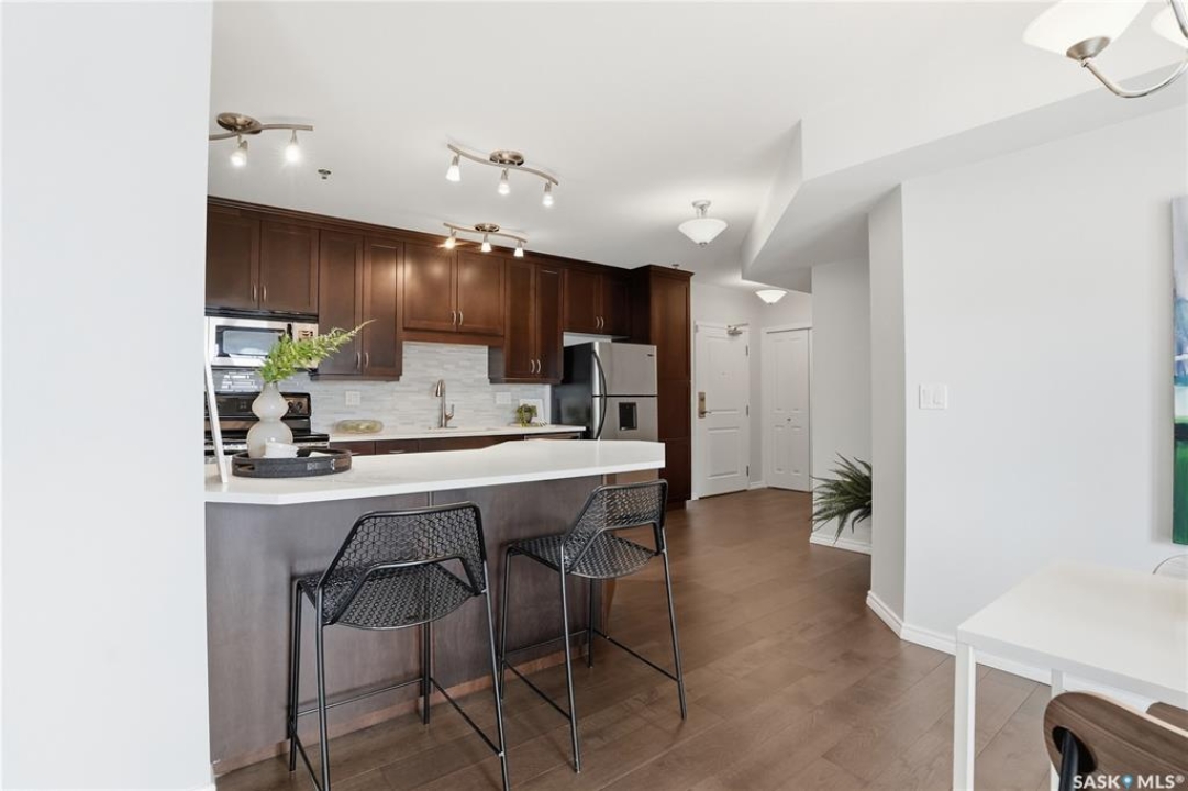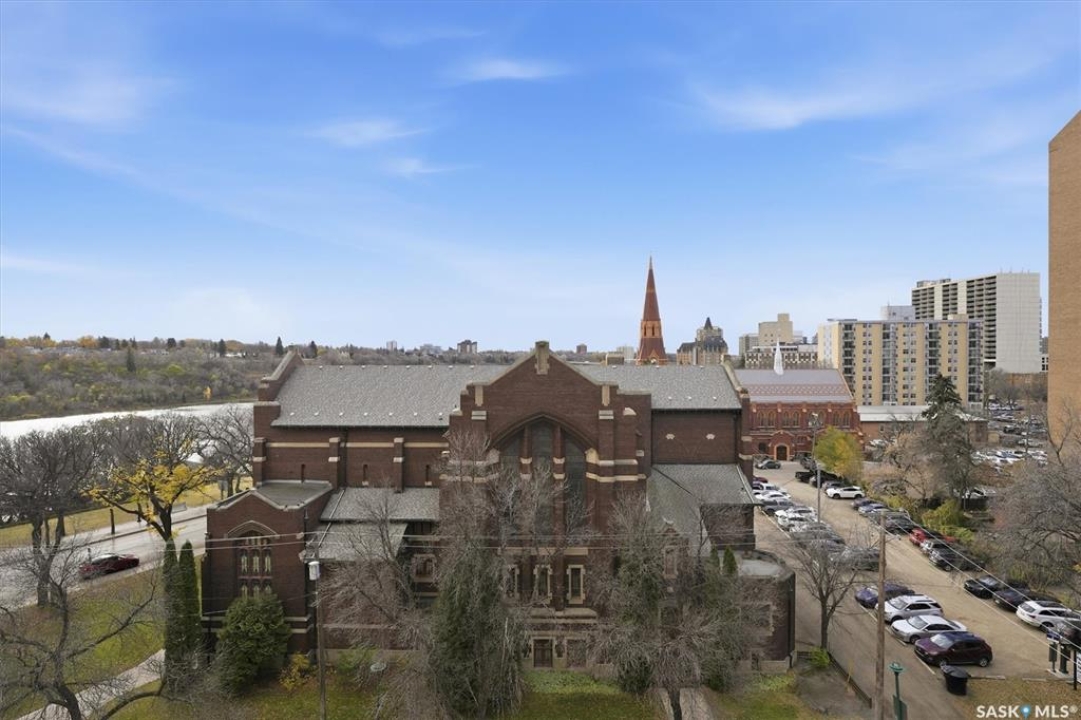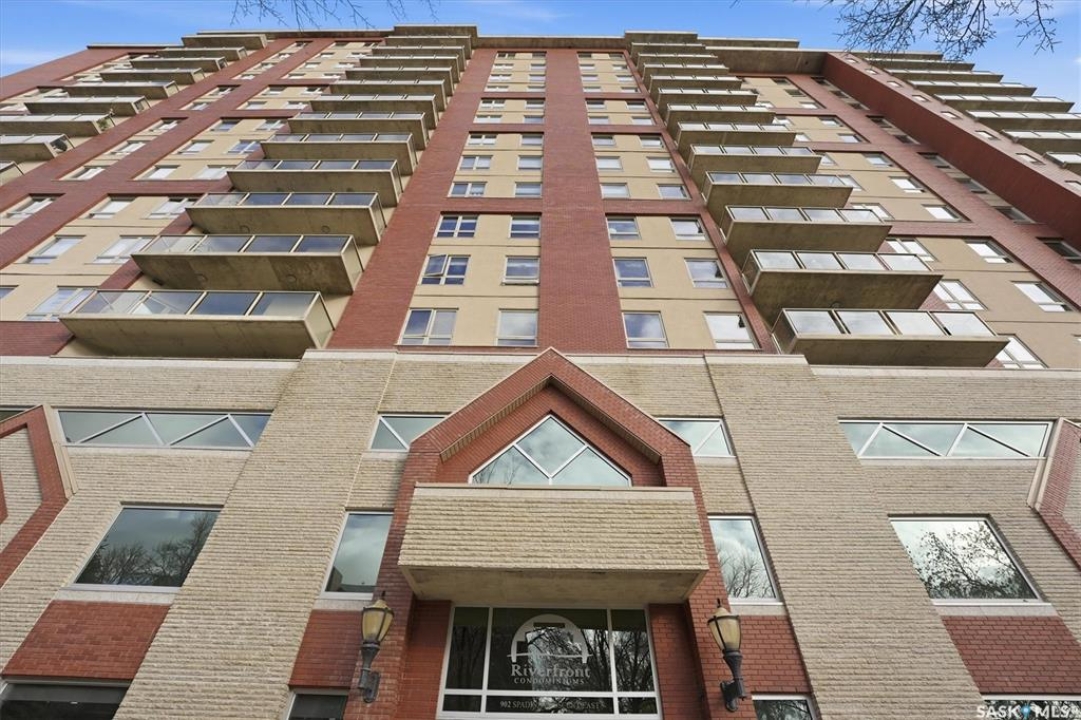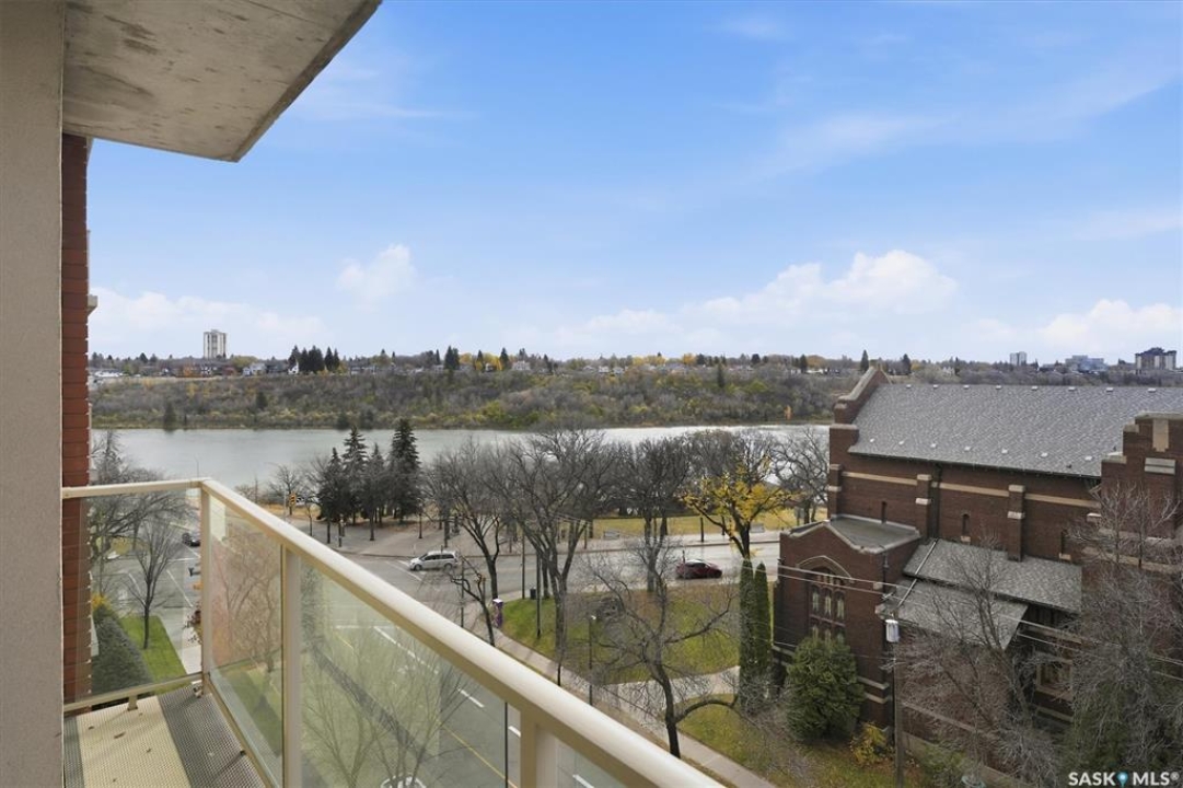 Experience riverfront living in this IMPECCABLE southeast-facing LUX condo in the heart of downtown Saskatoon. Offering 1,155 sq ft, this 2-bedroom, 2-bath unit features an UPDATED bright, open floor plan designed to take full advantage of the natural light and breathtaking river views. The kitchen is beautifully finished and underwent recent updates with modern cabinetry, newer gleaming quartz countertops, tile backsplash, and stainless steel appliances, and a peninsula opening to a spacious open concept living and dining area with oversize windows spanning the entire space, plus a large balcony that captures river and city views including the Meewasin park and the Cathedral's tower! The entire space boasts newer (high end, recently installed) engineered hardwood flooring. Two spacious bedrooms, 2 full baths, and a primary walk-in closet, plus an in-suite storage/laundry room complete this lovely floor plan. Enjoy relaxing or entertaining on the private balcony with a natural gas BBQ hookup, overlooking not only the river, but also The Bessborough and Broadway Bridge. This unit includes 1 heated underground parking stall and a heated storage unit for added convenience. The building offers fantastic amenities, including a fitness room, a meeting room, and two guest suites. Ideally located along the Meewasin River Trail and park and steps from downtown restaurants, shops, and entertainment- the best of what our city offers!!
