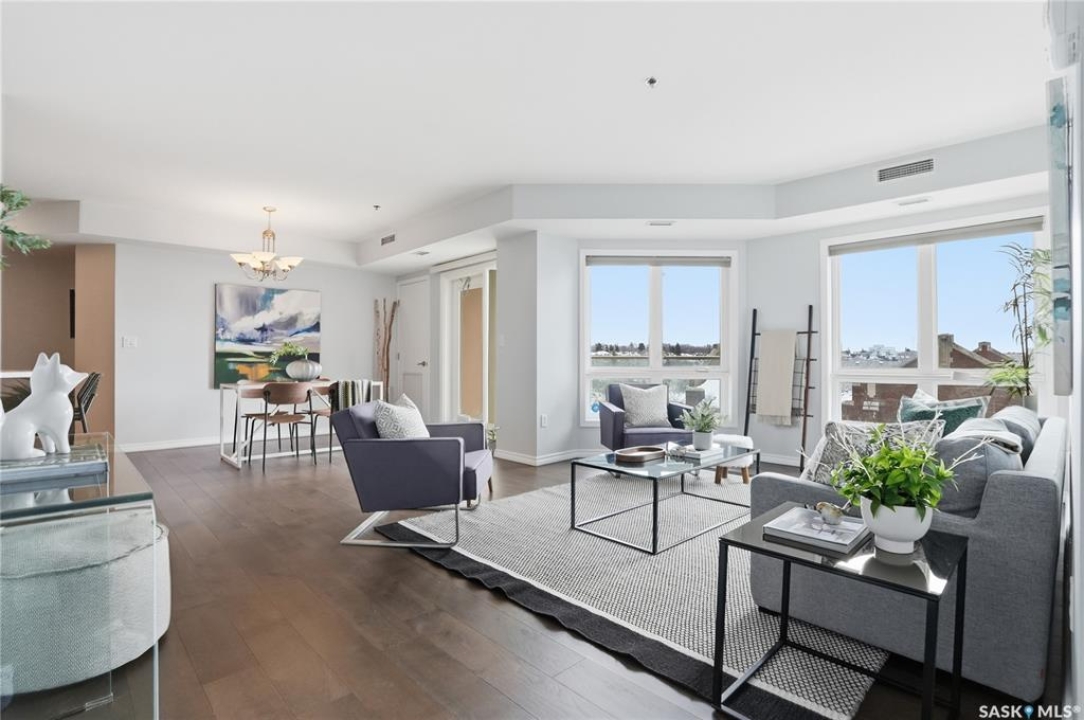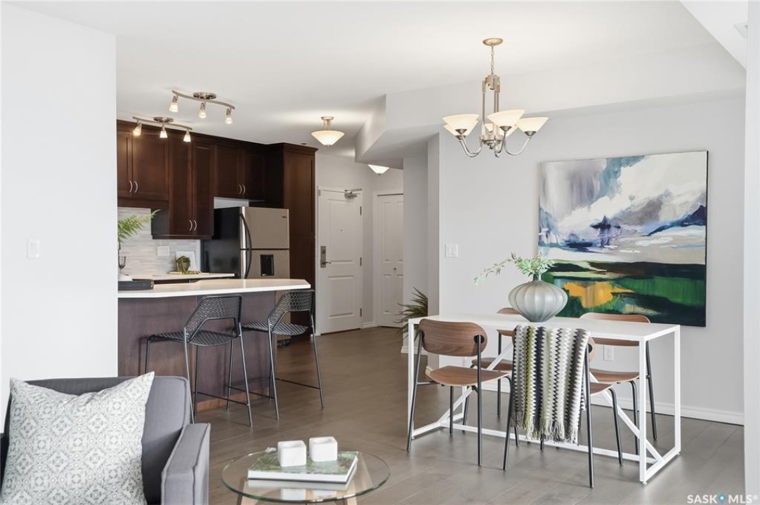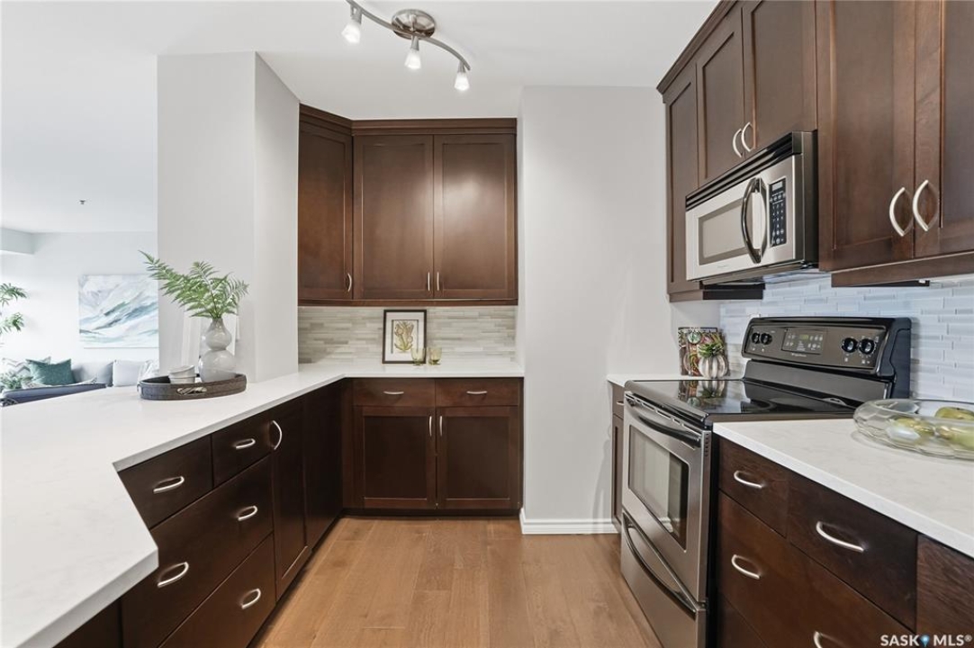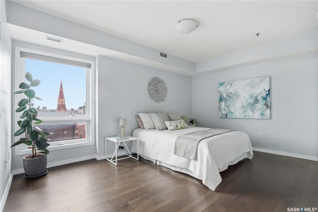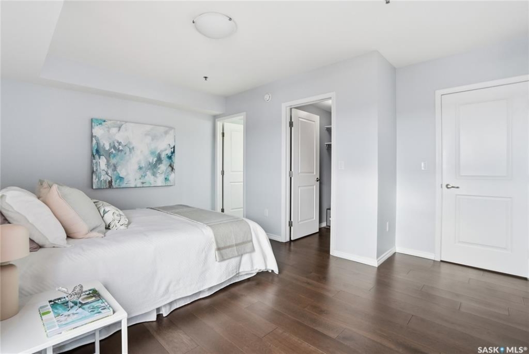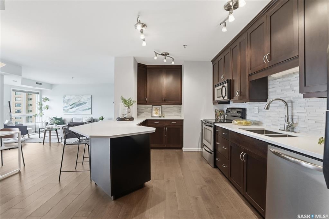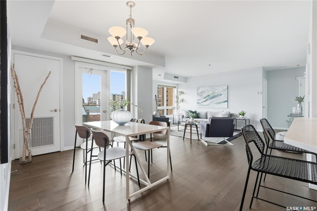 Experience riverfront living in this IMPECCABLE southeast-facing LUX condo in the heart of downtown Saskatoon. Offering 1,155 sq ft, this 2-bedroom, 2-bath unit features an UPDATED bright, open floor plan designed to take full advantage of the natural light and breathtaking river views. The kitchen is beautifully finished and underwent recent updates with modern cabinetry, newer gleaming quartz countertops, tile backsplash, and stainless steel appliances, and a peninsula opening to a spacious open concept living and dining area with oversize windows spanning the entire space, plus a large balcony that captures river and city views including the Meewasin park and the Cathedral's tower! The entire space boasts newer (high end, recently installed) engineered hardwood flooring. Two spacious bedrooms, 2 full baths, and a primary walk-in closet, plus an in-suite storage/laundry room complete this lovely floor plan. Enjoy relaxing or entertaining on the private balcony with a natural gas BBQ hookup, overlooking not only the river, but also The Bessborough and Broadway Bridge. This unit includes 1 heated underground parking stall and a heated storage unit for added convenience. The building offers fantastic amenities, including a fitness room, a meeting room, and two guest suites. Ideally located along the Meewasin River Trail and park and steps from downtown restaurants, shops, and entertainment- the best of what our city offers!!