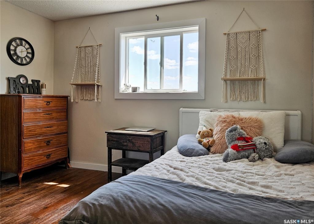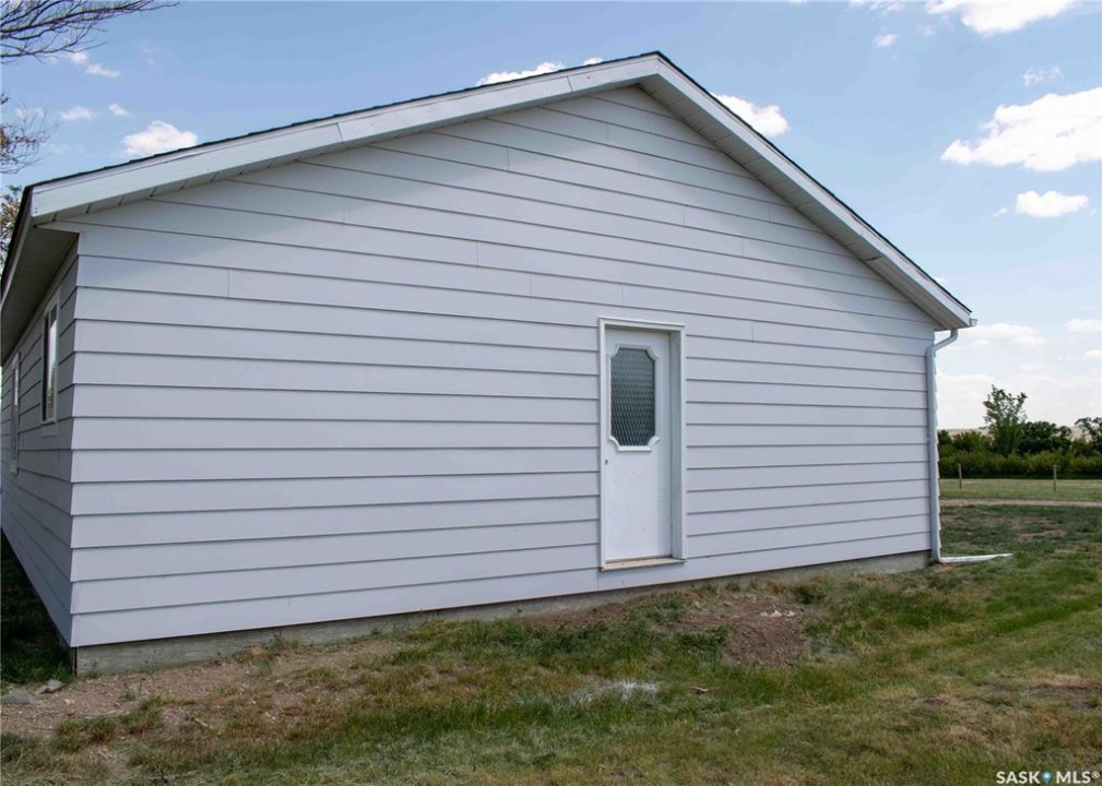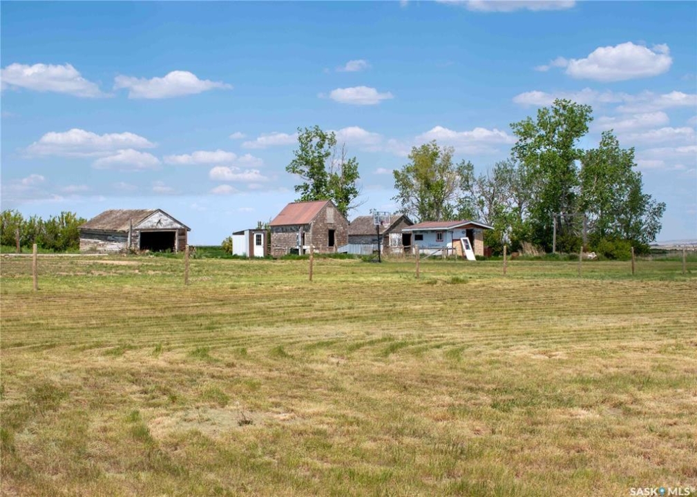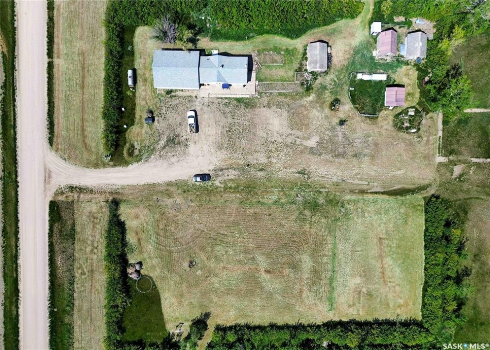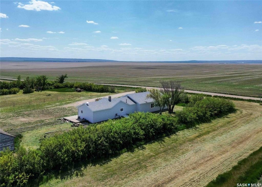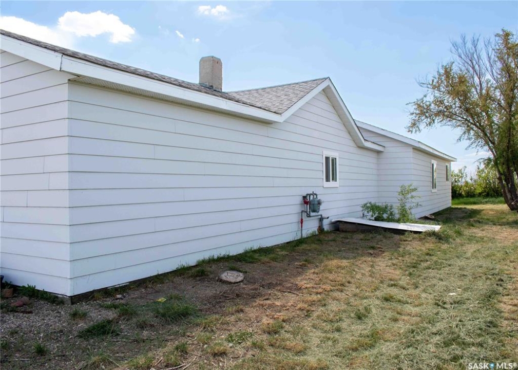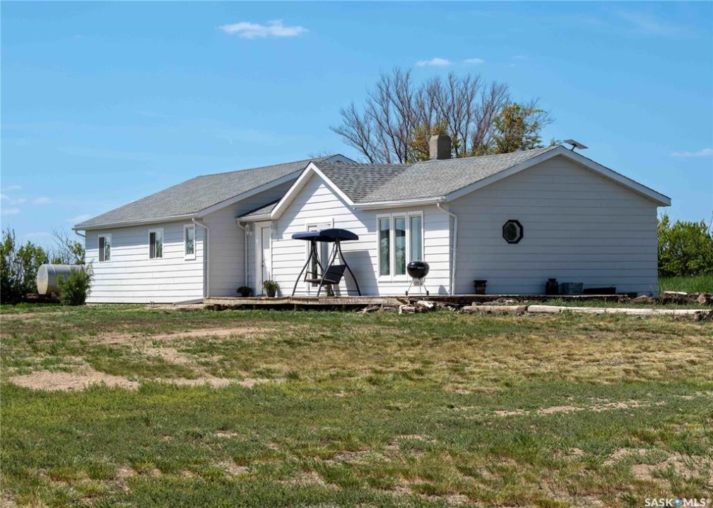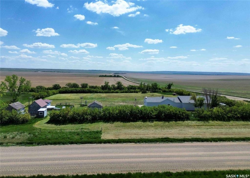 If your family is running out of room, this acreage could be exactly what you've been searching for. Set on 4.86 acres, this property offers the rare convenience of municipal water paired with the comfort of a spacious 1,864 sq ft bungalow. Step inside to a generous entryway with plenty of room for boots, coats, and everyday gear, complete with a handy built in bench. Just ahead, the main floor laundry provides exceptional storage with an entire wall of cabinetry and ample counter space. At the heart of the home, the country kitchen and dining area are bathed in southern sunlight thanks to a brand new garden door. The adjoining living room shares this warm exposure, featuring a full wall of windows that brighten the entire space. A long hallway leads to a refreshed four piece bathroom, updated with new drywall, paint, toilet, vanities, and mirrors. There's generous room for linens or even a baby change station. The main floor also includes a dedicated home office and four oversized bedrooms, offering flexibility for family, guests, or hobbies. The home sits on a partial concrete basement that houses all the utilities, including the hot water tank, natural gas furnace, and municipal water storage and pressure system. A direct-entry stairwell from the backyard to the basement is in place and ready to be reactivated. Outdoors, the yard is beautifully treed and naturally sheltered. Several small sheds provide options for garden tools, chickens, goats, or other small livestock. With nearly five acres to work with, there's abundant space to add a garden, garage, workshop, or even a pool. Recent updates include fresh paint inside and out, new windows, baseboards, interior and exterior lighting, door and window casings, eavestroughs, and a new garden door—making this home move in ready