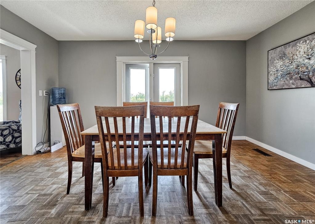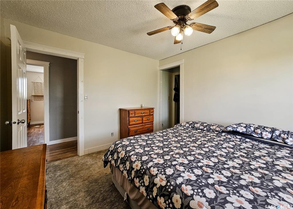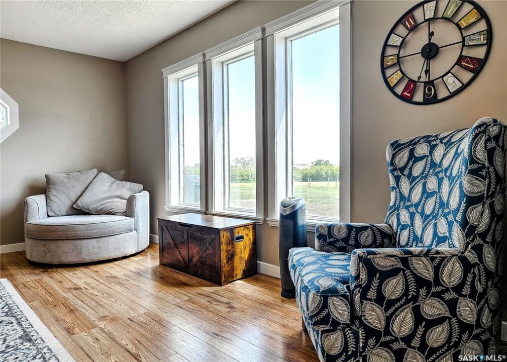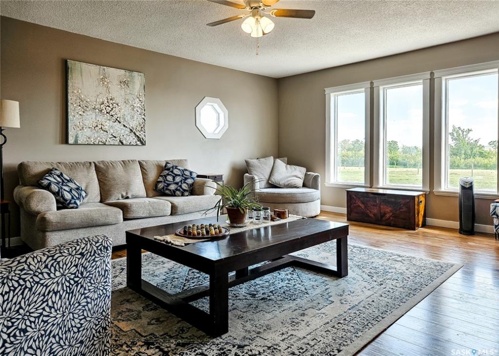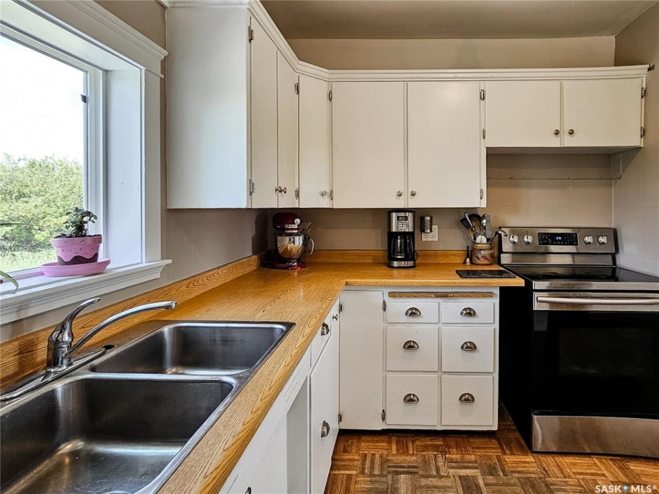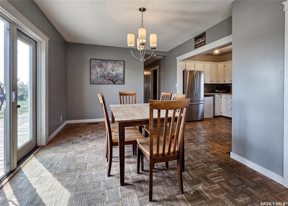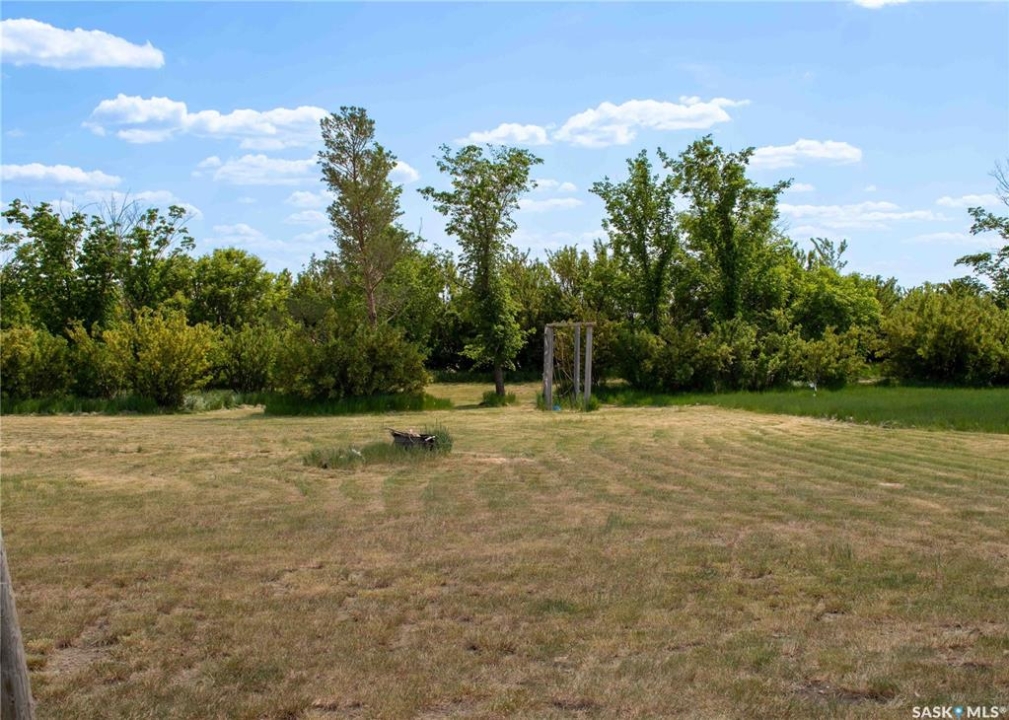 If your family is running out of room, this acreage could be exactly what you've been searching for. Set on 4.86 acres, this property offers the rare convenience of municipal water paired with the comfort of a spacious 1,864 sq ft bungalow. Step inside to a generous entryway with plenty of room for boots, coats, and everyday gear, complete with a handy built in bench. Just ahead, the main floor laundry provides exceptional storage with an entire wall of cabinetry and ample counter space. At the heart of the home, the country kitchen and dining area are bathed in southern sunlight thanks to a brand new garden door. The adjoining living room shares this warm exposure, featuring a full wall of windows that brighten the entire space. A long hallway leads to a refreshed four piece bathroom, updated with new drywall, paint, toilet, vanities, and mirrors. There's generous room for linens or even a baby change station. The main floor also includes a dedicated home office and four oversized bedrooms, offering flexibility for family, guests, or hobbies. The home sits on a partial concrete basement that houses all the utilities, including the hot water tank, natural gas furnace, and municipal water storage and pressure system. A direct-entry stairwell from the backyard to the basement is in place and ready to be reactivated. Outdoors, the yard is beautifully treed and naturally sheltered. Several small sheds provide options for garden tools, chickens, goats, or other small livestock. With nearly five acres to work with, there's abundant space to add a garden, garage, workshop, or even a pool. Recent updates include fresh paint inside and out, new windows, baseboards, interior and exterior lighting, door and window casings, eavestroughs, and a new garden door—making this home move in ready