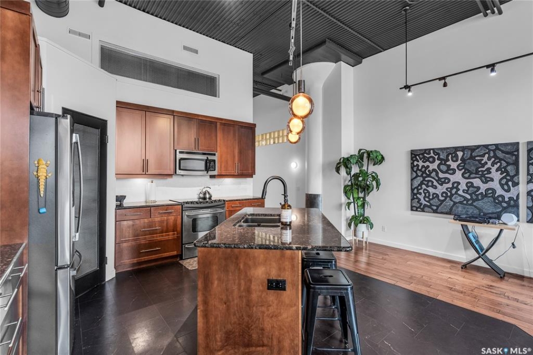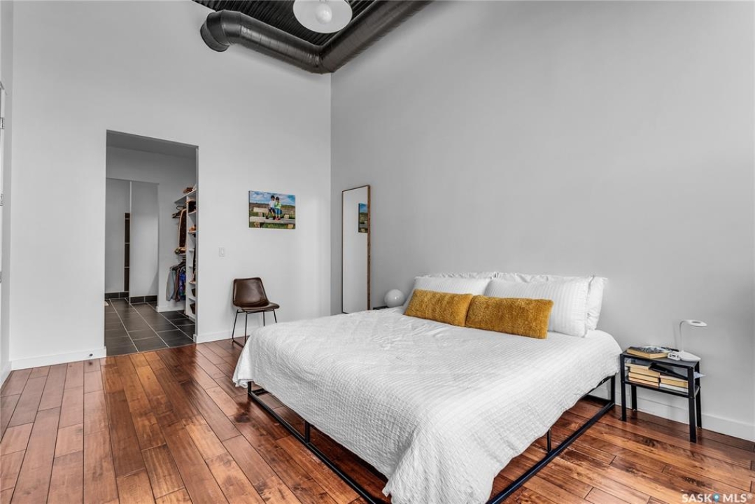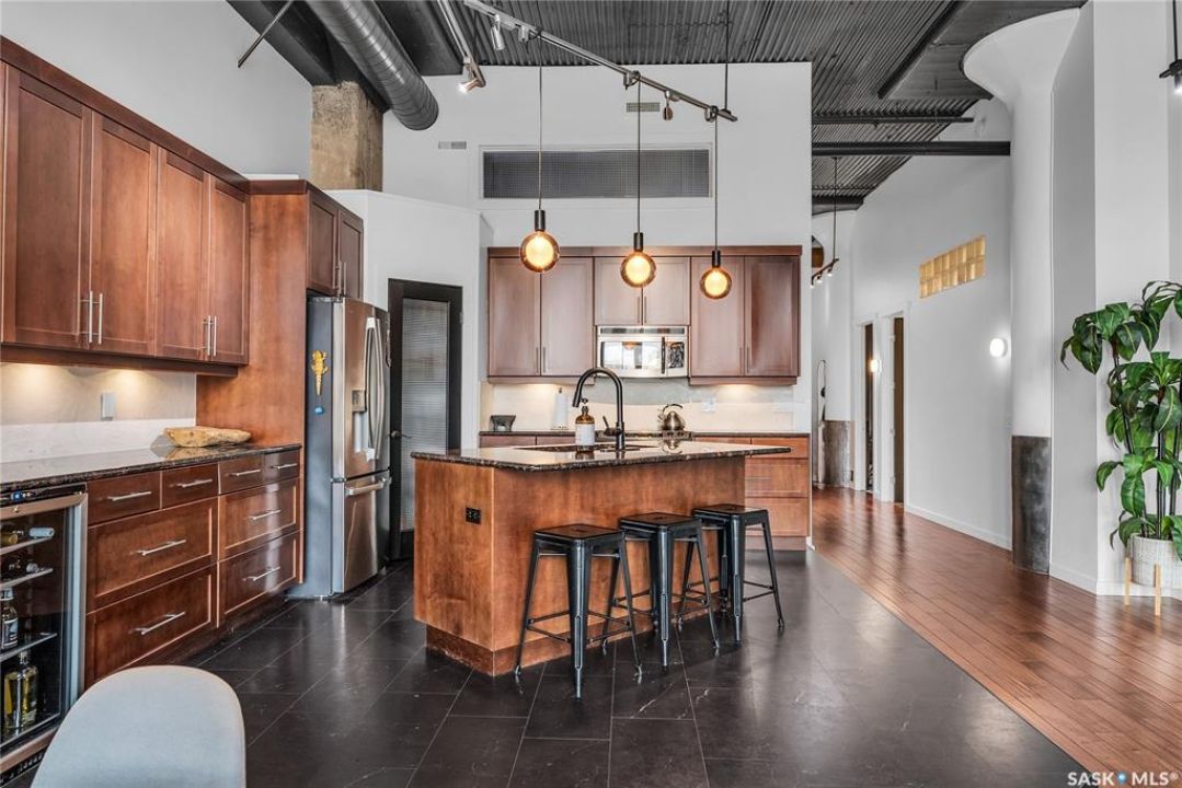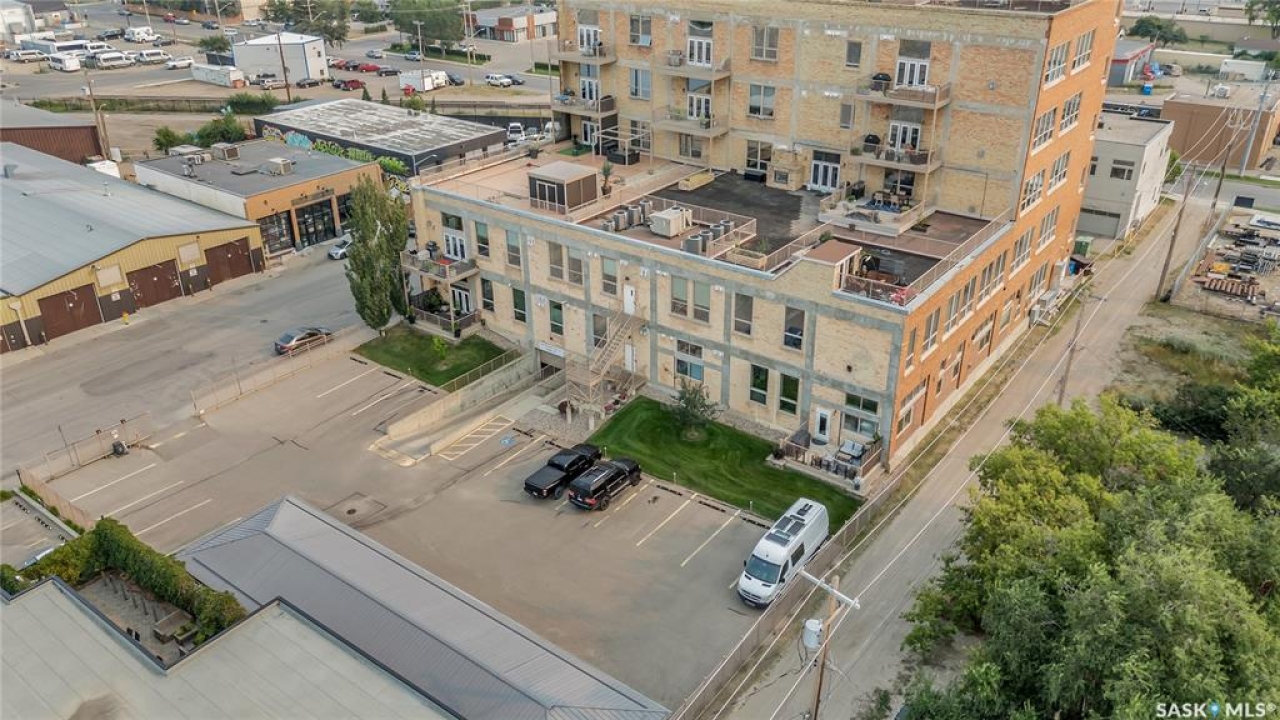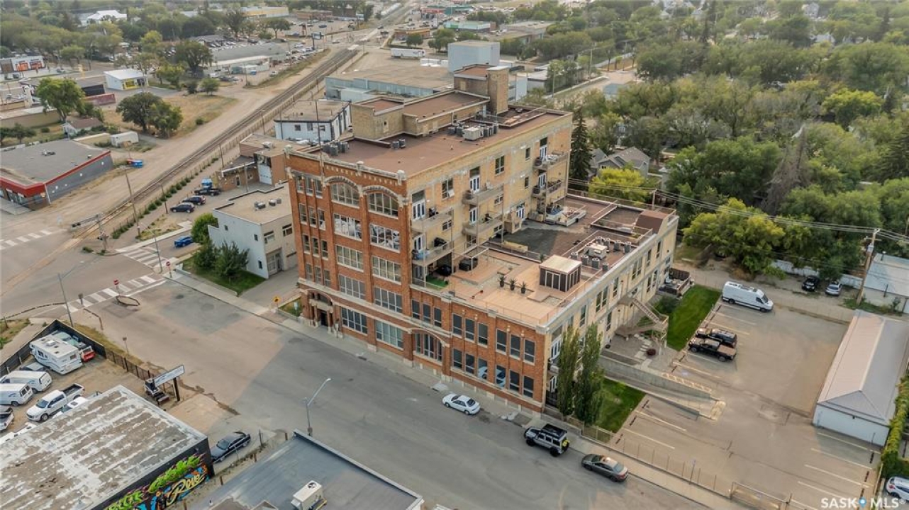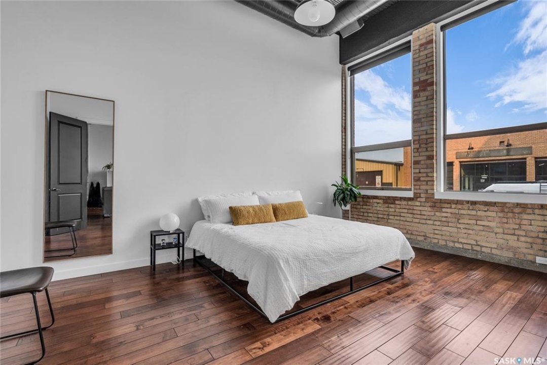 Welcome home to 211 Ave D North unit 105. This executive condo delivers an impressive space with over 1900sqft and 14' ceilings. Industrial design and natural textures. The exposed concrete, brick, and steel are softened with the warm colors and natural light. The front entry is set for welcoming you in with an oversized closet and plenty of space to kick off your shoes. Laundry/Utility is found adjacent with more room for storage here and the following leads you to a large secondary bathroom that boasts a shower and oversized soaker tub. The first bedroom is found next with a spacious 13' x 17' dimension & walk-in closet. The kitchen provides an anchor to the main room with an island looking out. Entertain with ease! From prep to serving - there is a generous layout of high-end cabinetry, counter space, and large pantry. East facing windows tease the city skyline and bring in plenty of natural light here. Let your imagination flow with layout placement; dining, living, work or play. The primary retreat is separated from here and shows an oversized bedroom sharing the exterior windows. A walk-in closet has two sides and leads to a customized 3 piece ensuite. There is one above-ground parking stall included that you will find within the gated area and often other options available for rent. As well there is a gym space, and the roof top terrace with lounging chairs, a BBQ included, and incredible views!